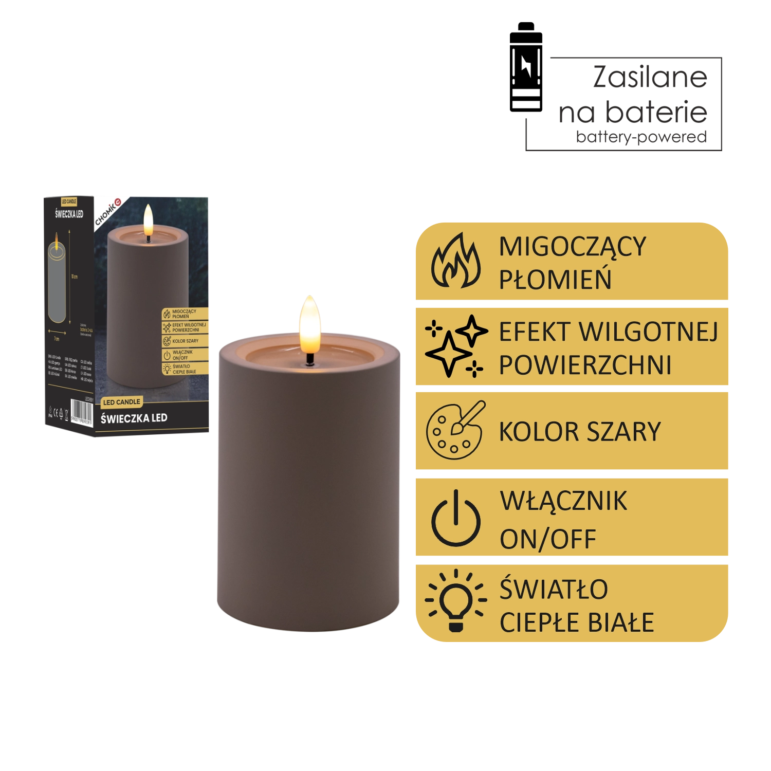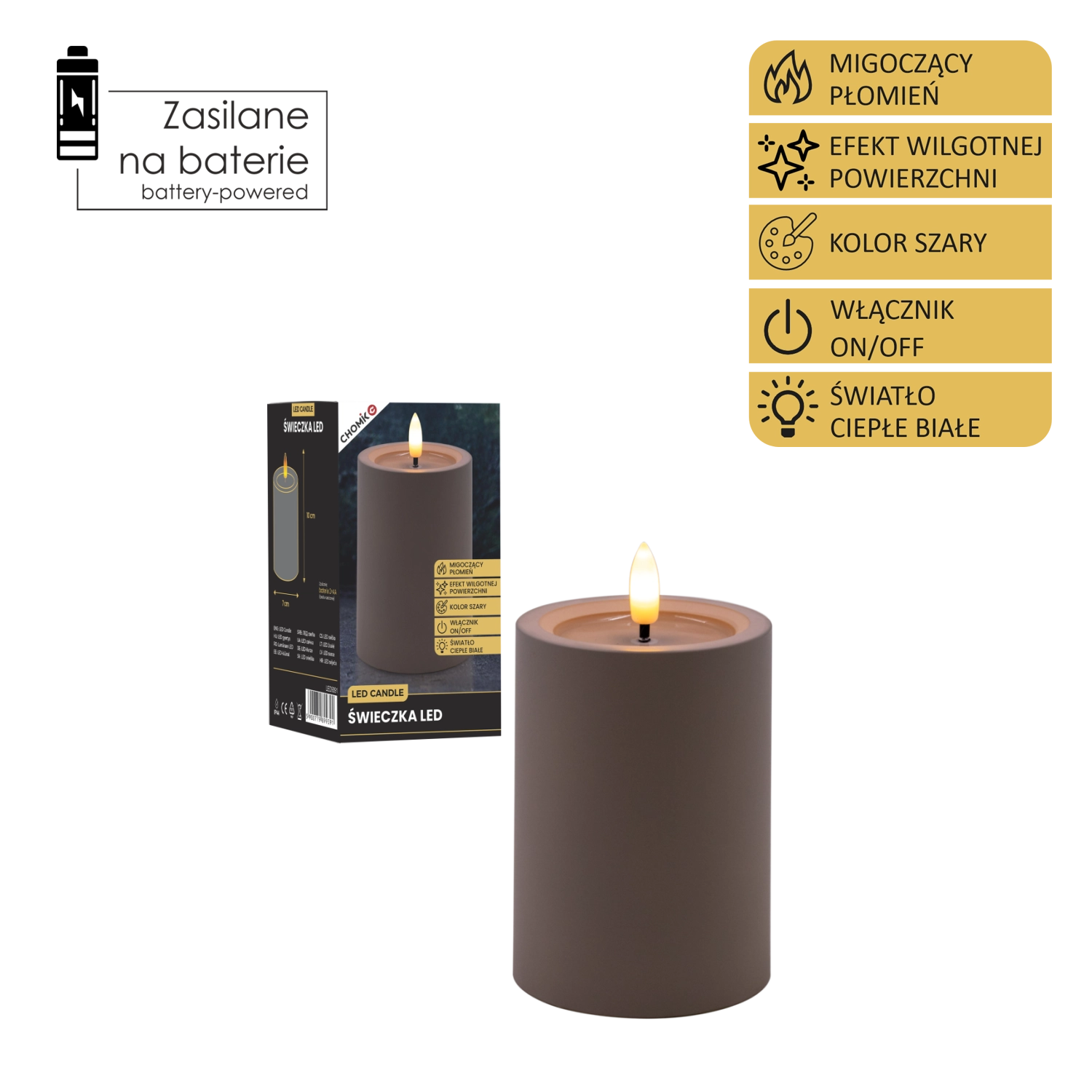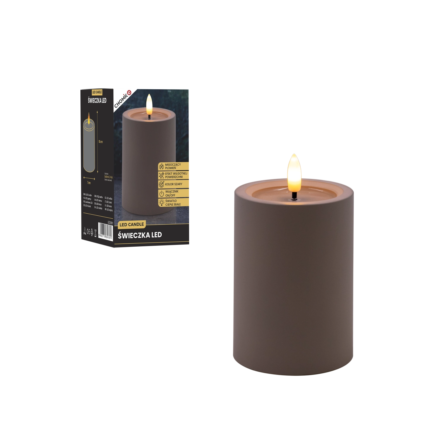 Stilska siva LED sveča z merami 7 × 10 cm ustvari prijetno vzdušje zahvaljujoč toplemu utripajočemu plamenu in realističnemu učinku vlažne zgornje plasti. Odlično se poda v dnevno sobo, spalnico in na slavnostno mizo. Varna in brez dima, napajana z 2× AA baterijama (nista priloženi) z enostavno funkcijo On/Off.