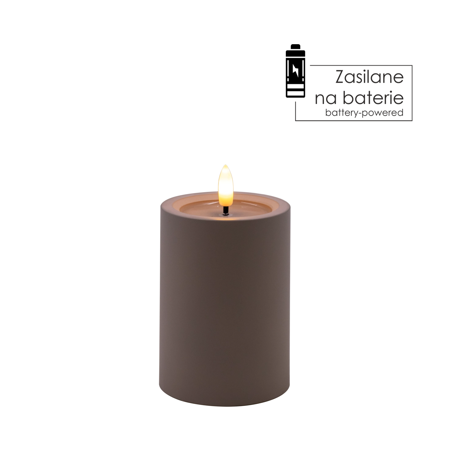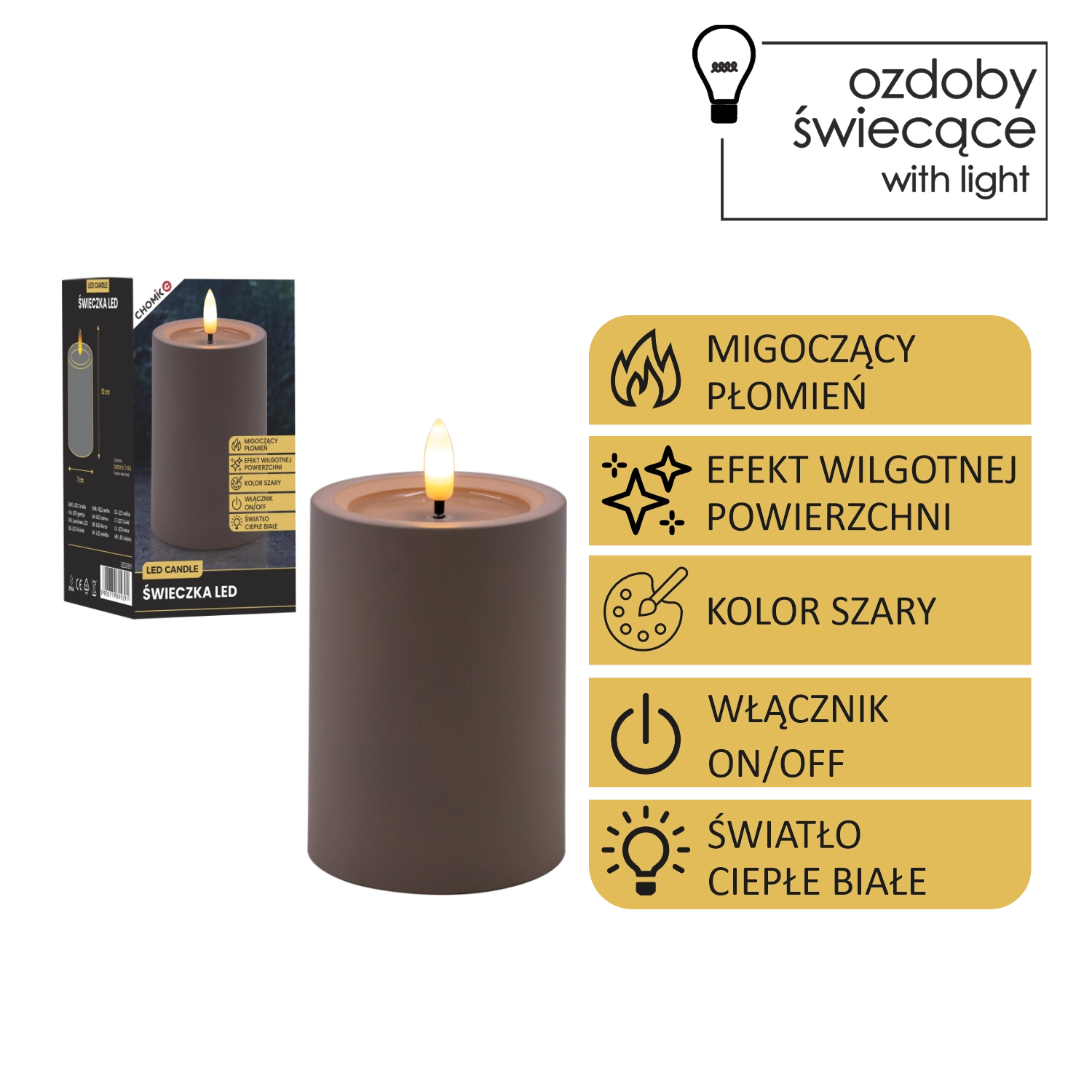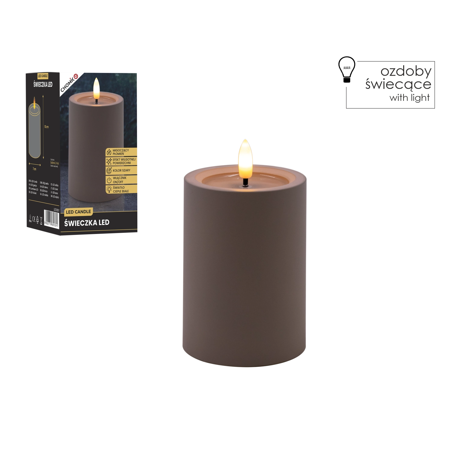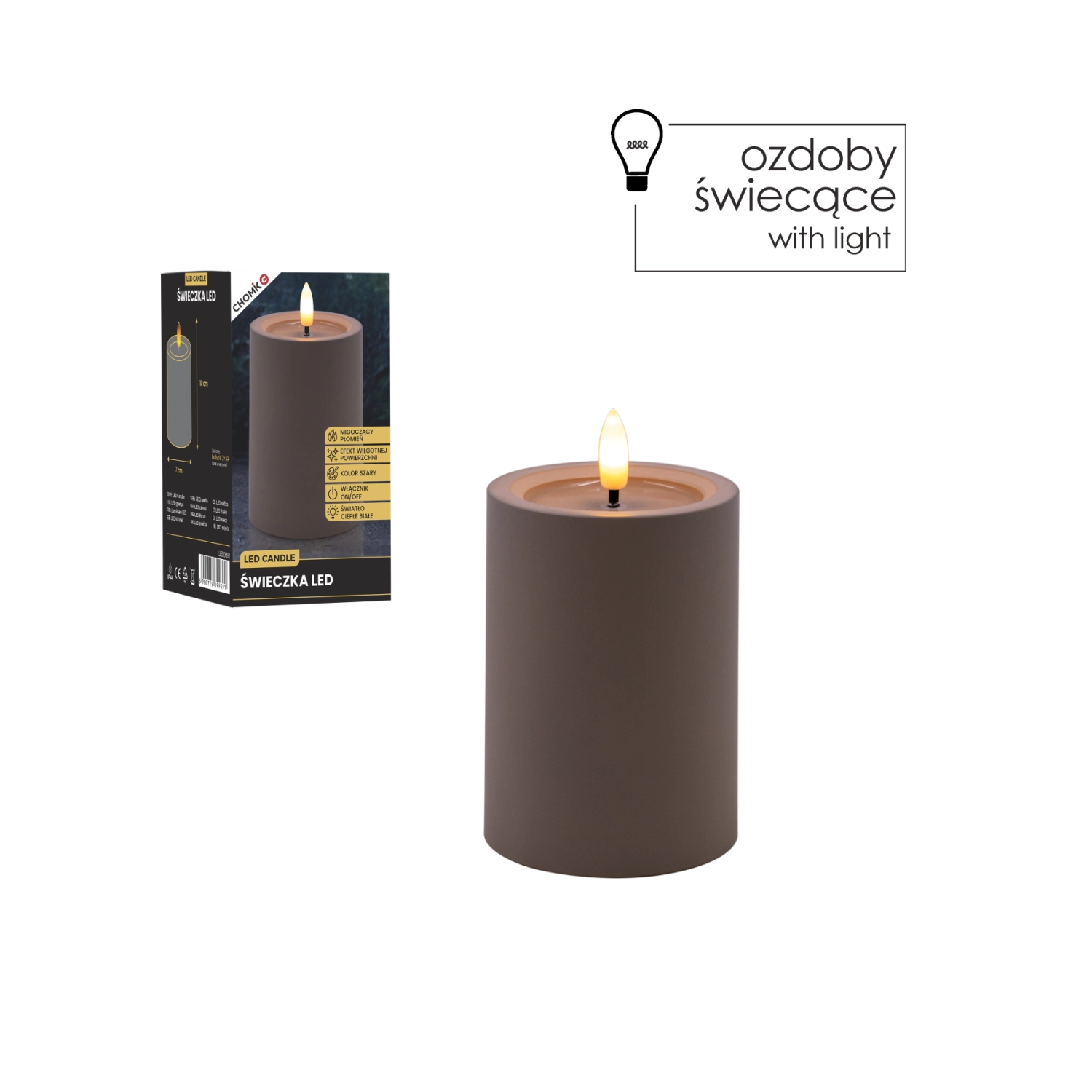 Stilska siva LED sveča z merami 7 × 10 cm ustvari prijetno vzdušje zahvaljujoč toplemu utripajočemu plamenu in realističnemu učinku vlažne zgornje plasti. Odlično se poda v dnevno sobo, spalnico in na slavnostno mizo. Varna in brez dima, napajana z 2× AA baterijama (nista priloženi) z enostavno funkcijo On/Off.