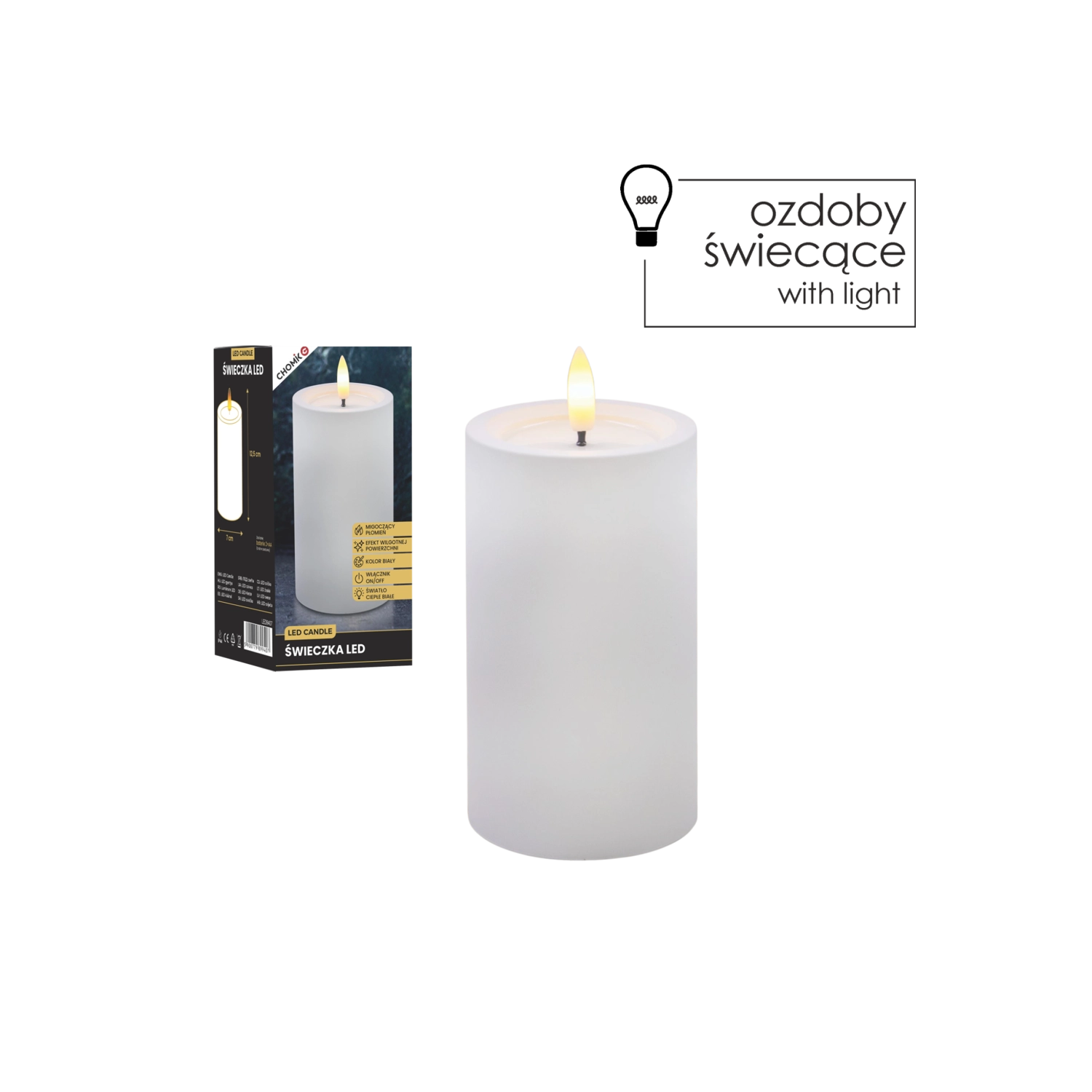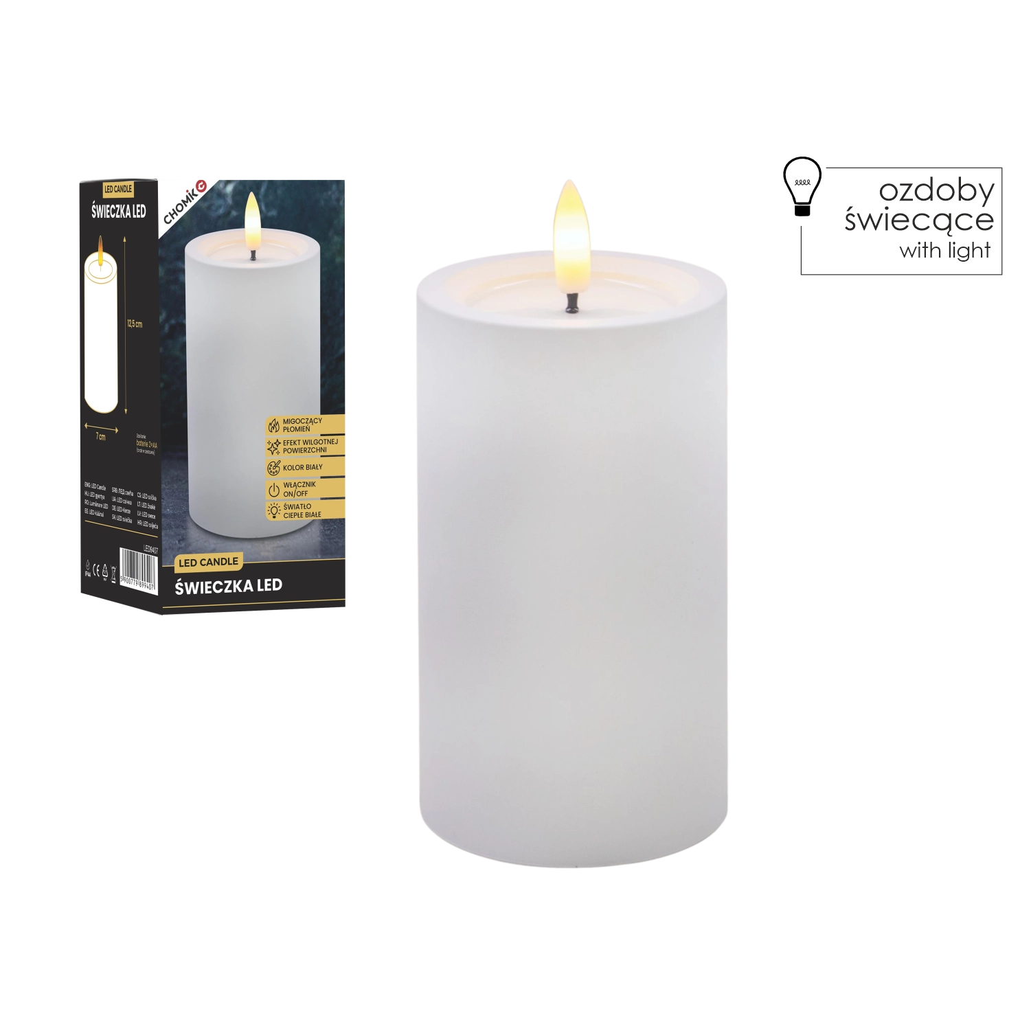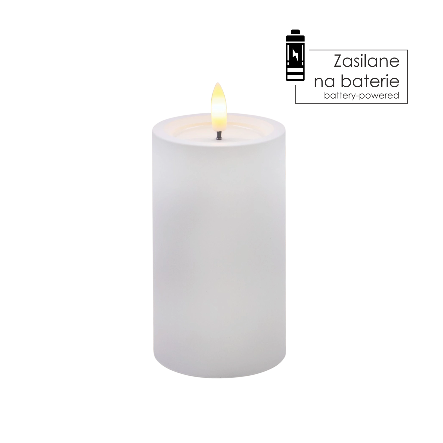 Ta realistično izdelana LED sveča v beli barvi prinaša toplo belo, prijetno svetlobo z verodostojnim učinkom utripajočega plamena. Zahvaljujoč posebni površini z učinkom vlažnega zgornjega roba deluje kot prava sveča iz voska, vendar brez kapljanja, dima in tveganja odprtega ognja.