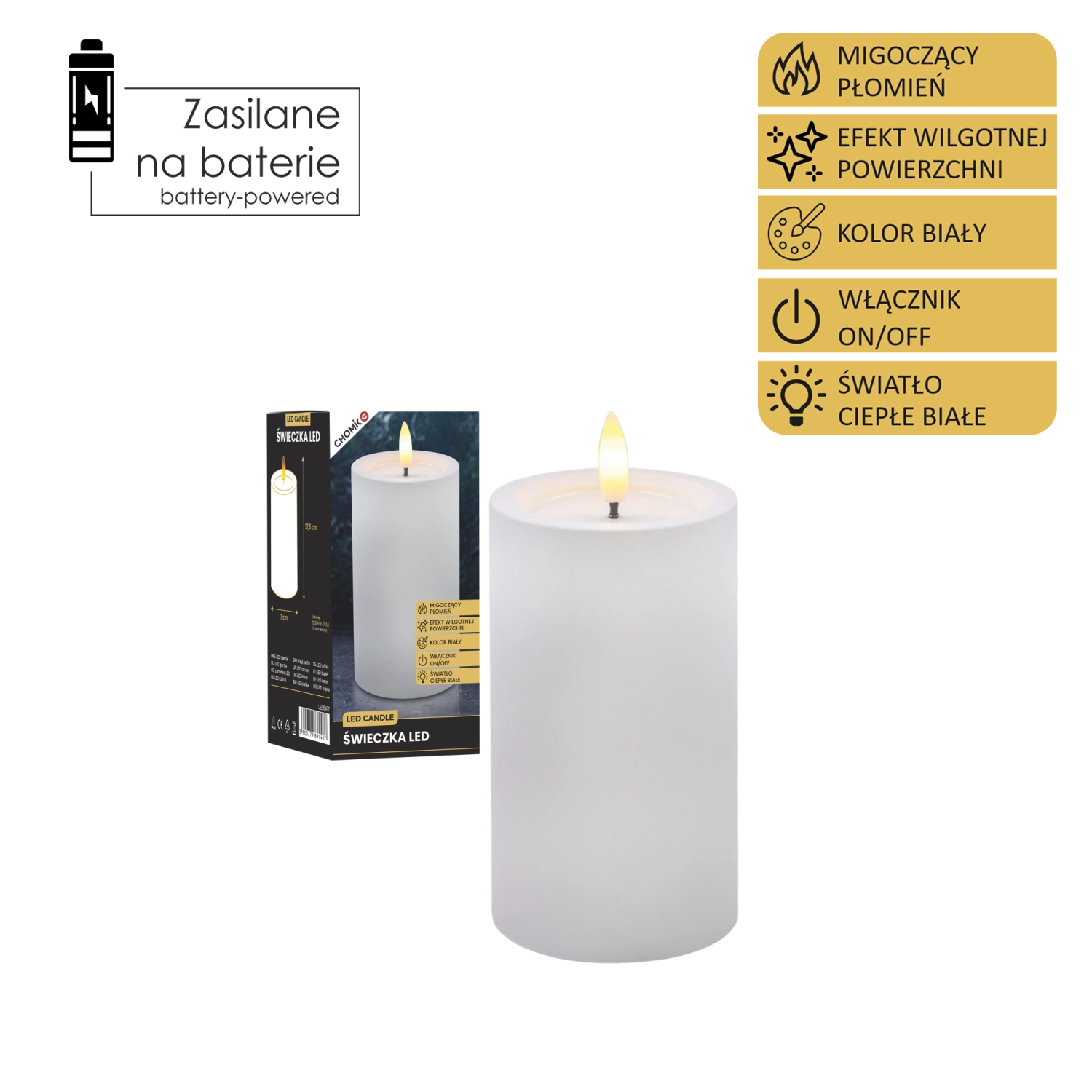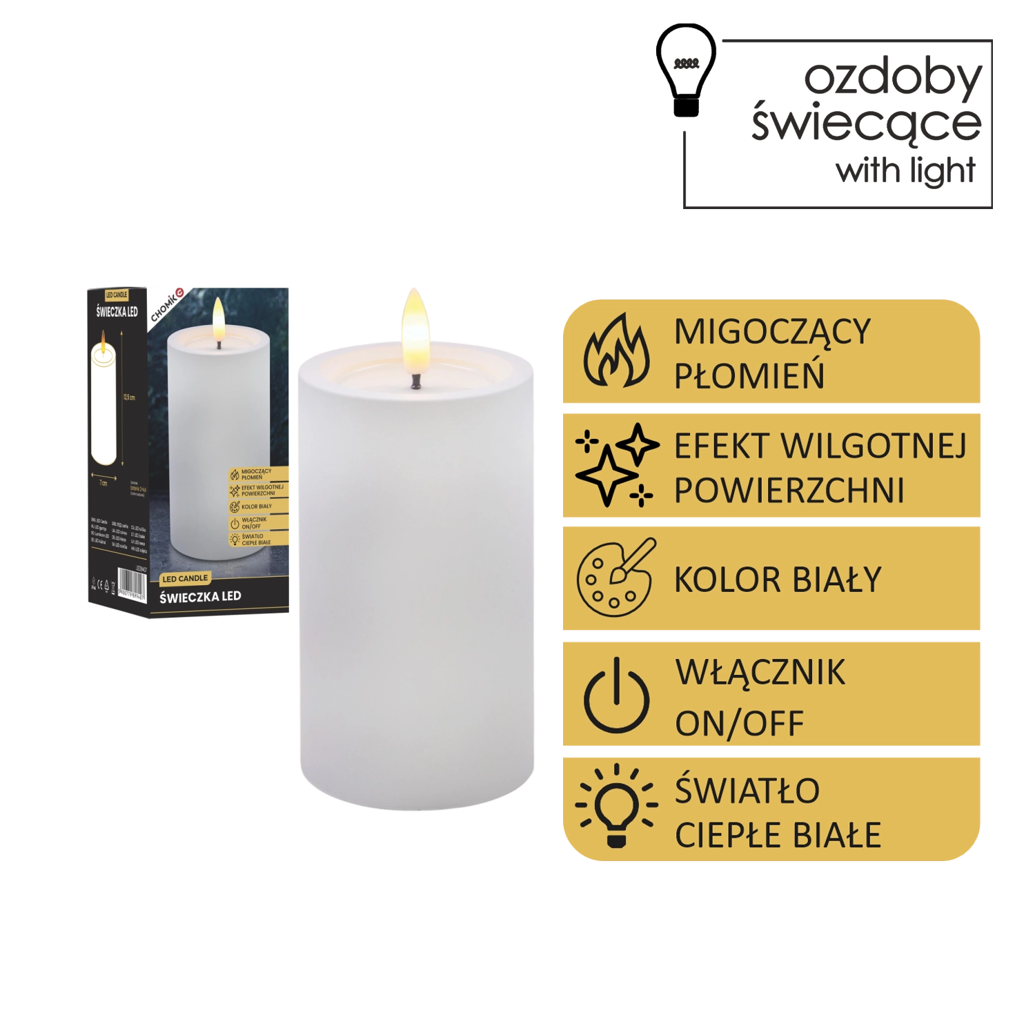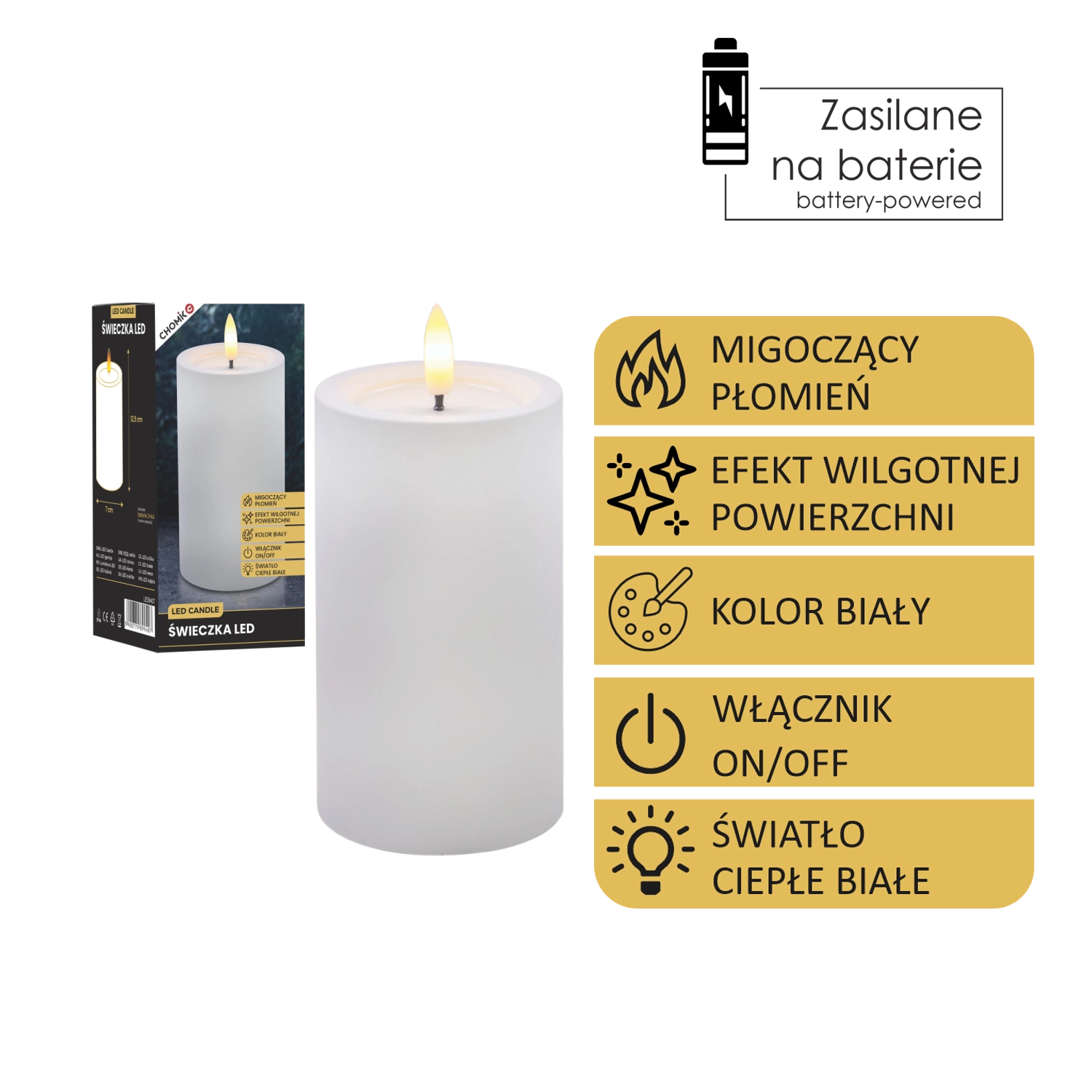 Ta realistično izdelana LED sveča v beli barvi prinaša toplo belo, prijetno svetlobo z verodostojnim učinkom utripajočega plamena. Zahvaljujoč posebni površini z učinkom vlažnega zgornjega roba deluje kot prava sveča iz voska, vendar brez kapljanja, dima in tveganja odprtega ognja.