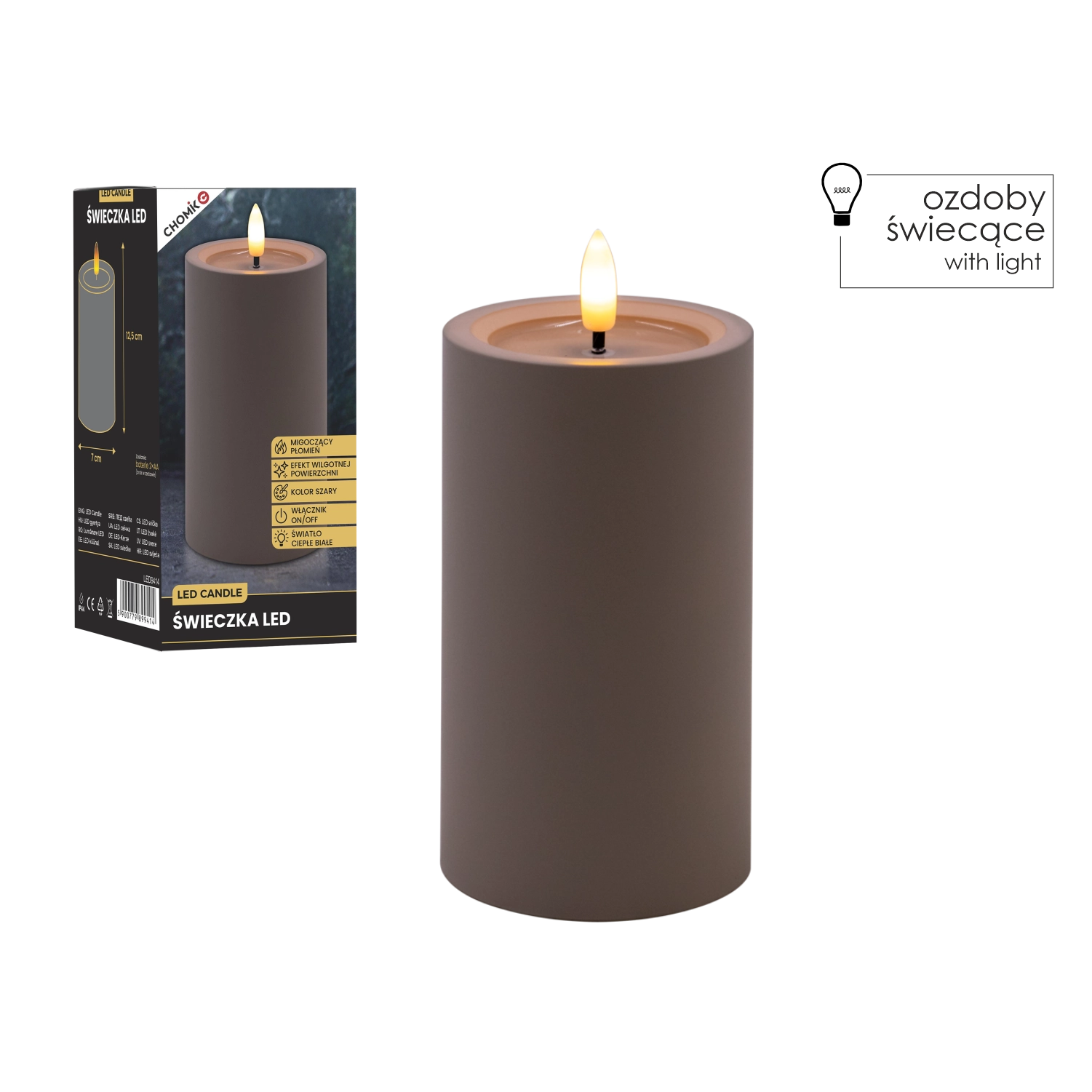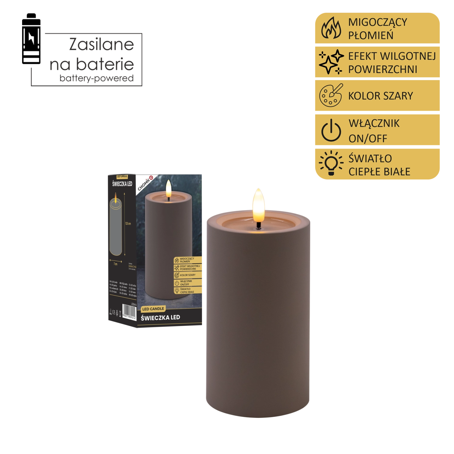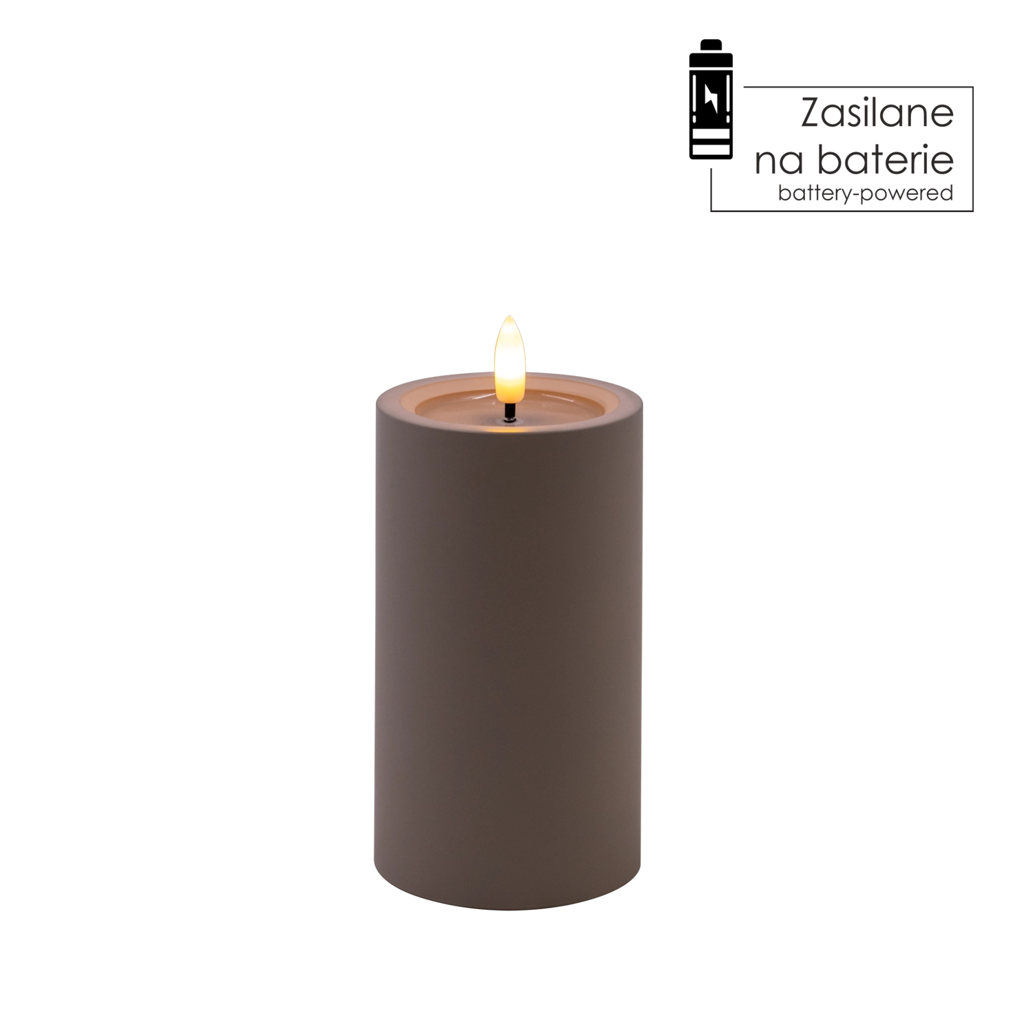 Elegantna siva LED sveča z realističnim, migetajočim plamenom v toplo beli barvi in učinkom vlažnega zgornjega roba za naraven videz. Odlično se poda v notranje prostore, varna alternativa klasični sveči, napajana z 2× AA baterijama (nista priloženi).