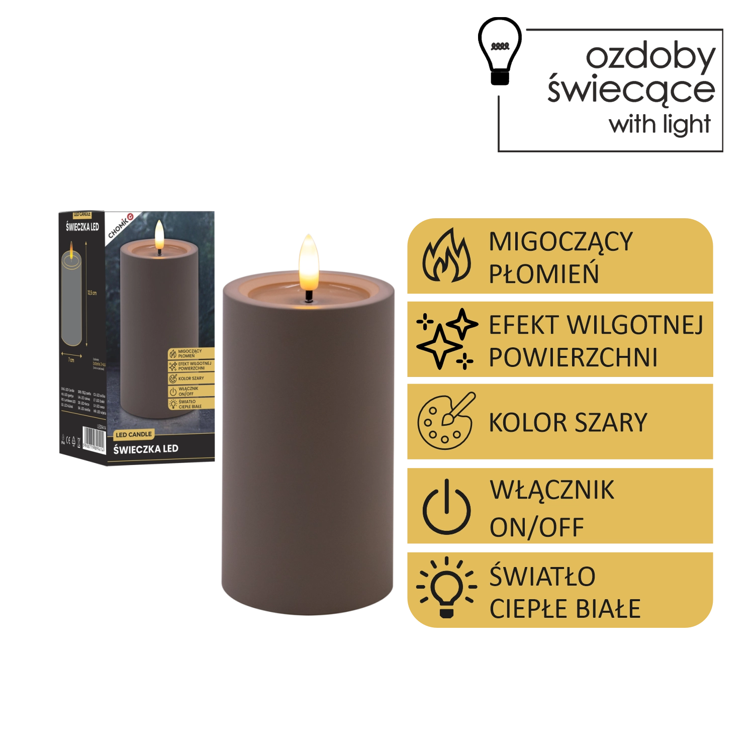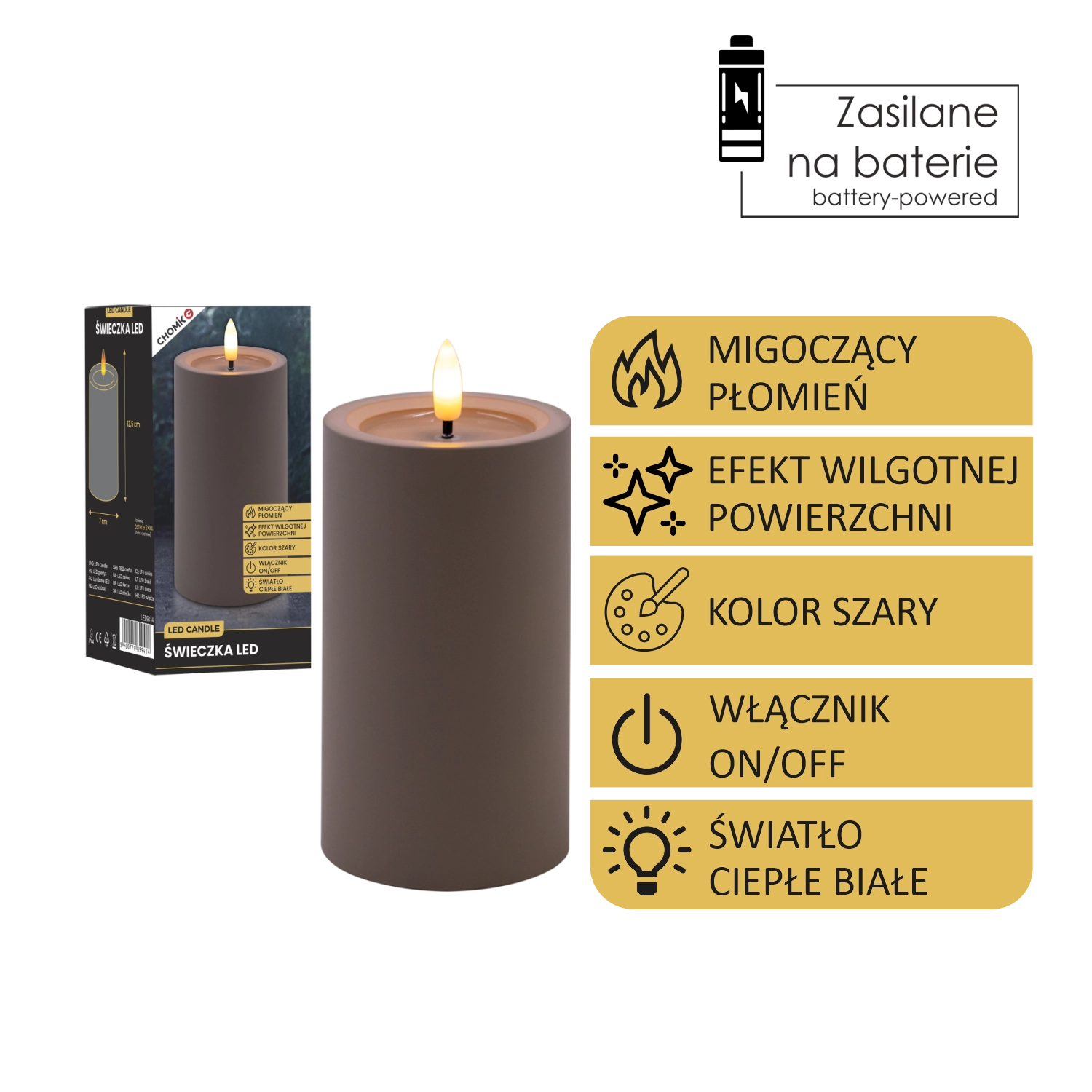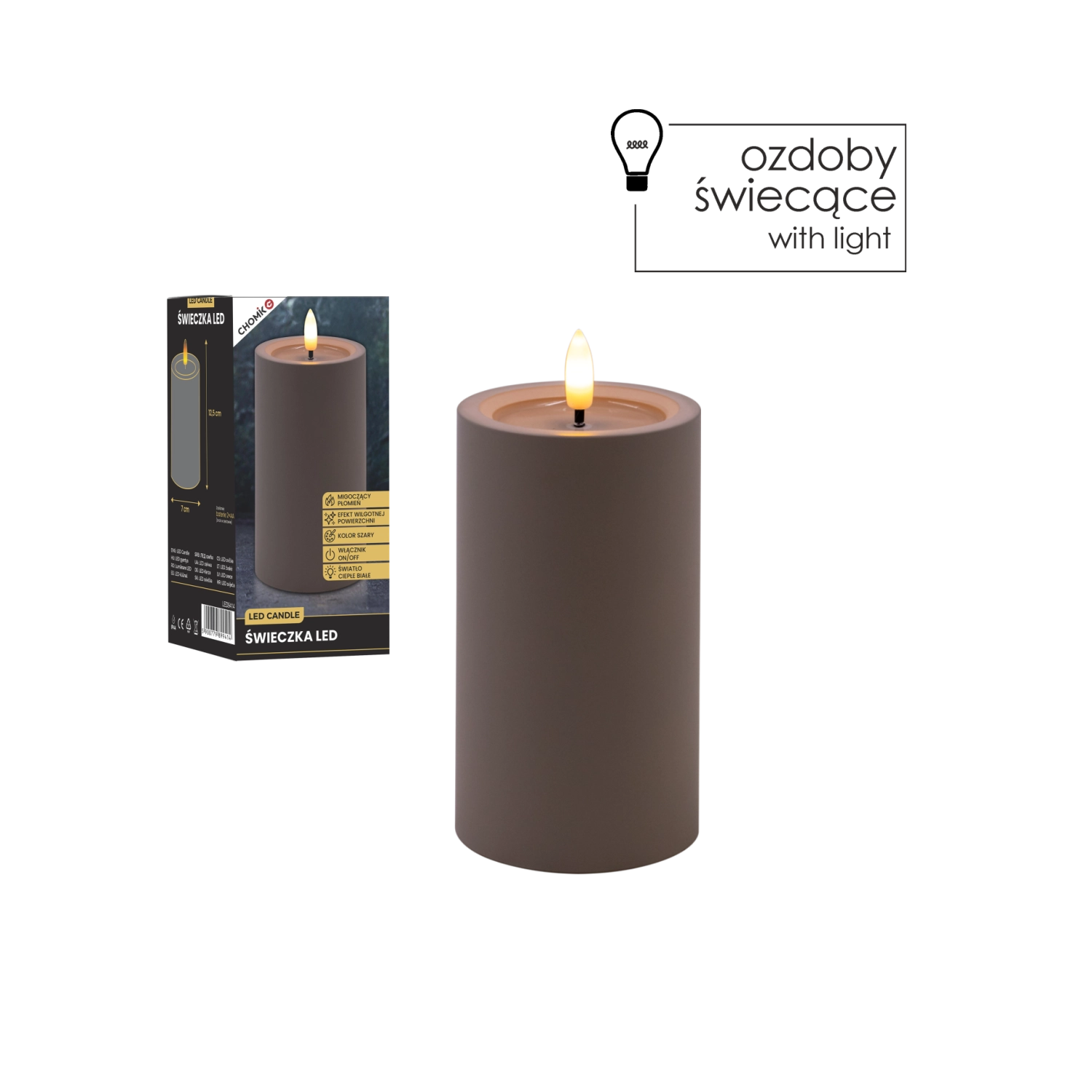 - Realističen videz: migetajoč plamen in učinek vlažnega zgornjega roba