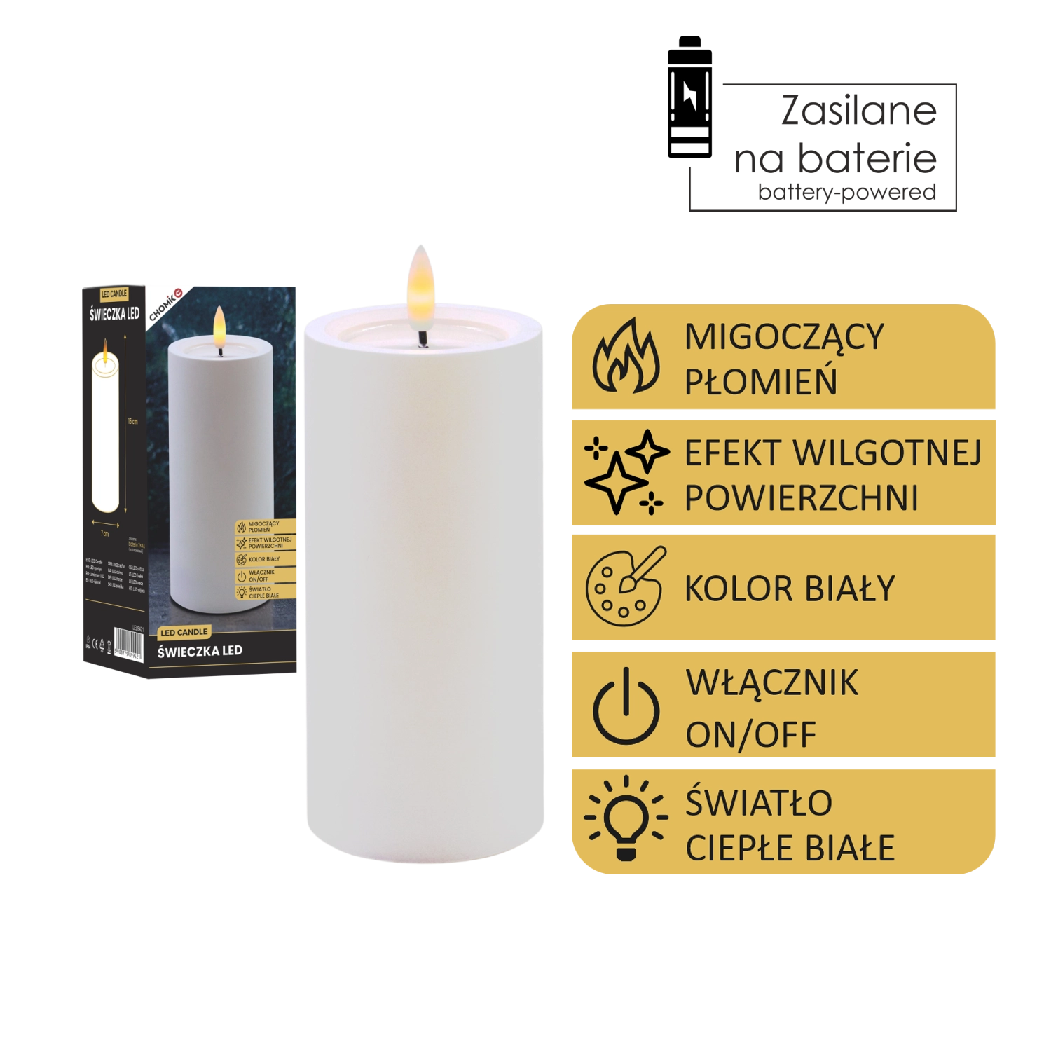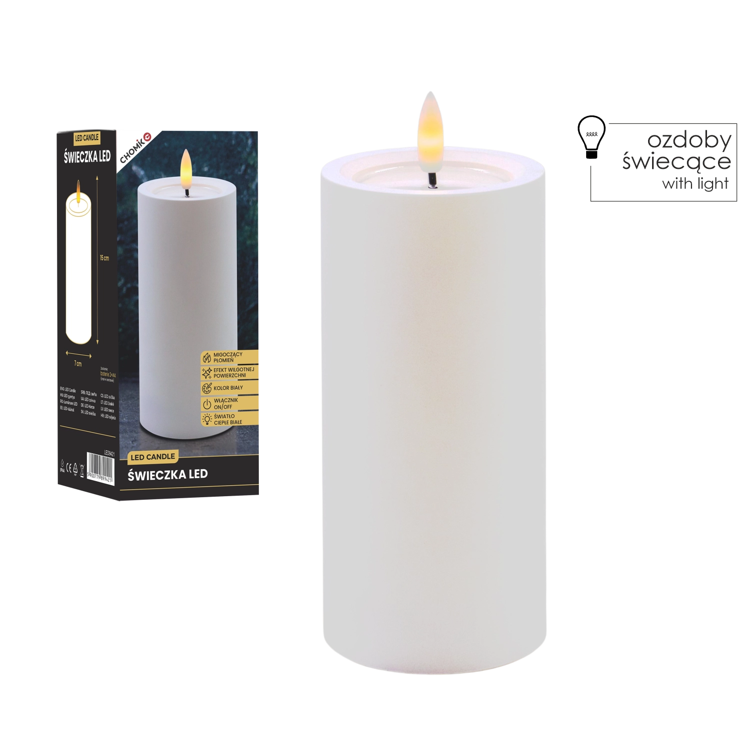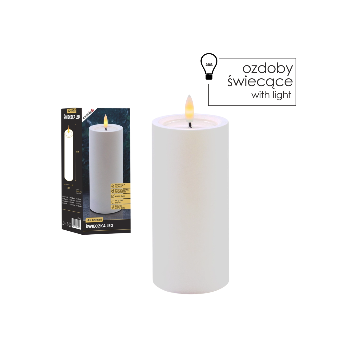 Elegantna LED sveča v beli barvi z merami 7 × 15 cm prinaša realističen utripajoč plamen v toplo beli ter izrazit učinek mokrega zgornjega roba. Odlično dopolni notranje dekoracije brez dima in nereda.