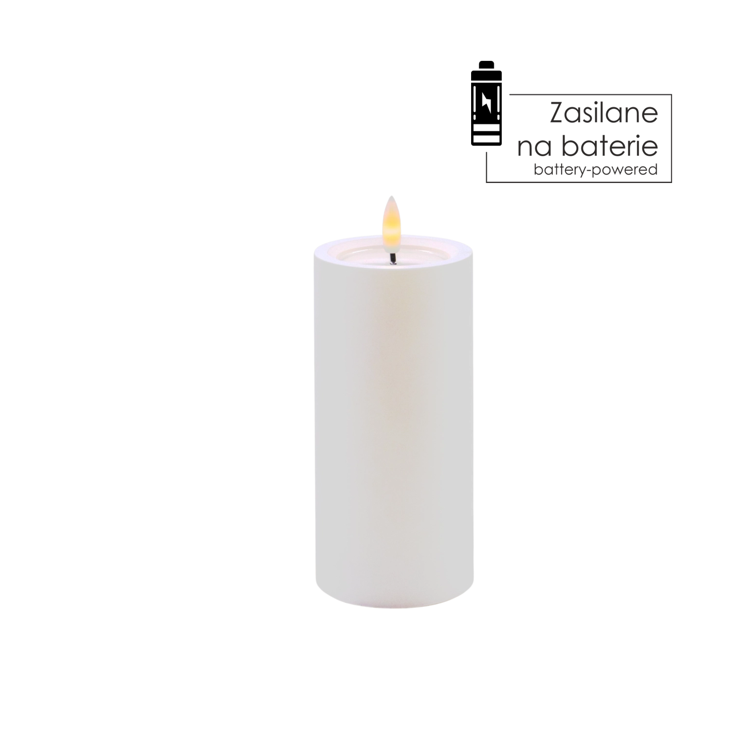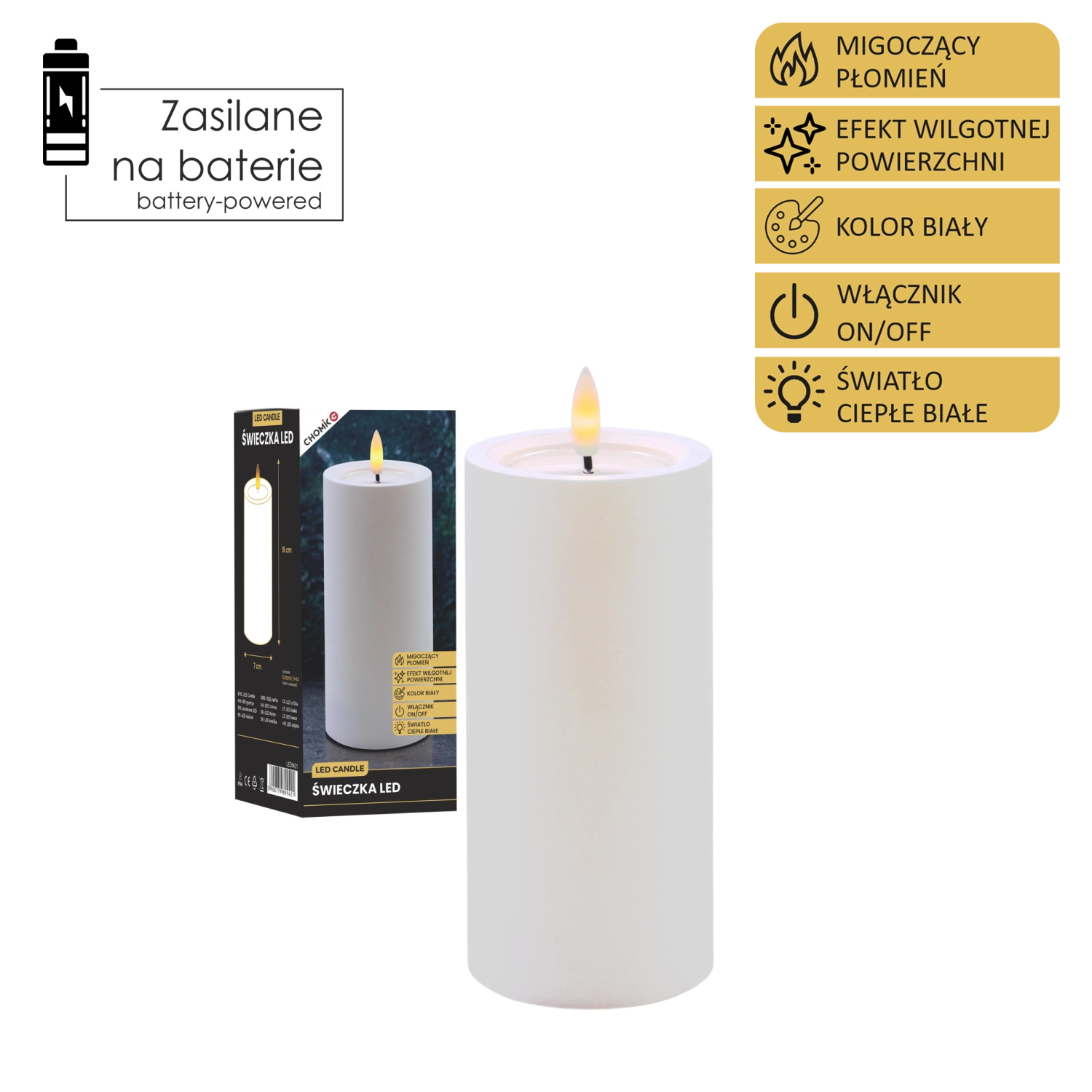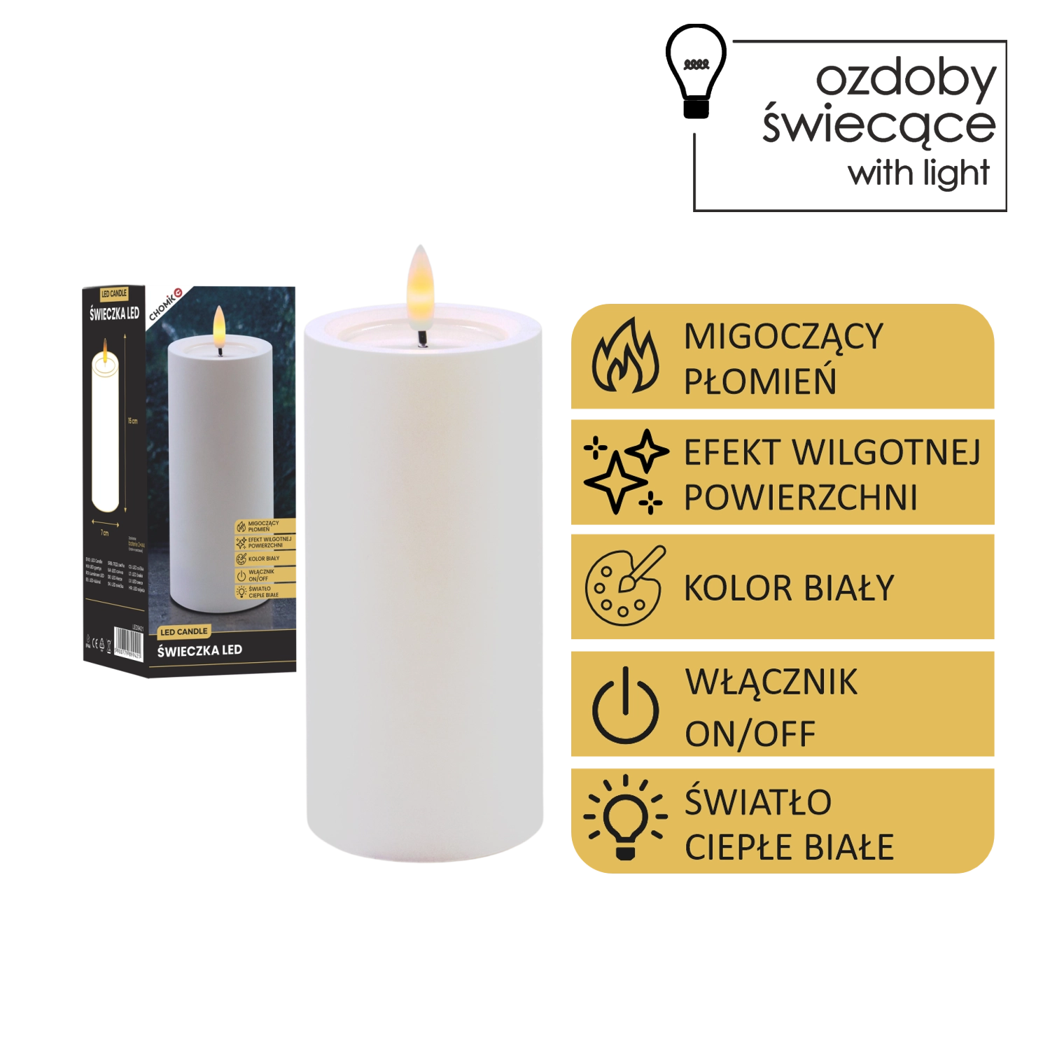 Elegantna LED sveča v beli barvi z merami 7 × 15 cm prinaša realističen utripajoč plamen v toplo beli ter izrazit učinek mokrega zgornjega roba. Odlično dopolni notranje dekoracije brez dima in nereda.