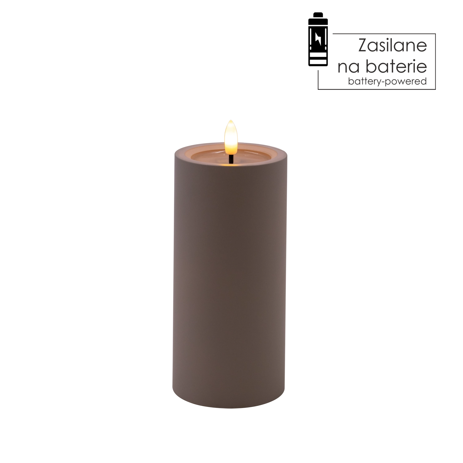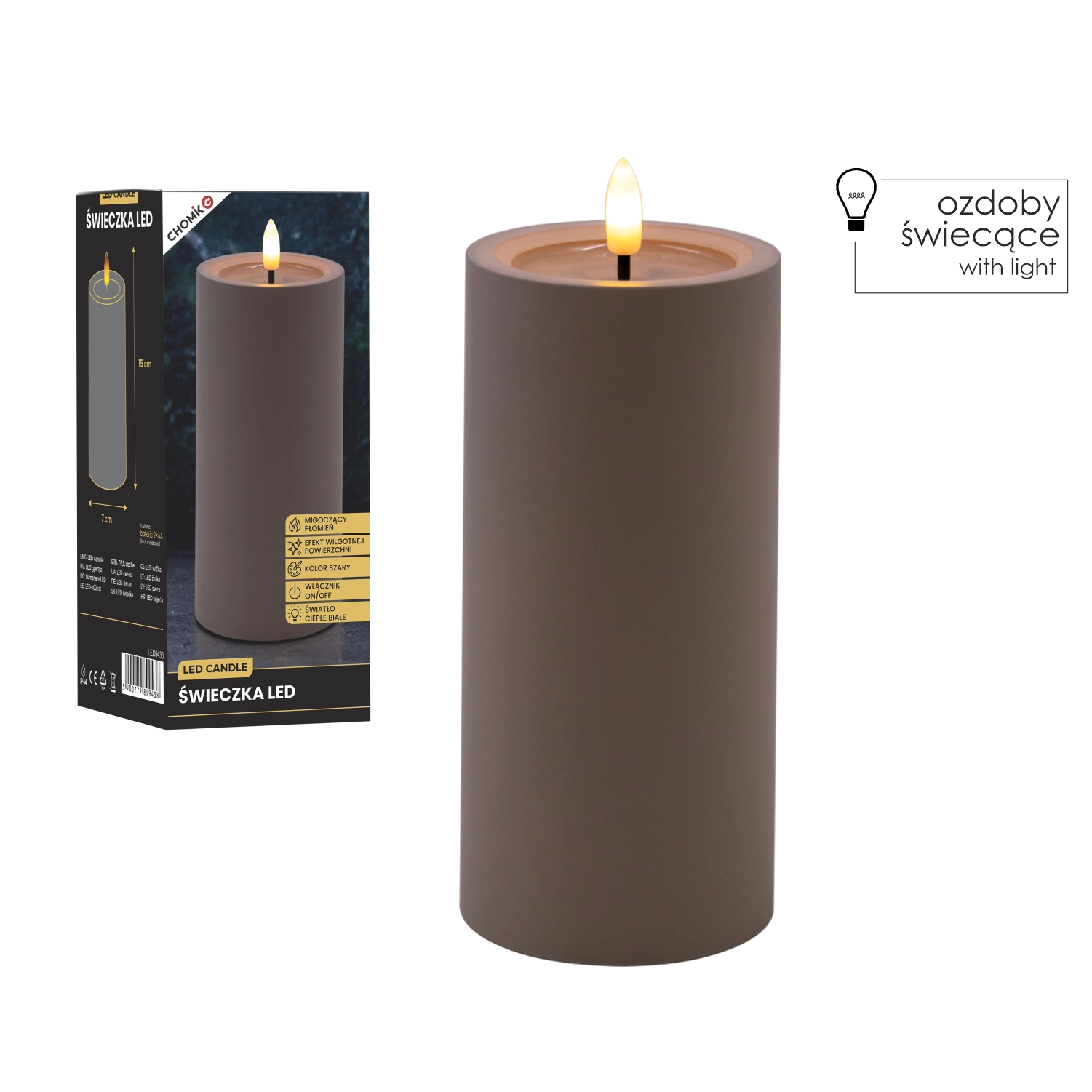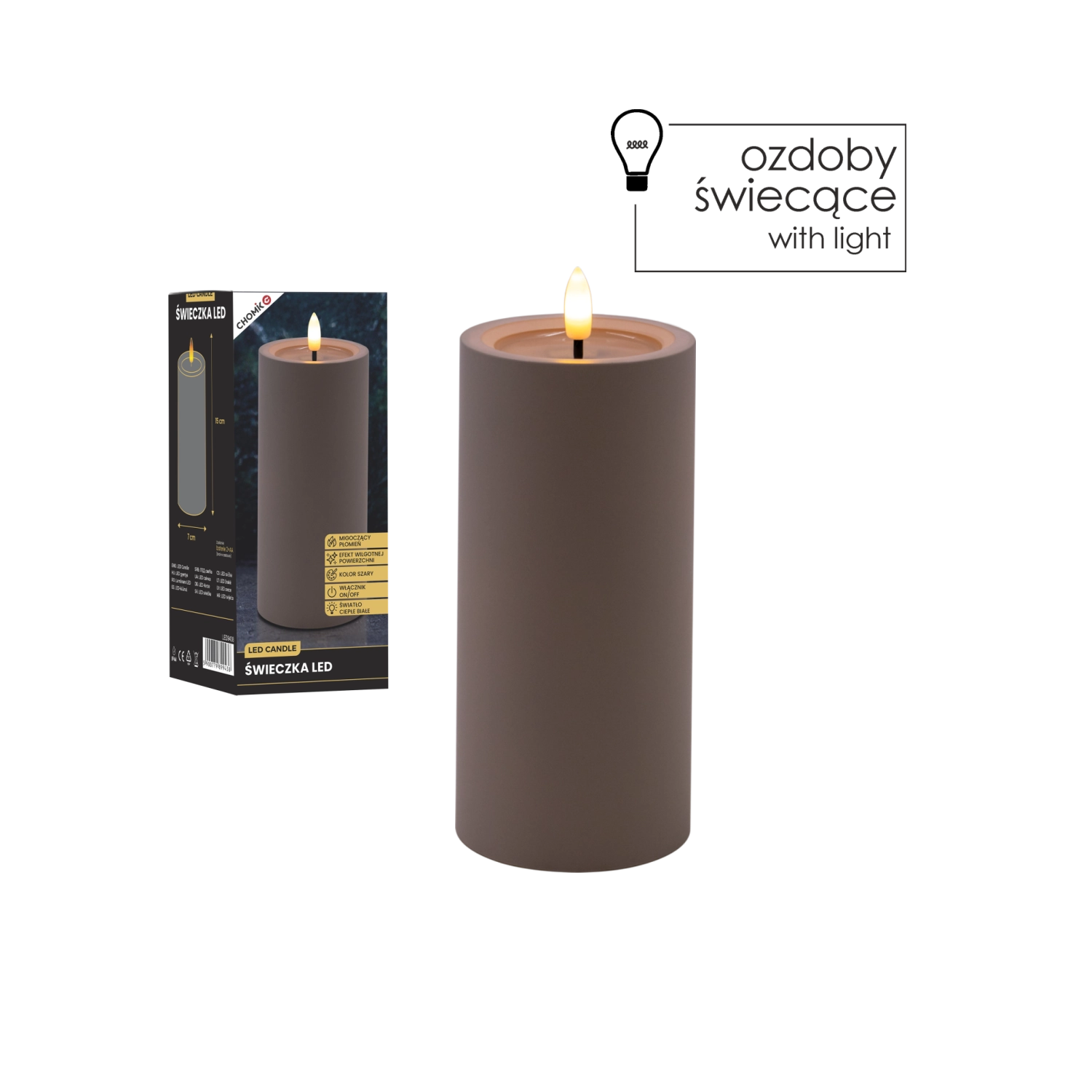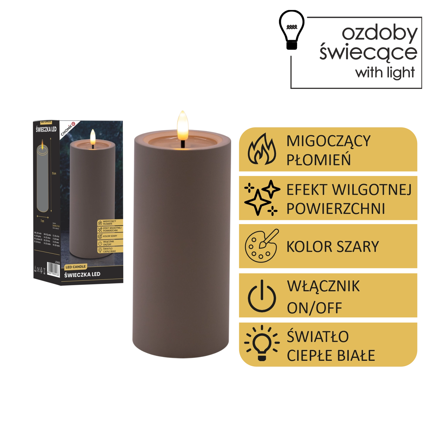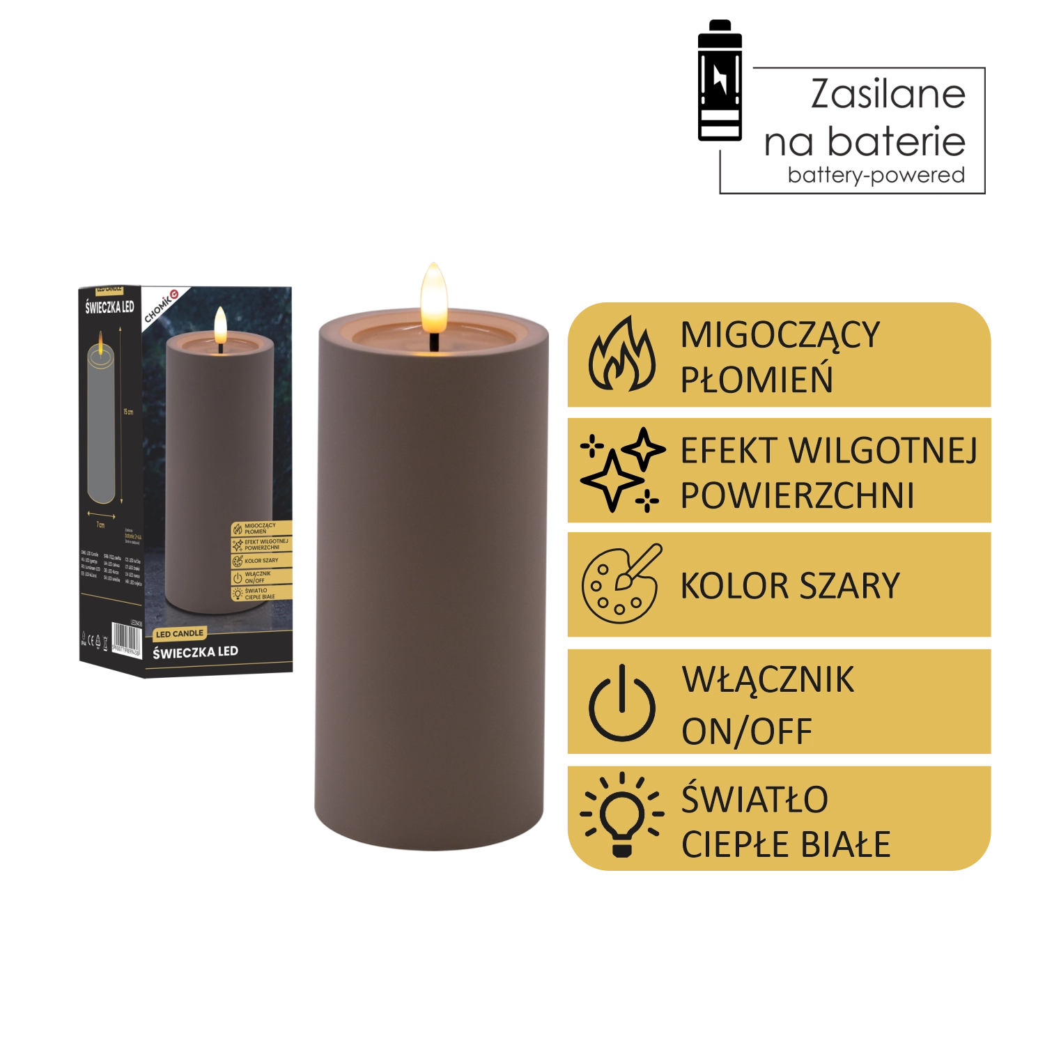 Ta siva LED sveča prinaša varno in stilsko osvetlitev v vsak prostor. Zahvaljujoč toplo beli barvi svetlobe in migetajočemu učinku plamena zvesto posnema pravo svečo, posebni učinek vlažne zgornje površine pa ji daje avtentičen videz.