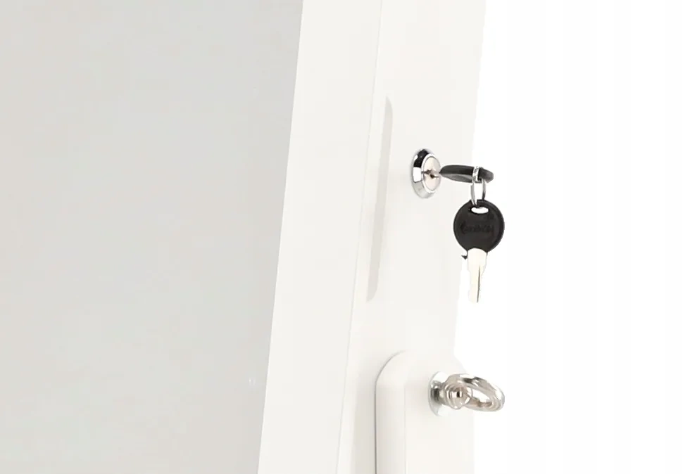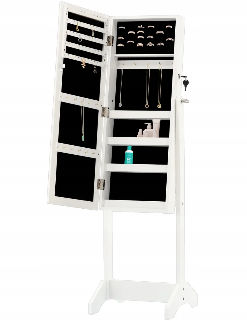 Elegantna stoječa škatla za nakit s polno velikim ogledalom združuje organizacijo nakita in stilen dizajn. V notranjosti ponuja kavlje, predelke ter vrste za prstane in uhanе, vse zaščiteno z žametnim oblazinjenjem. Vrata so zaklenljiva (2 ključa v paketu), ogledalo pa je možno nagibati za idealen kot. Odličen dodatek v spalnici za pregledno shranjevanje in vsakodnevno oblačenje.