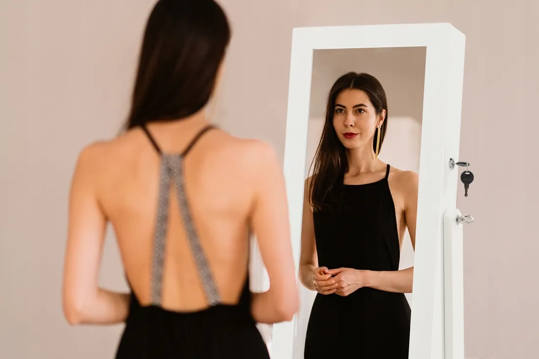 Veliko celozaslonsko ogledalo lahko preprosto nagnite z bočnimi zatiči, da vedno vidite popoln kot pri ličenju in preizkušanju oprav.