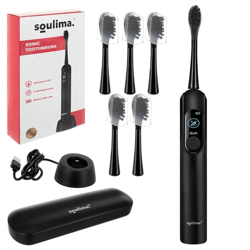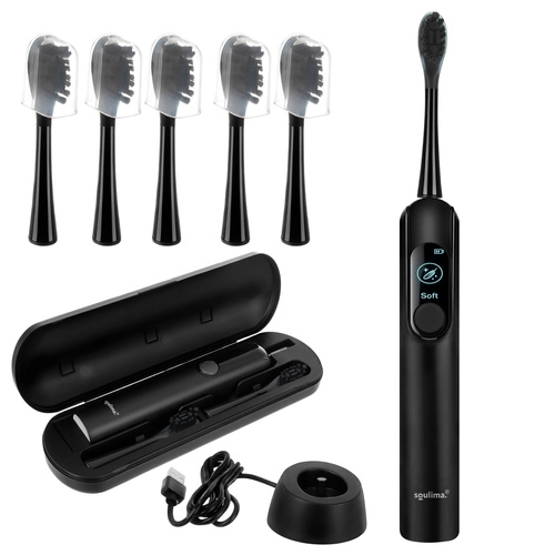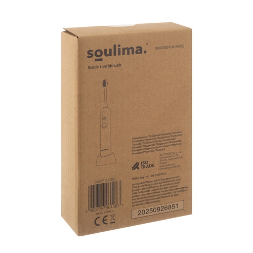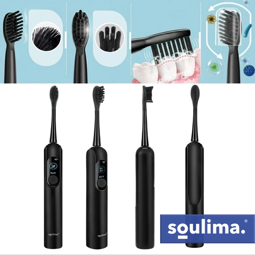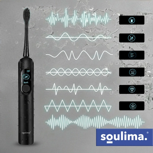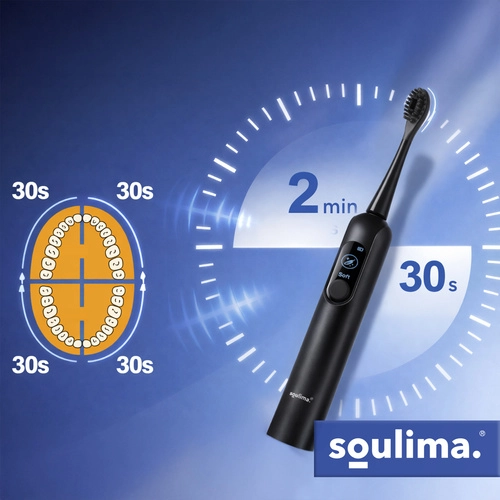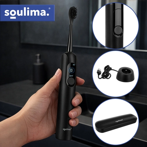 SOULIMA X800 je sodobna zvočna zobna ščetka za vsakodnevno ustno higieno, ki čisti učinkoviteje in nežneje kot ročna ščetka. Visokofrekvenčne vibracije pomagajo odstranjevati obloge in bakterije tudi z težko dostopnih mest, medtem ko vas pametni časovnik vodi k enakomernemu čiščenju celotne ustne votline.