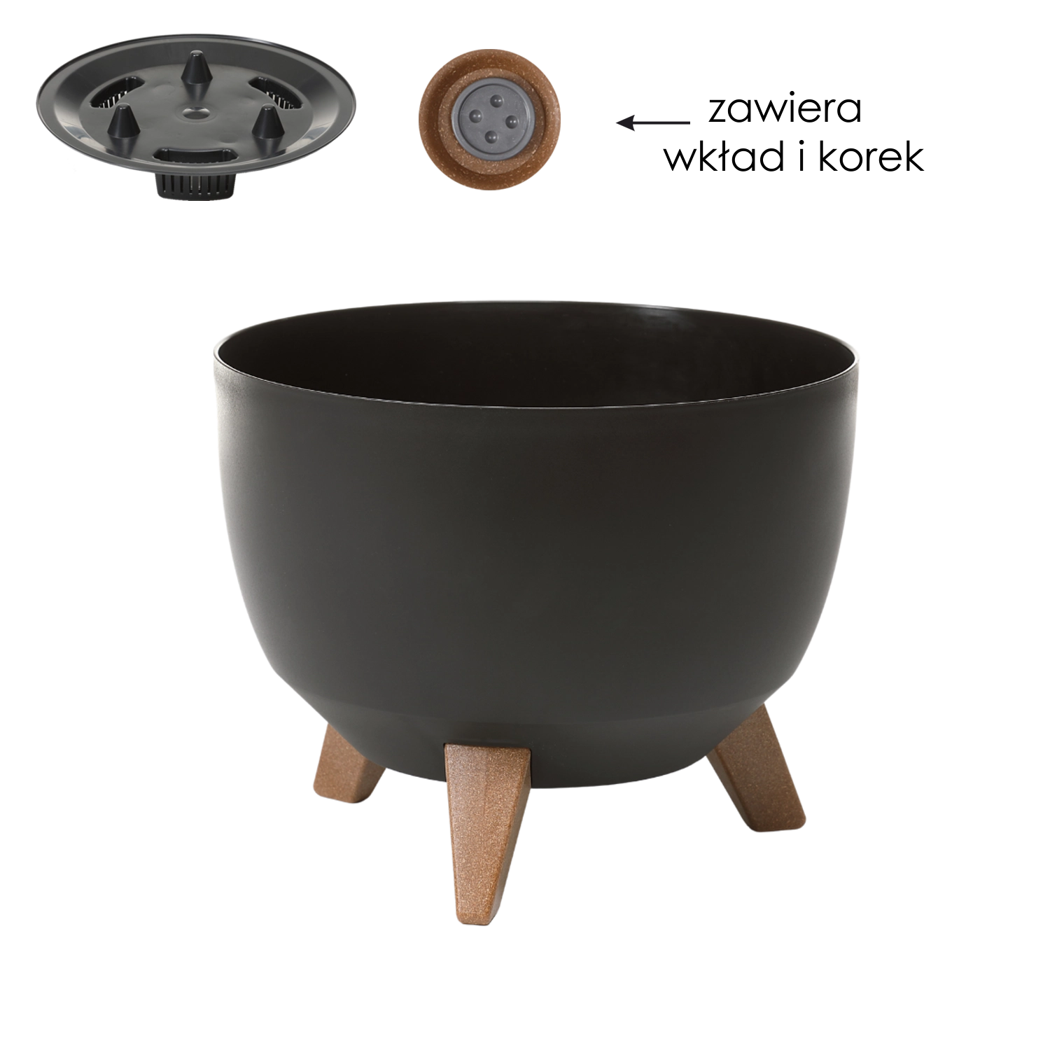 Elegantna cvetlična skleda ROMA 24 cm v črni barvi združuje moderen dizajn in praktične funkcije. Stabilne nogice v videzu lesa zagotavljajo boljšo kroženje zraka in enostavno postavitev, kakovostna plastika je odporna na vremenske vplive, odstranljiva vložka pa pomaga nadzorovati zalivanje brez prelitja – idealno za stilsko gojenje v notranjosti in na terasi.