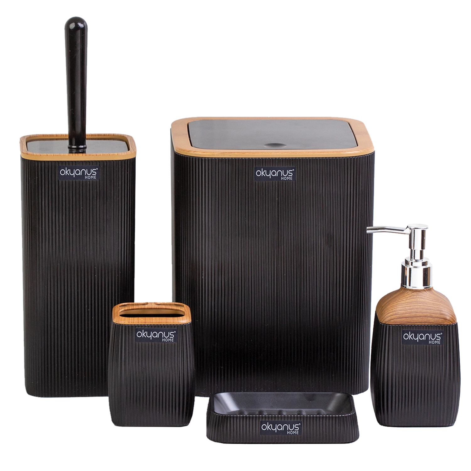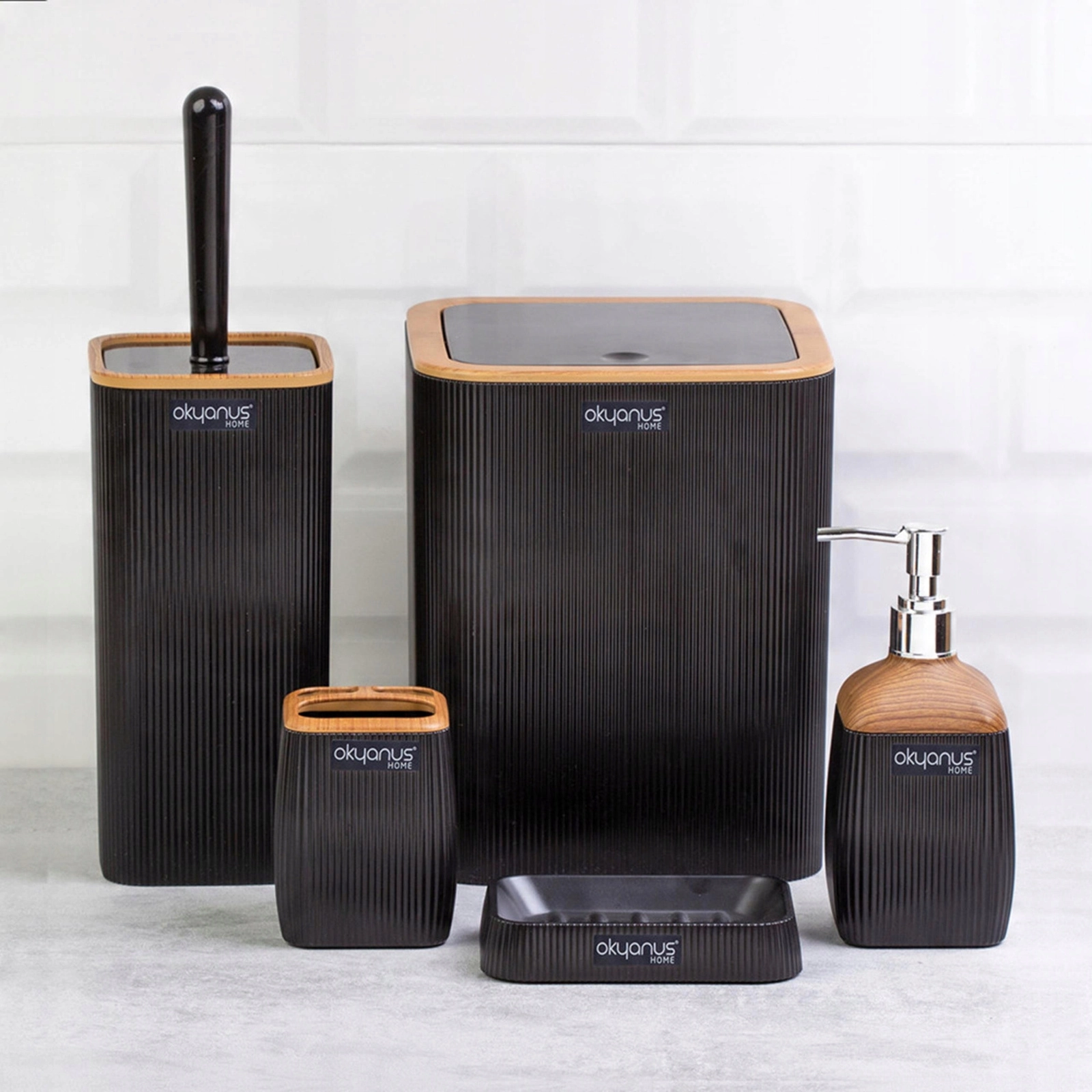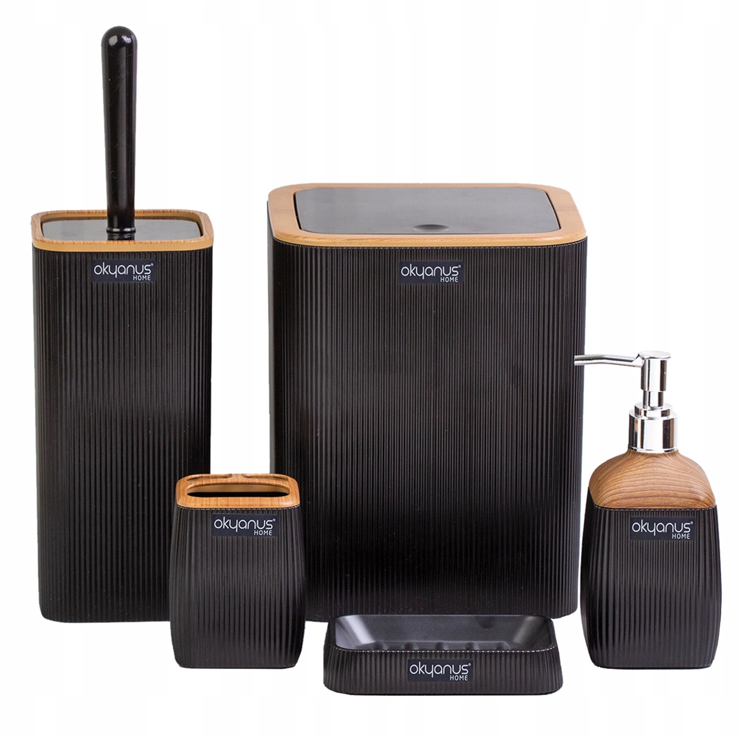 Stilski kvadratni kopalniški set v elegantni črni barvi z lesnim dekorjem v vašo kopalnico prinese moderen videz in praktično organizacijo. Koš za odpadke, WC krtača, dozator mila, lonček za ščetke in milnik so izdelani iz trpežne plastike, ki se zlahka čisti in odlično kljubuje vlagi.