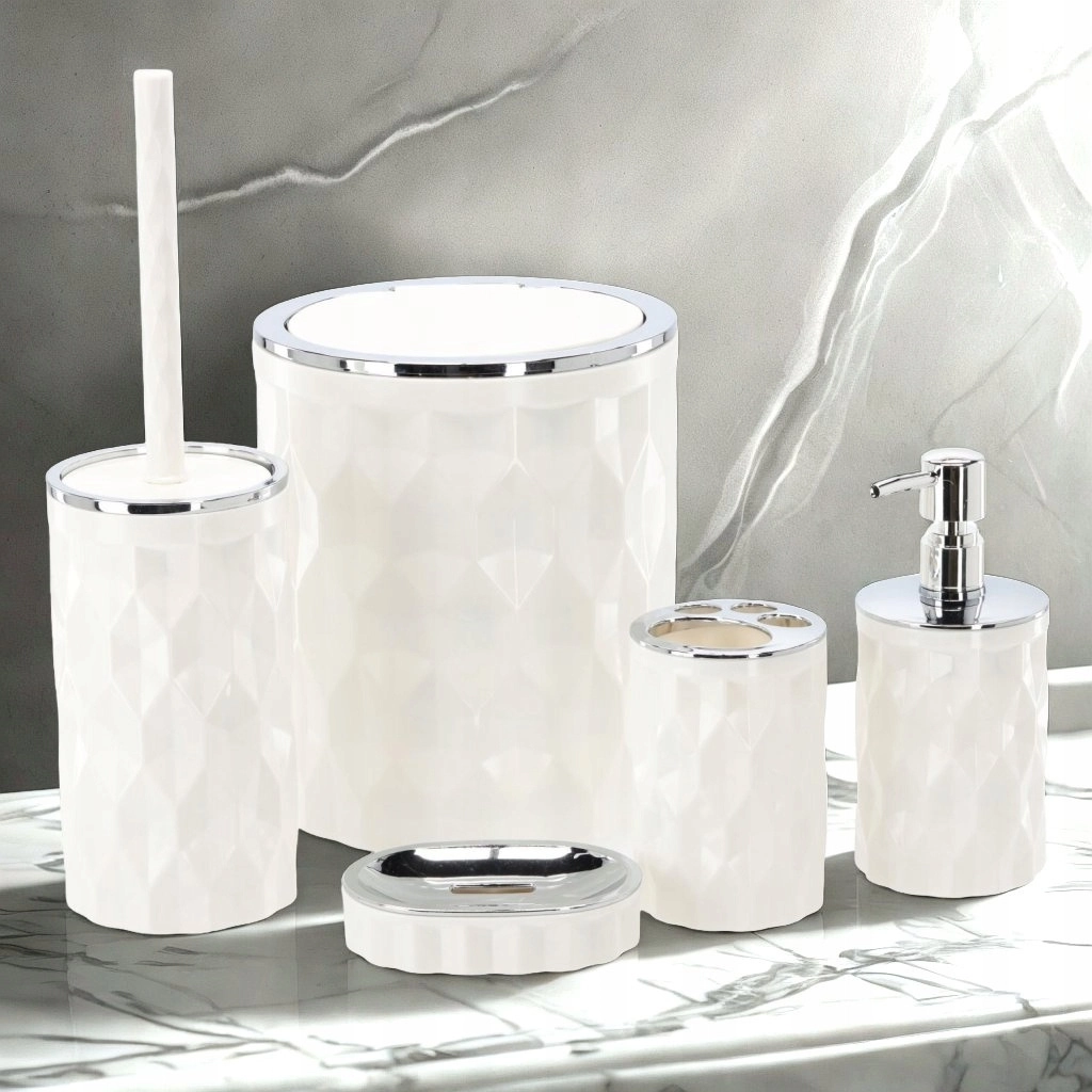 Stilski petdelni komplet kopalniških dodatkov v elegantni beli barvi prinaša vse, kar potrebujete za vsakodnevno higieno in red. Zahvaljujoč usklajenemu dizajnu z modernimi detajli in praktični razporeditvi elementov boste dosegli čist, poenoten videz kopalnice ter preprosto čiščenje. Set vključuje koš za odpadke, držalo s ščetko za WC, dozator za tekoče milo, stojalo za zobne ščetke in milenik.