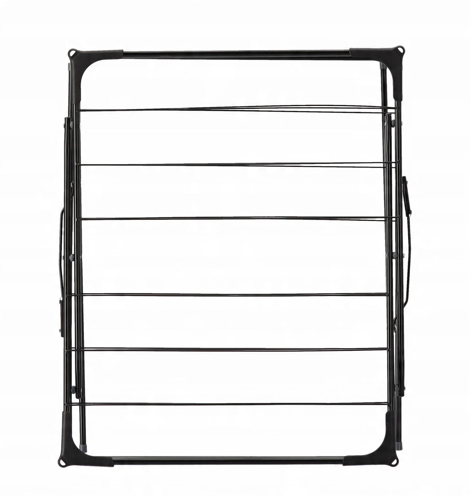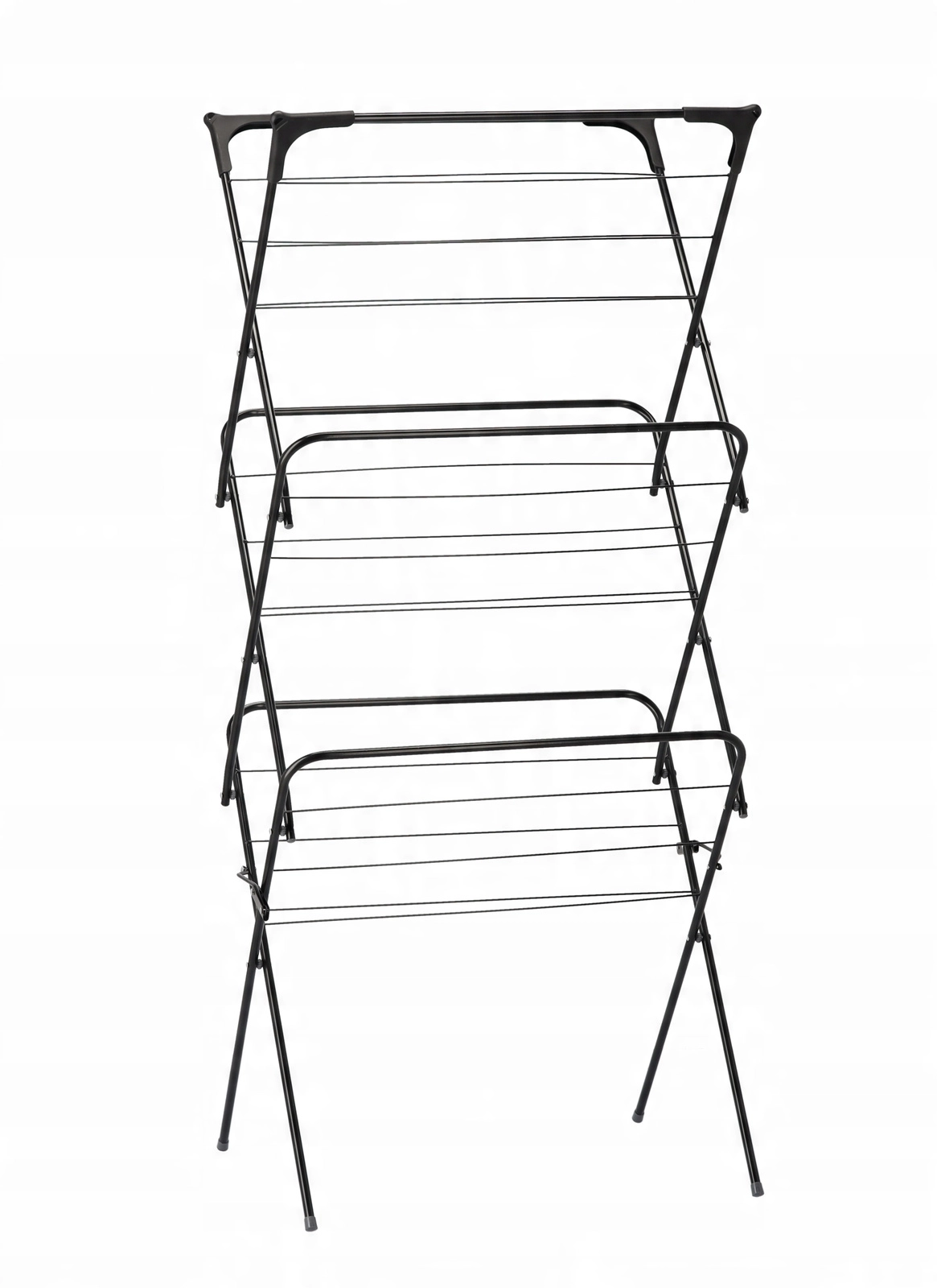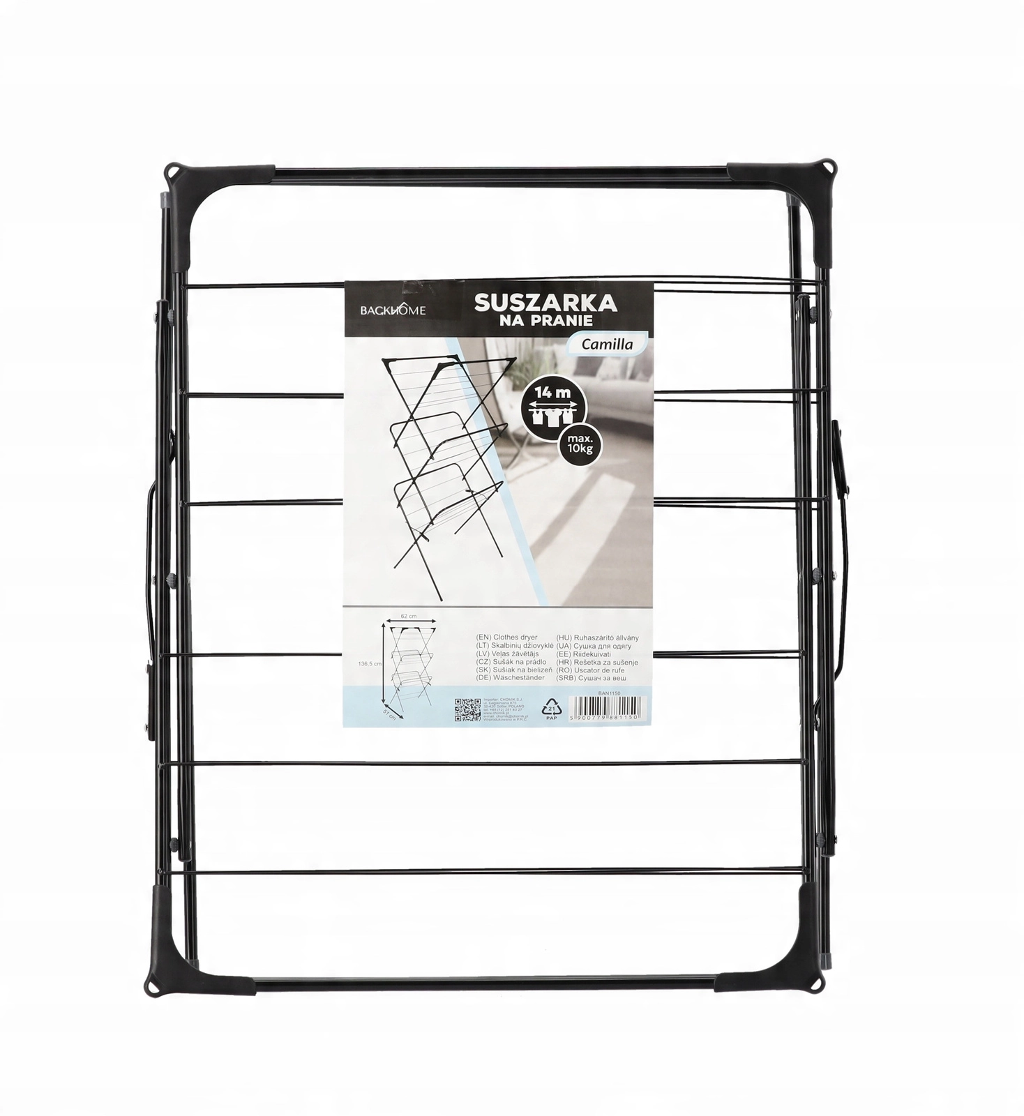 Stojalo za perilo Camilla v elegantni črni barvi združuje vzdržljivo kovinsko konstrukcijo s praktično večnivojsko razporeditvijo palic. S skupno sušilno površino 14 metrov zlahka sprejme običajno količino perila in hkrati prihrani prostor v gospodinjstvu.