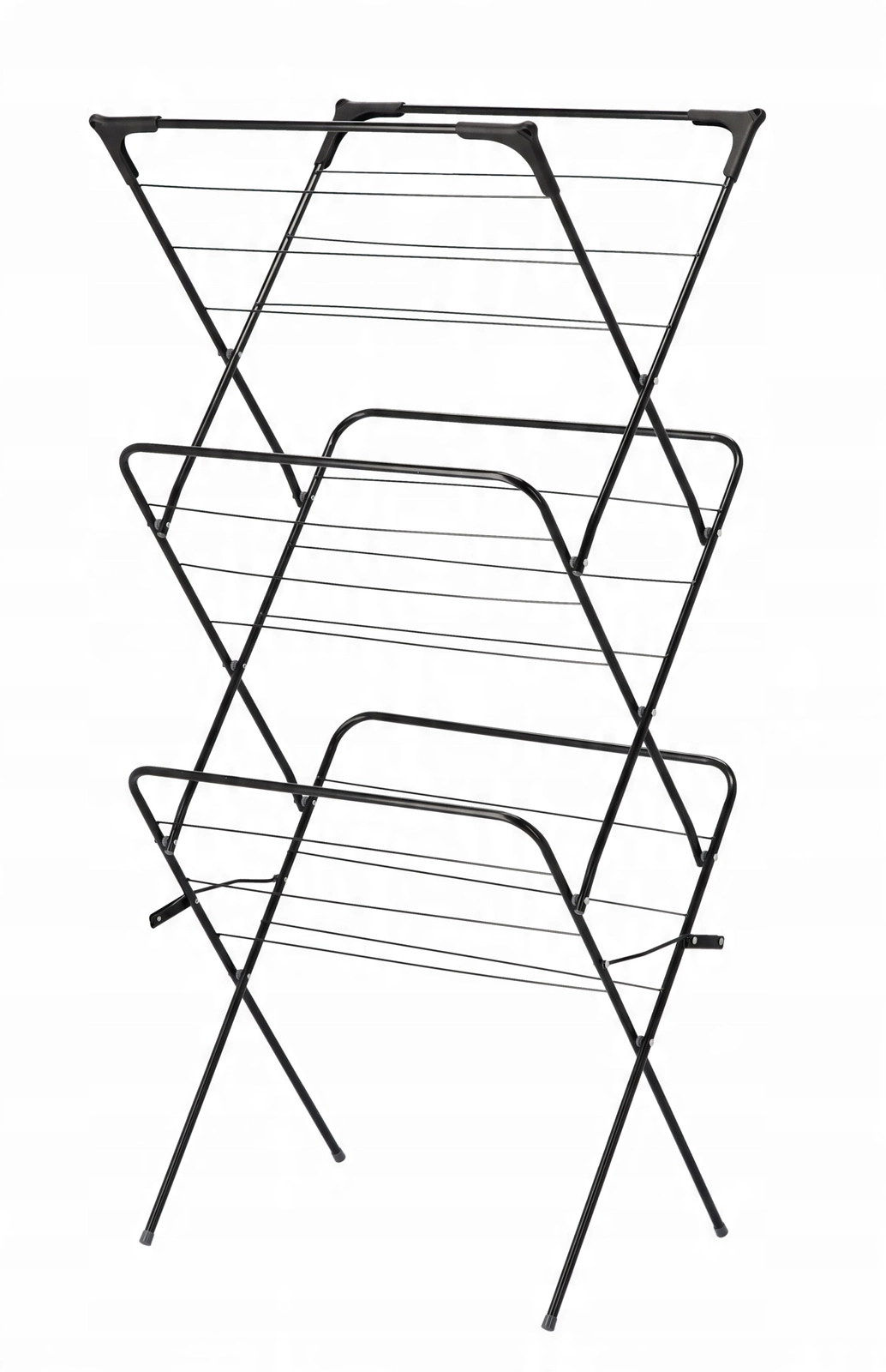 Močan kovinski okvir v črni barvi zdrži vsakodnevno uporabo in vremenske vplive ter zagotavlja stabilnost pri sušenju doma in na balkonu.