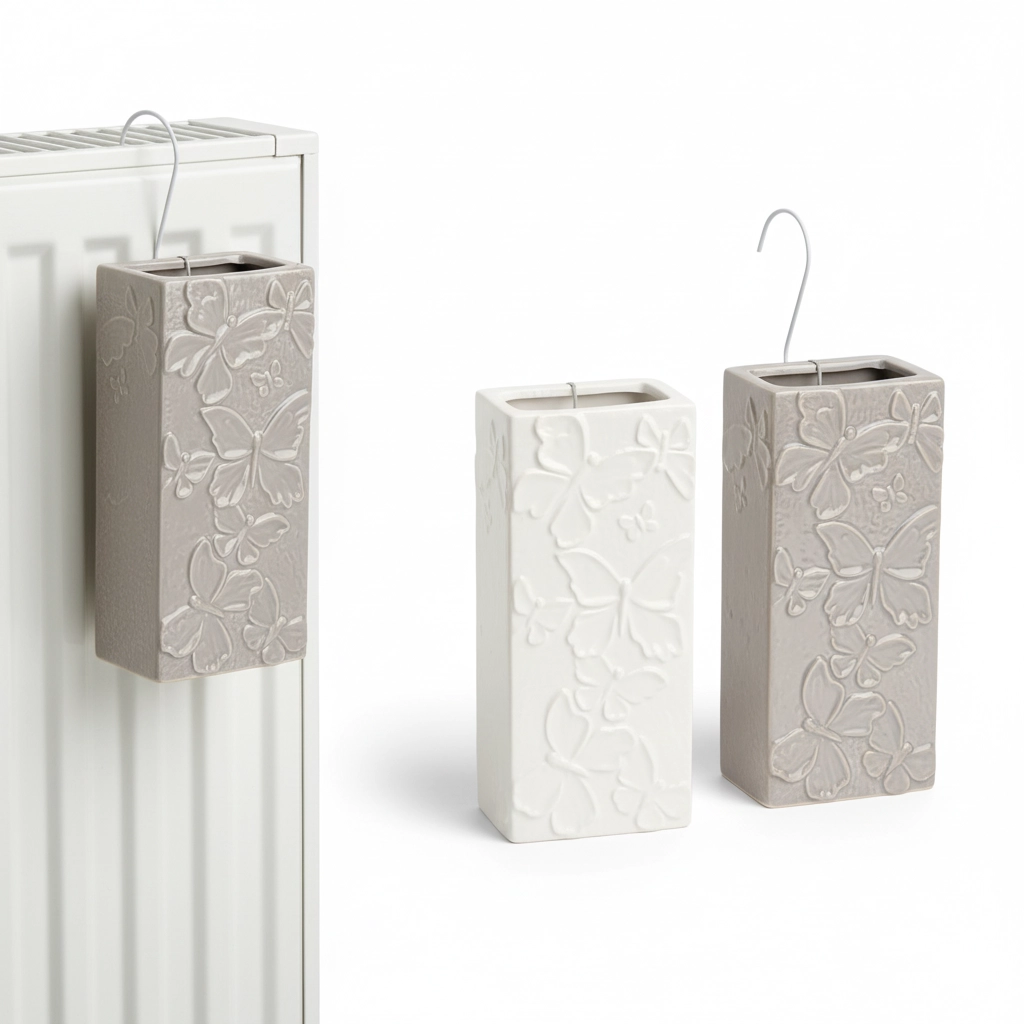 Ustvarite prijetno klimo doma s keramičnimi vlažilci za radiator z nežnim reliefom metuljev. Dovolj je, da jih napolnite z vodo in obesite na ogrevalo – toplota poskrbi za postopno izhlapevanje in naravno vlaženje zraka brez porabe elektrike, filtrov ali hrupa. Komplet 6 kosov zadošča za več prostorov v stanovanju ali hiši.