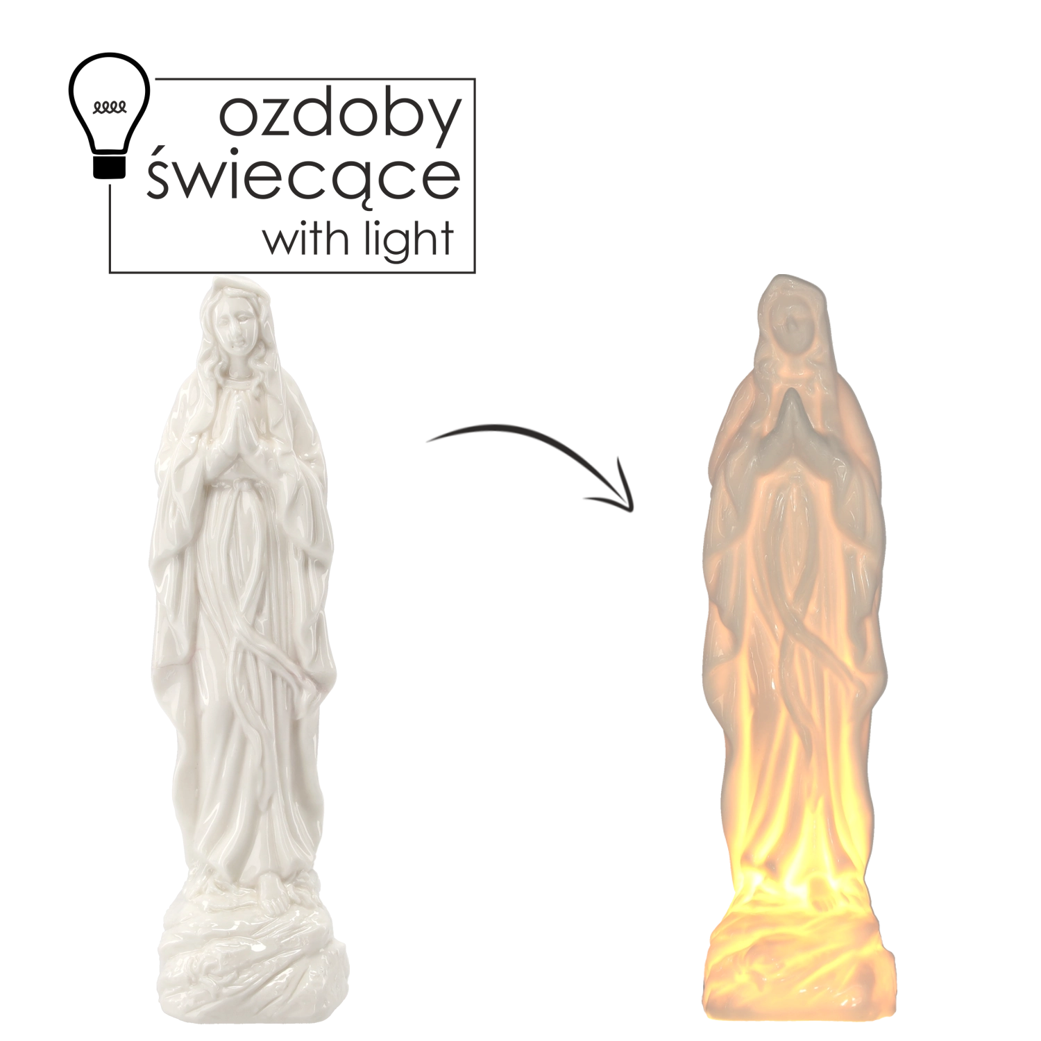 Elegantna porcelanasta figurica Device Marije, visoka 28,8 cm, z vgrajeno LED osvetlitvijo ustvari toplo in umirjeno vzdušje v vašem domu. Zahvaljujoč baterijskemu napajanju jo lahko postavite kamor koli brez kablov, idealna za božične okrasitve in vsakodnevno duhovno umiritev.