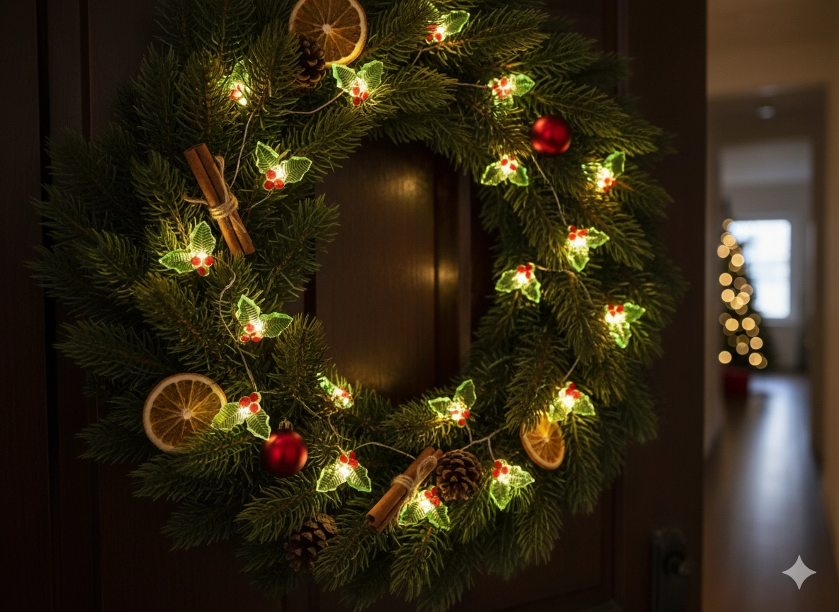 Eleganten LED venček s stiliziranimi listi omele in rdečimi jagodami bo osvetlil vsak praznični kotiček. Topla bela svetloba ustvari prijetno vzdušje, baterijsko napajanje pa omogoča postavitev kjerkoli – brez kablov in iskanja vtičnice.