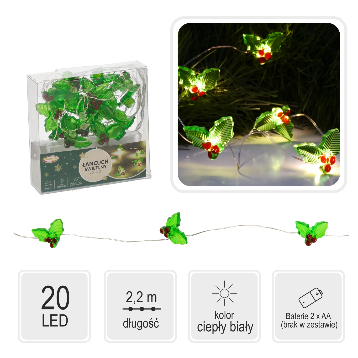 V notranjost vnesite praznično čarobnost z dekorativnim svetlobnim verižnim LED okrasom v obliki omele. 20 toplih LED na prožnem žičnem vodniku ustvari prijetno svetlobo brez potrebe po vtičnici zahvaljujoč napajanju 2× AA. Dolžina 2,2 m je idealna za vence, ograje, mize in police.
