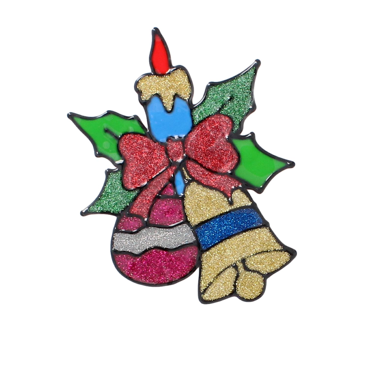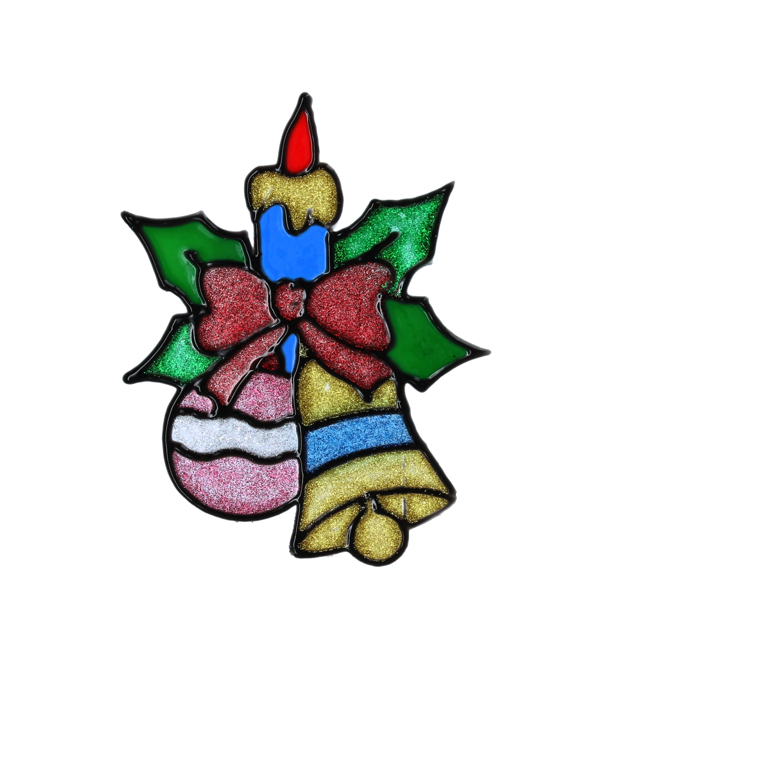 Motivi, kot so svečka, zvončki in okraski, imajo prosojne in bleščeče površine, ki lepo prepuščajo svetlobo in ustvarijo čarobno božično vzdušje.