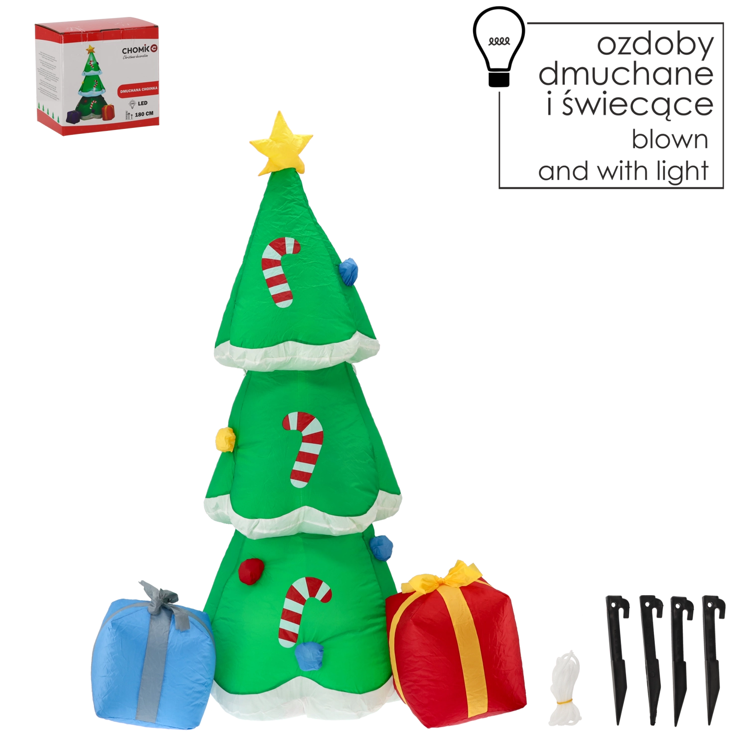 Dodajte svojim božičnim praznikom vpadljivo osrednjo dekoracijo. Barvito napihljivo drevesce z zvezdo in darili okoli pritegne pozornost otrok in odraslih, in to v notranjih prostorih in na prostem. Le priključite v vtičnico – vgrajeni motor poskrbi za samodejno napihovanje, LED osvetlitev pa ustvari prijetno vzdušje skozi ves večer.