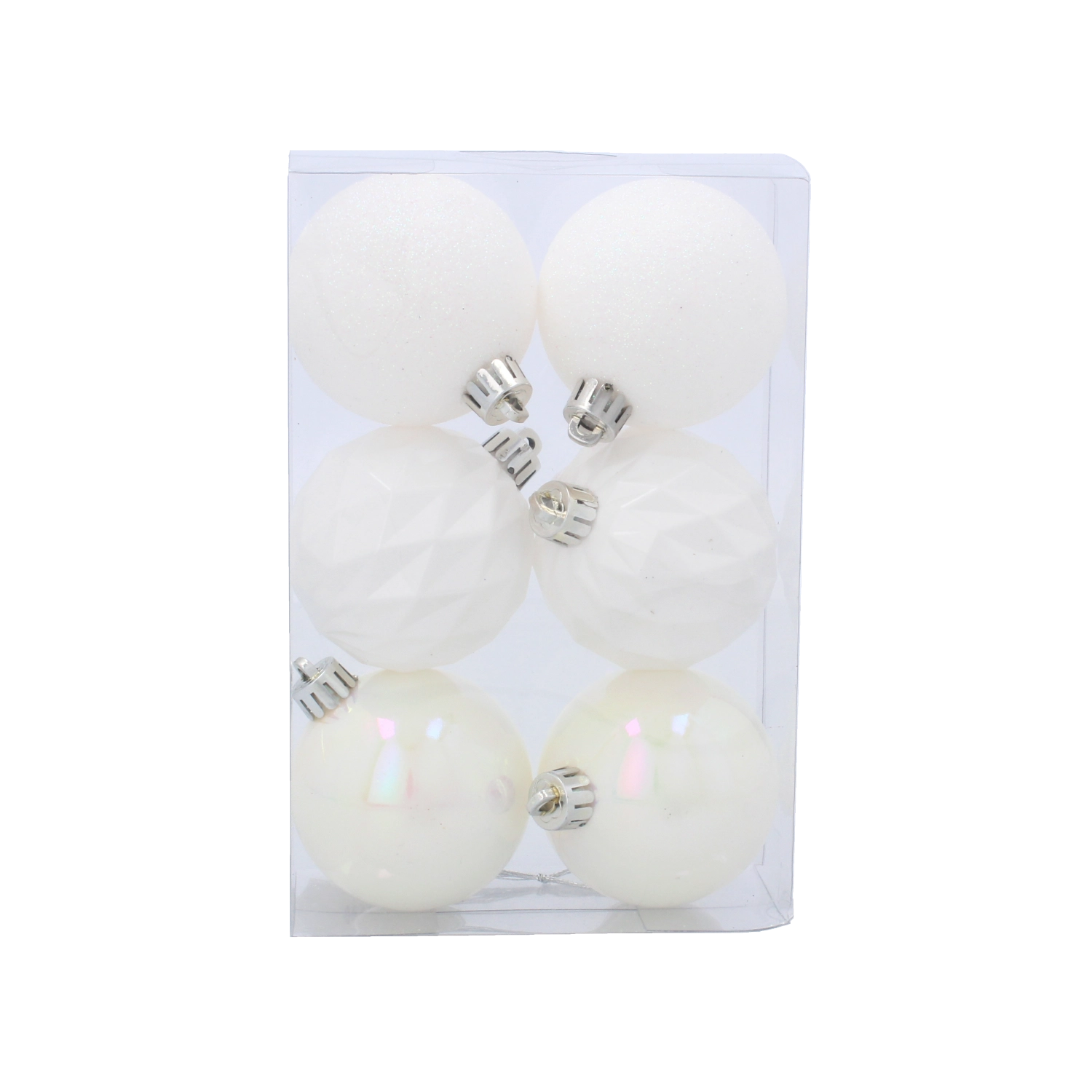Vsaka krogla je opremljena s kovinskim obešalnim ušescem, set pa je shranjen v praktični škatli za pregledno shranjevanje po praznikih. Kombinacija mat, biserne in fasetirane strukture ustvari harmoničen in razkošen videz, ki se poda tako tradicionalni kot moderni dekoraciji.