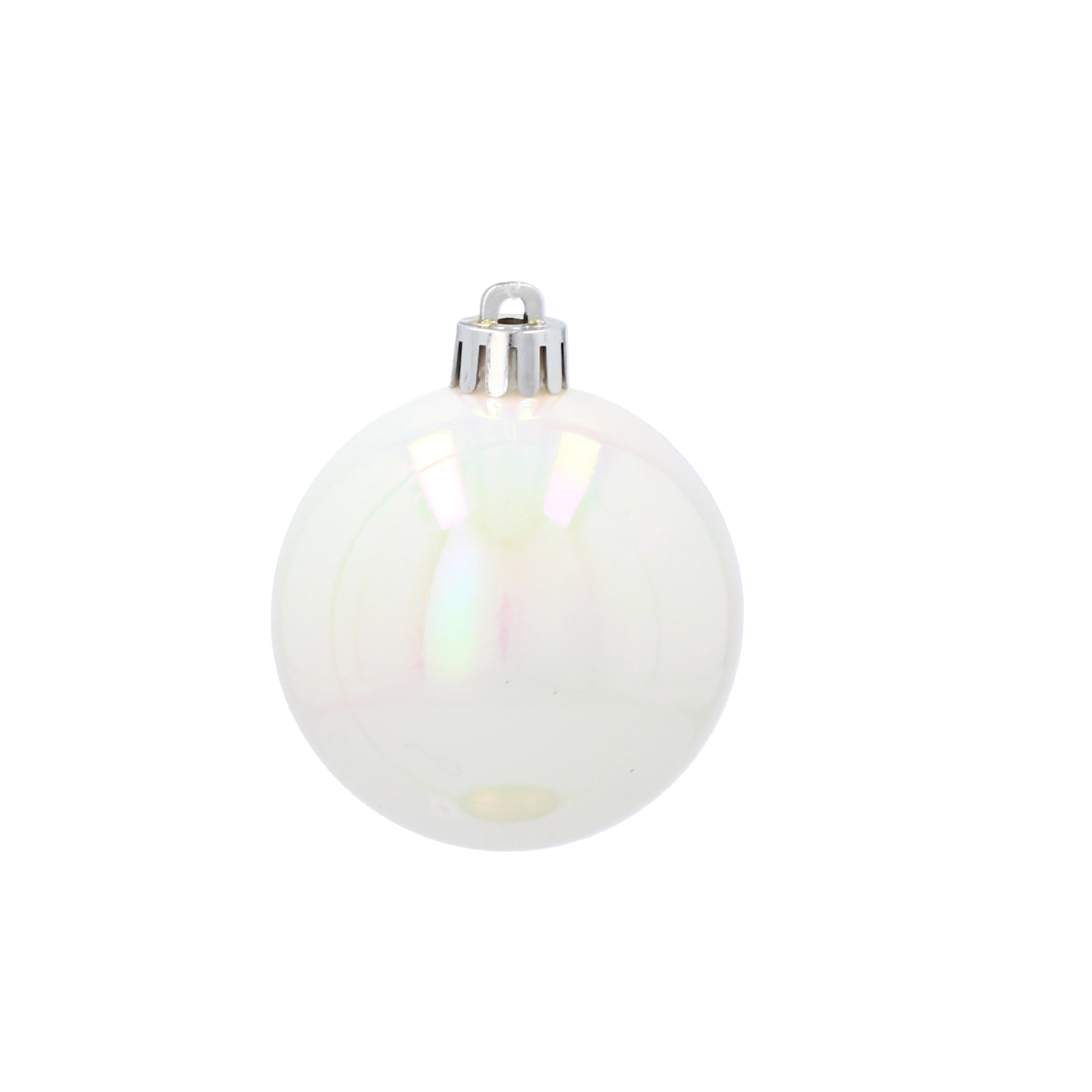 Iridescentna biserna obdelava odbija svetlobo z nežnim leskom, medtem ko fasetiran vzorec praznični dekoraciji doda globino in iskrice.