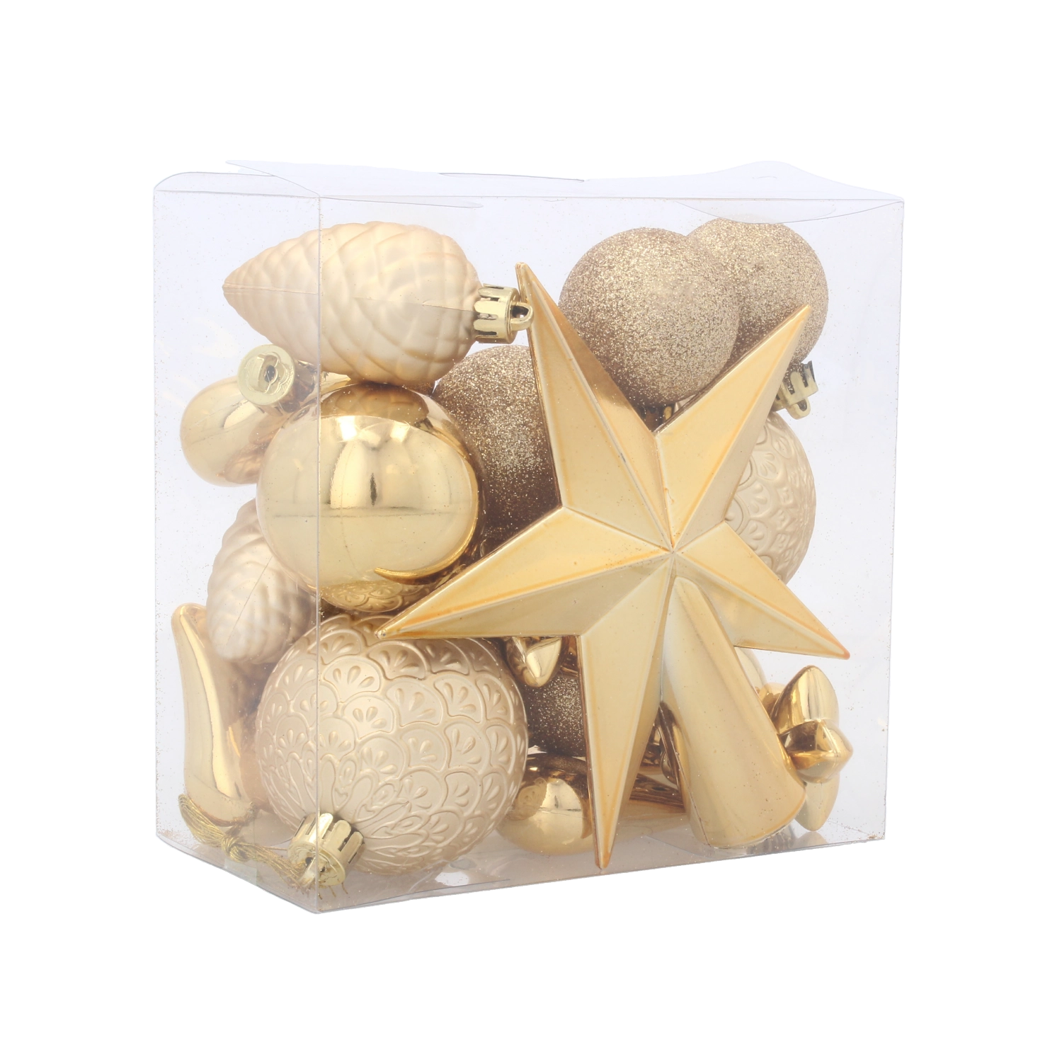 Okraski so izdelani iz lahkega in trpežnega plastika, zato jih je preprosto obesiti, dobro držijo na vejicah in so varni tudi v gospodinjstvih z otroki ali hišnimi ljubljenčki. Zahvaljujoč raznolikim oblikam – od krogel prek srčkov in storžev do zvezd – zlahka ustvarite bogato in uravnoteženo kompozicijo.