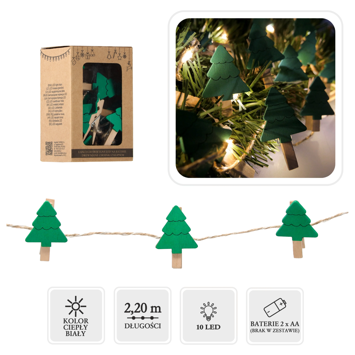 Ta dekorativni LED niz združuje svetlobo in funkcionalnost. Z lesenimi klipi v obliki božičnih smrečic zlahka razstavite fotografije, razglednice, imenske kartice ali drobne okraske. Toplo bele LED ustvarijo prijetno svetlobo, ki poudari čar božiča v dnevni sobi, otroški sobi ali na slavnostno pogrnjeni mizi.