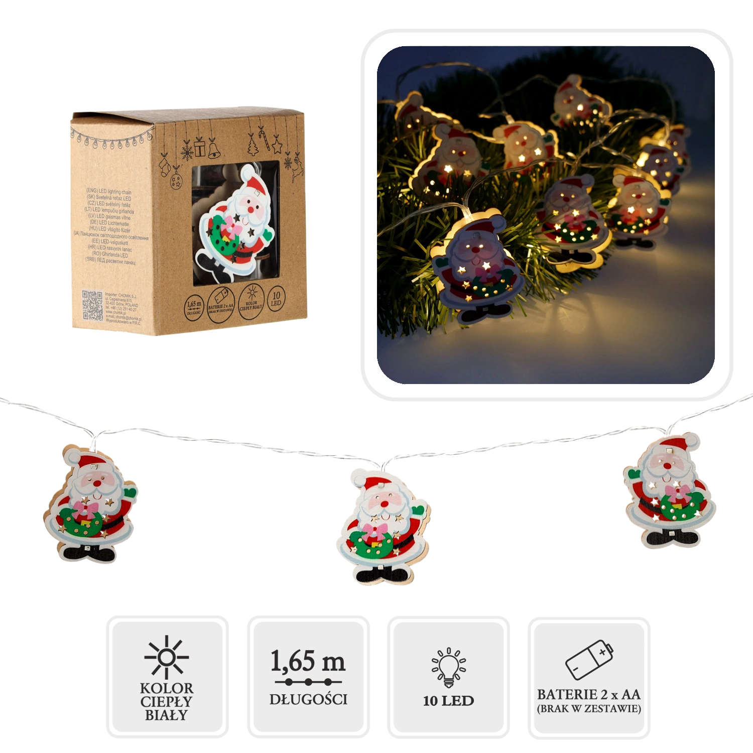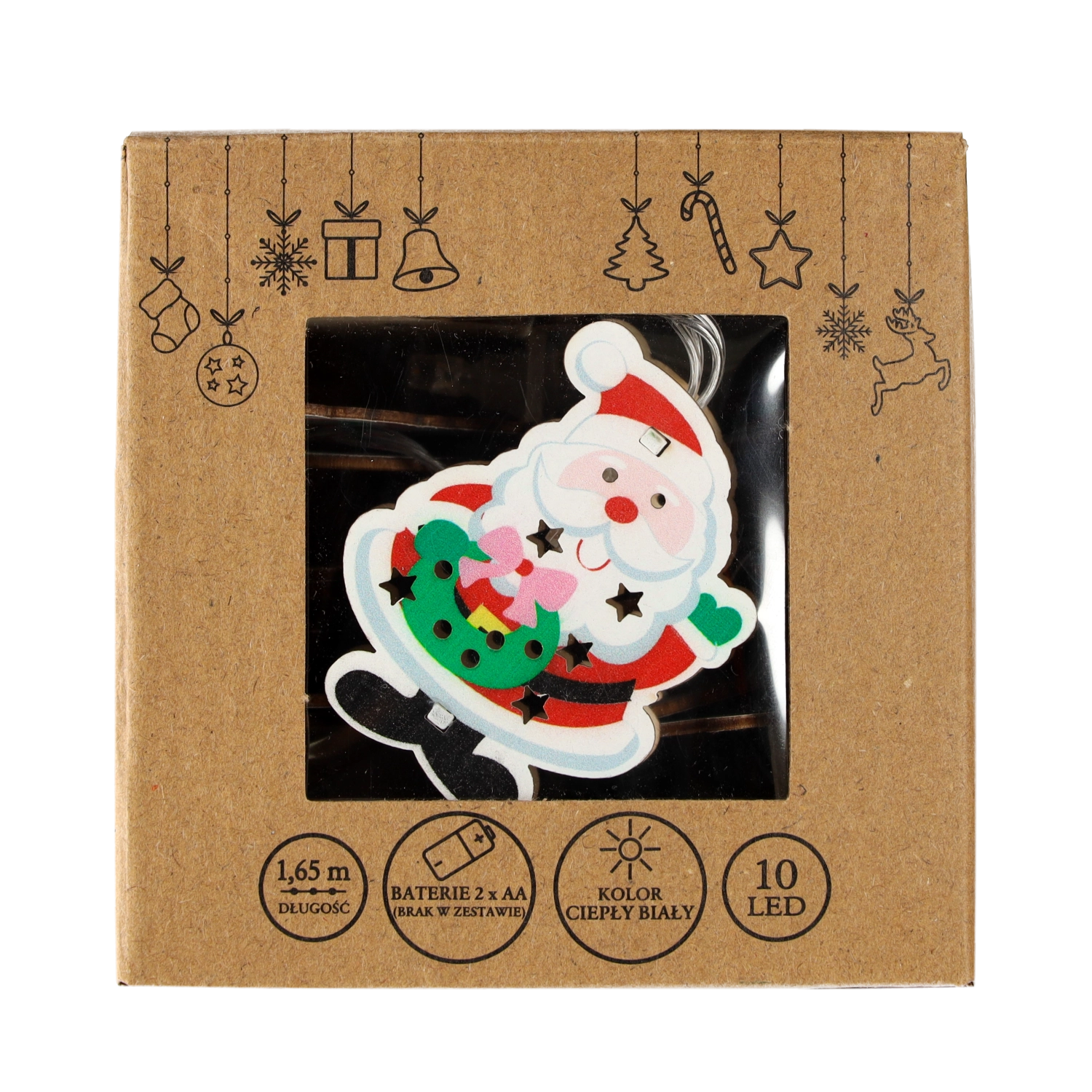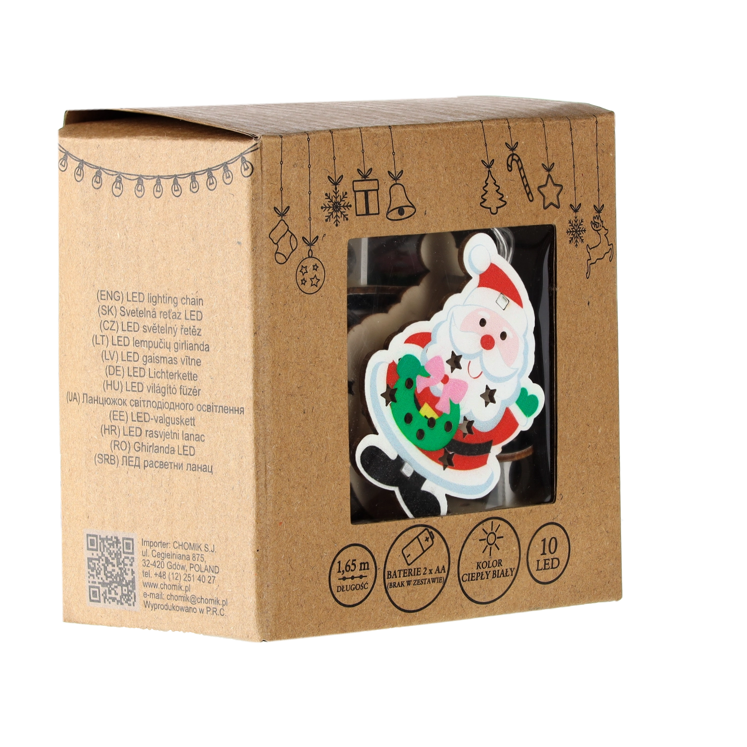 Vnesite v dom praznični čar z dekorativno LED verigo s silhuetami Božička. Topla bela svetloba ustvari prijetno vzdušje, napajanje na baterije pa omogoča svobodno postavitev brez kablov, medtem ko 10 LED nežno osvetli venec, drevesce ali okensko polico.