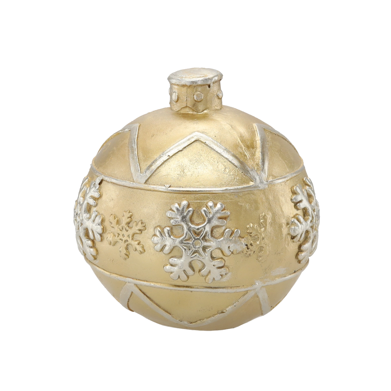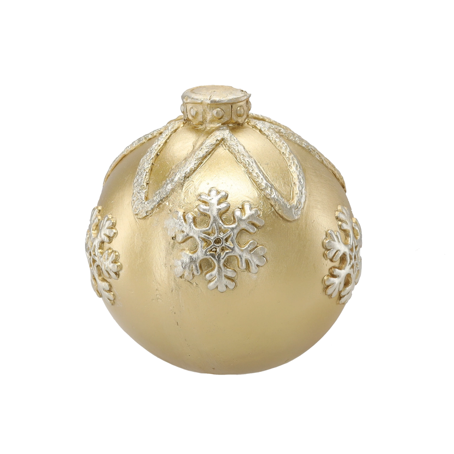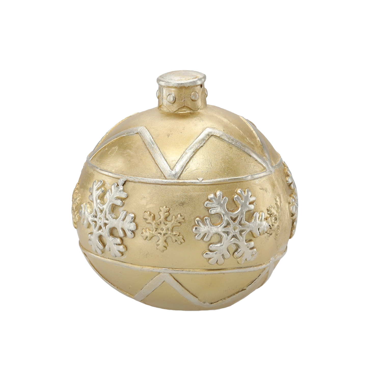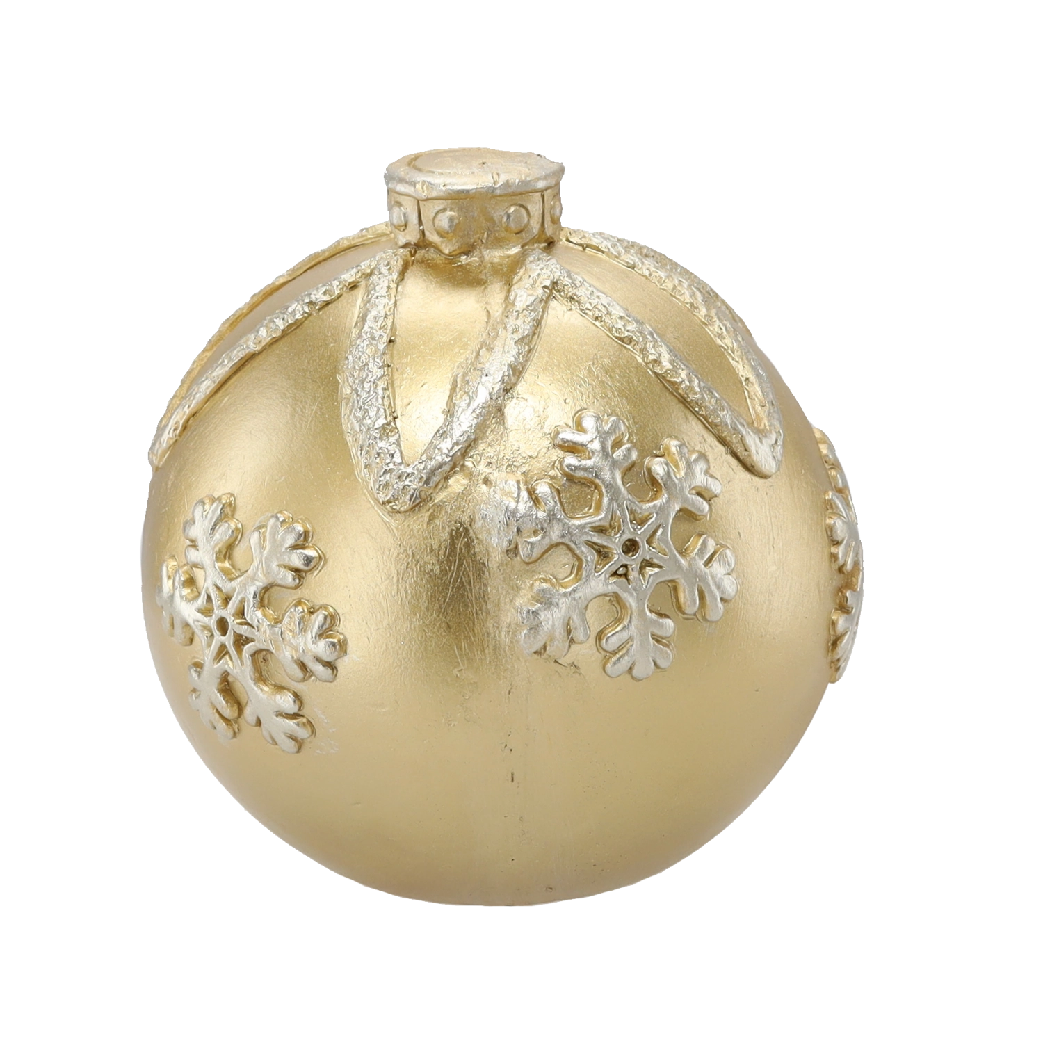 Elegantna zlata božična krogla s premerom 21,5 cm bo vašemu domu dodala praznično vzdušje. Svetleča površina in reliefni vzorci snežink jo naredijo za izrazito dekoracijo za večje božične jelke ali samostojne aranžmaje. Izdelana iz kakovostnega, odpornega materiala za dolgo življenjsko dobo.
