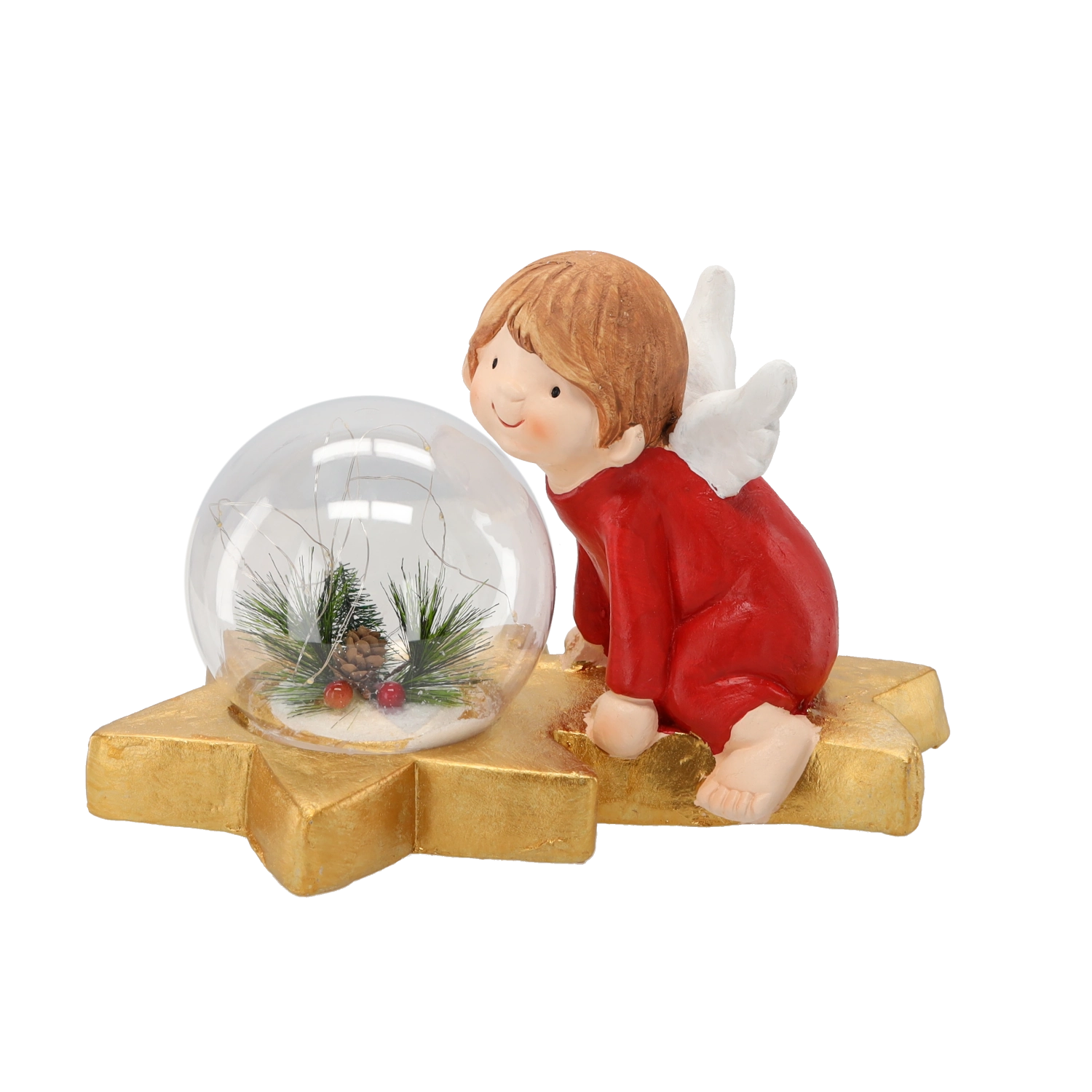 Prisrčna božična figurica angelčka s prozorno LED kroglo bo v vaš dom vnesla čarobno vzdušje. Na zlati zvezdi kleči angel v rdečem oblačilu, ob njem pa zasije dekorativna krogla z iglicami, jagodami in storžem. Zahvaljujoč dovršeni izdelavi, bleščeči površinski obdelavi in nežni LED osvetlitvi je ta dekoracija idealna za mizo, polico ali komodo. Baterije AAA niso priložene.