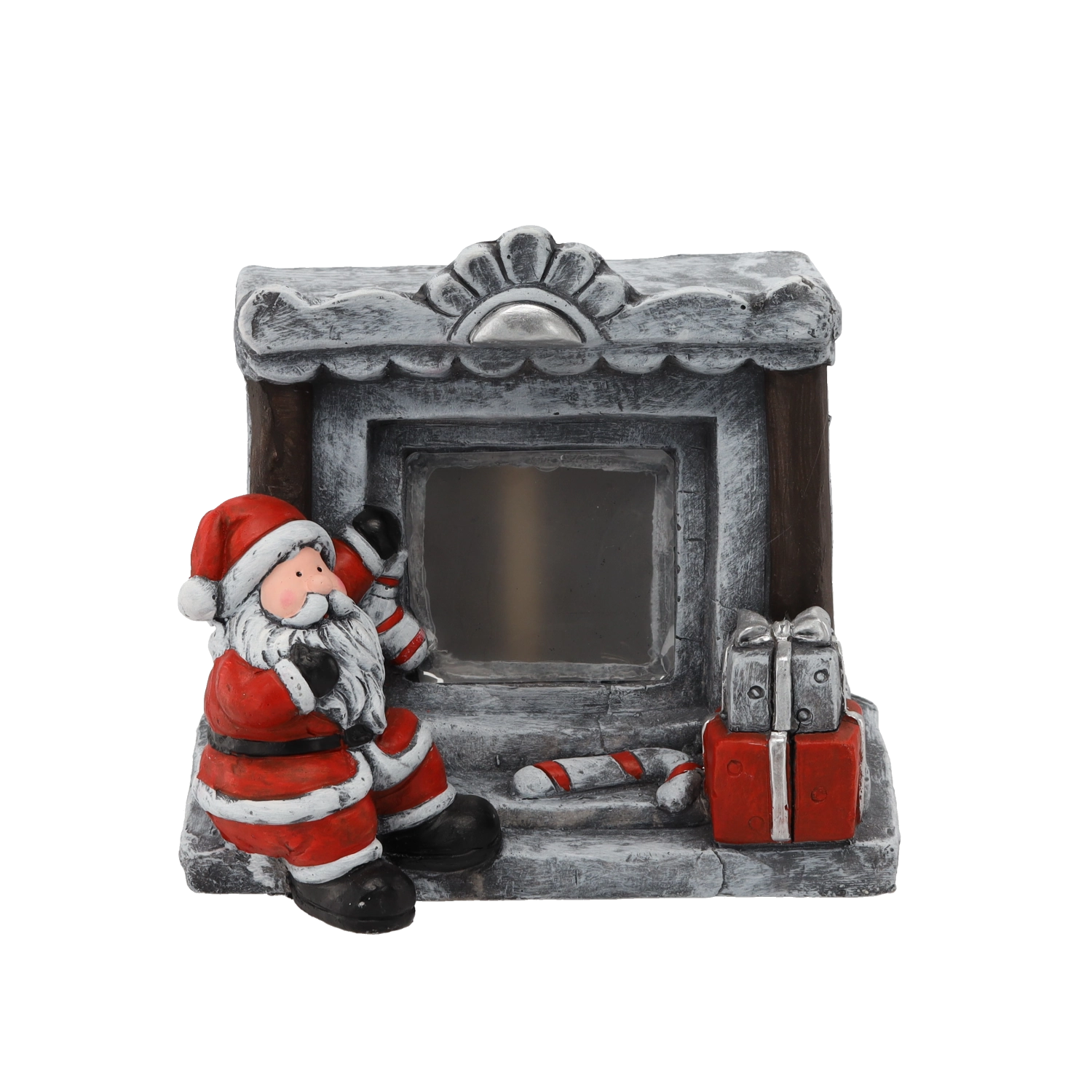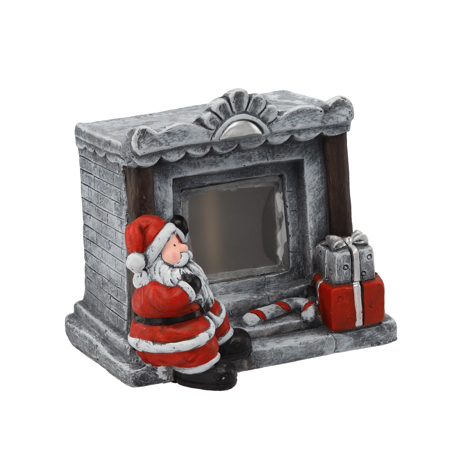 Ta dekorativna figurica v obliki kamnitega kamina z Božičkom v dom prinese toplo praznično razpoloženje. Vgrajena LED svetloba nežno osvetljuje »ogenj« in ustvarja prijetno toplo svetlobo, idealno za polico, konzolo ali božično mizo.