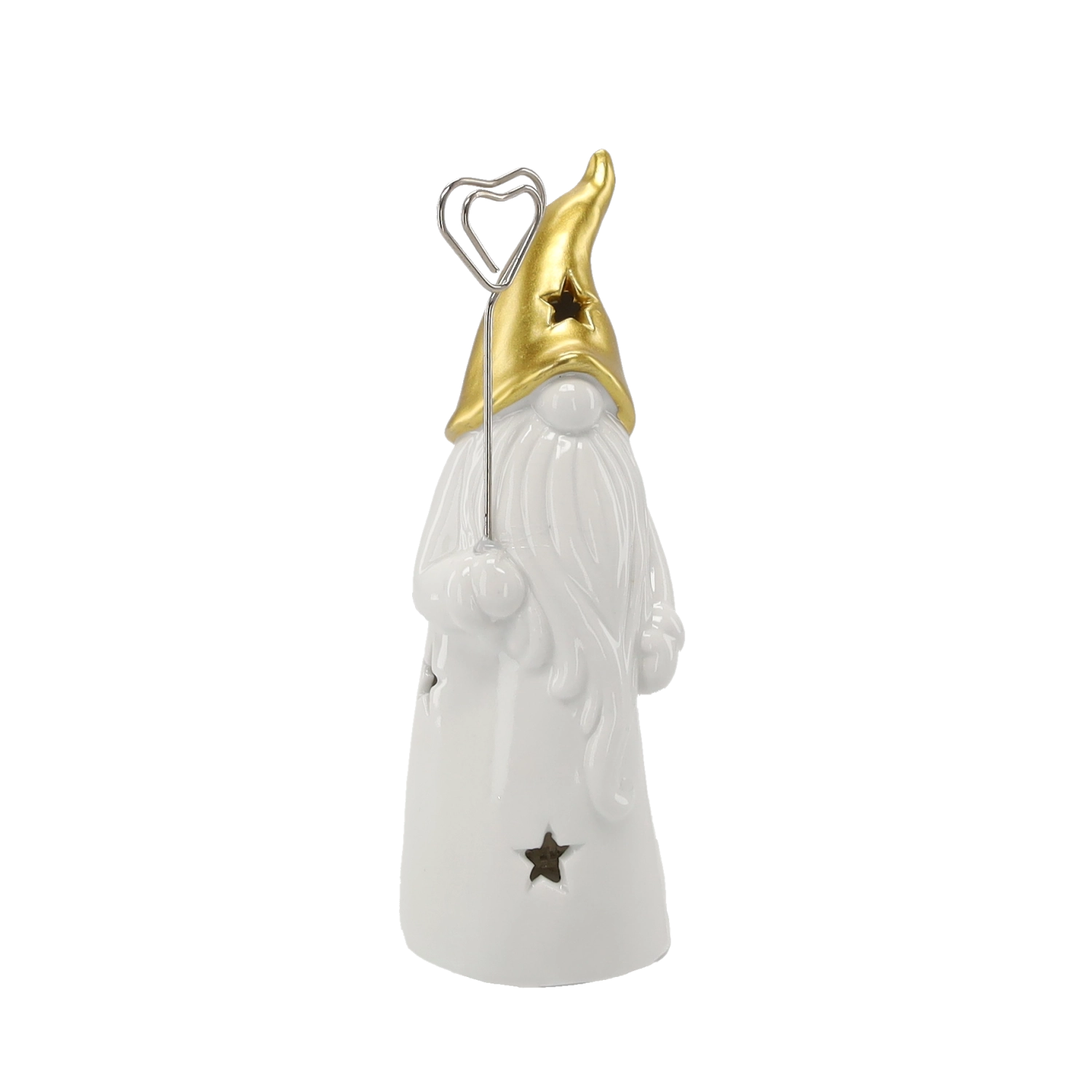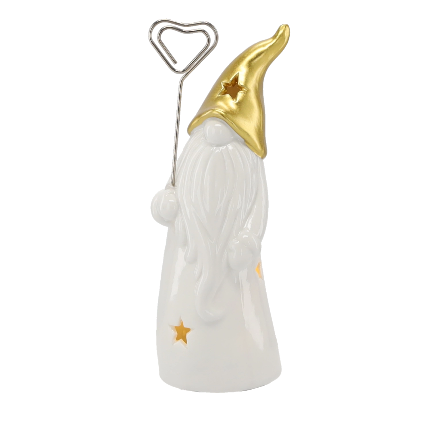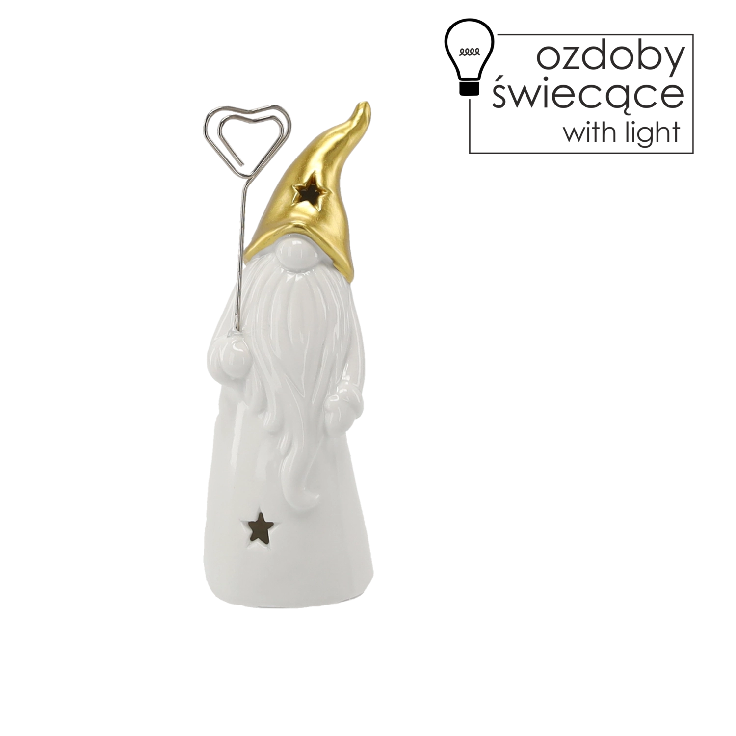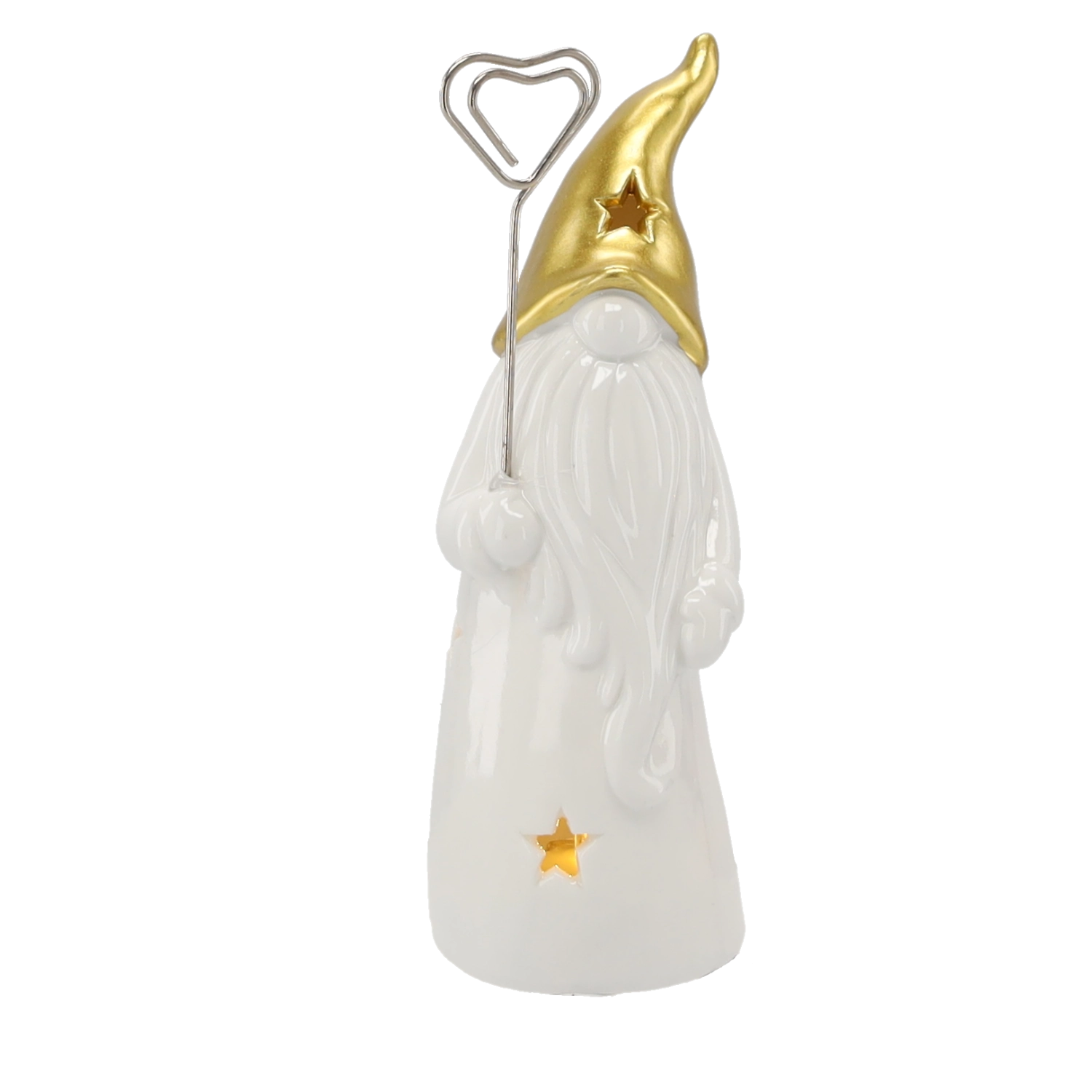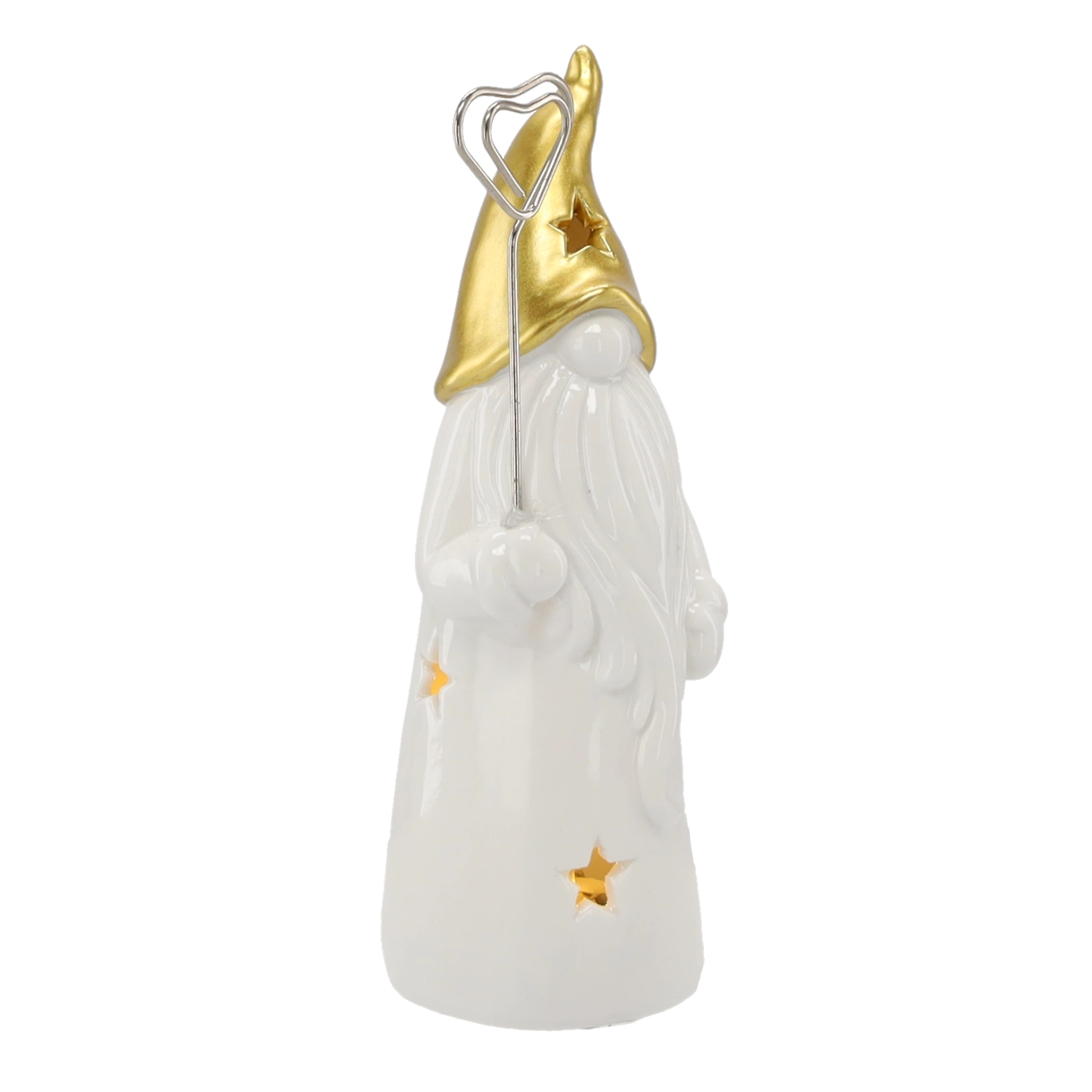 Odkrijte čar praznične dekoracije s to keramično figurico palčka, ki z vgrajeno LED osvetlitvijo nežno sije skozi zvezdice na telesu in klobuku. Kombinacija sijoče bele keramike in kovinsko zlate doda interierju praznično eleganco.