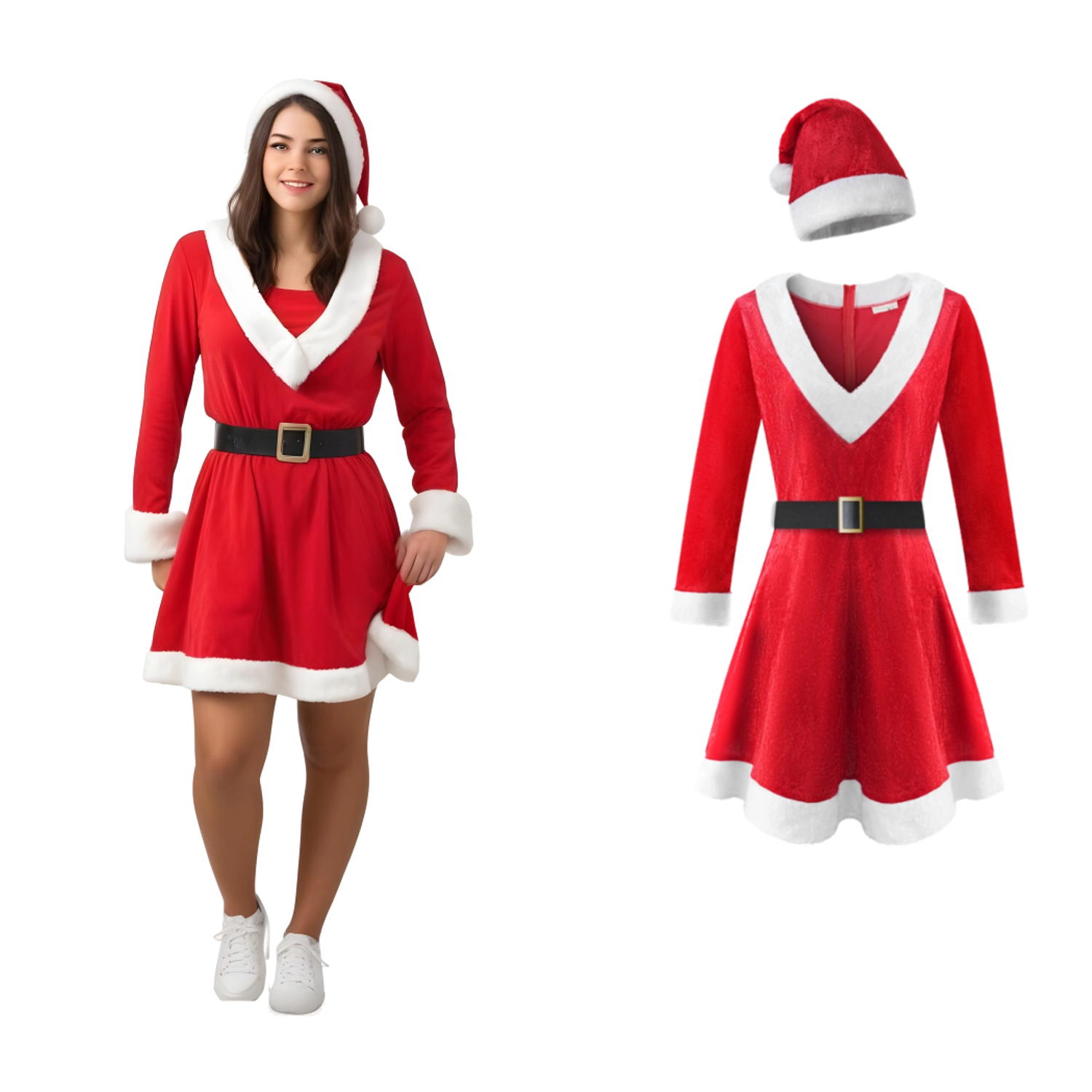 V paketu dobite obleko, Božičkovo kapo in črn pas z zaponko – usklajen videz brez dodatnega iskanja dodatkov.