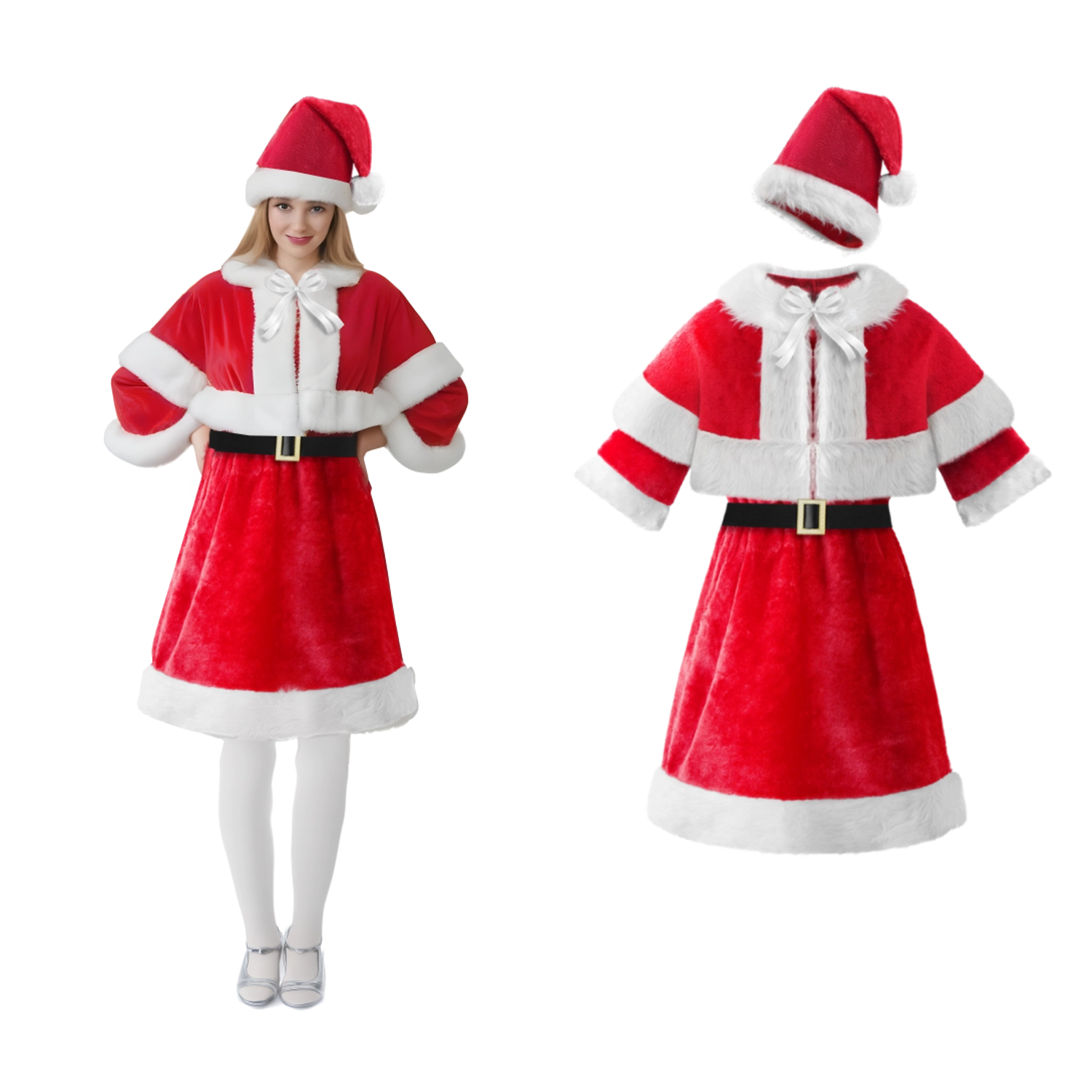 Stajliš kostum v ikonični rdeče-beli kombinaciji takoj ustvari praznično vzdušje. Mehki, plišasti robovi in izrazit črn pas dodajo videzu učinek, medtem ko poskrbi plašč za udobje v zimskih večerih. Idealno za božične dogodke, poslovne zabave, šolske predstave in tematska praznovanja.