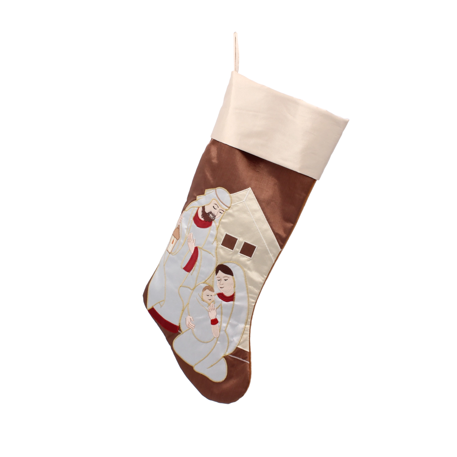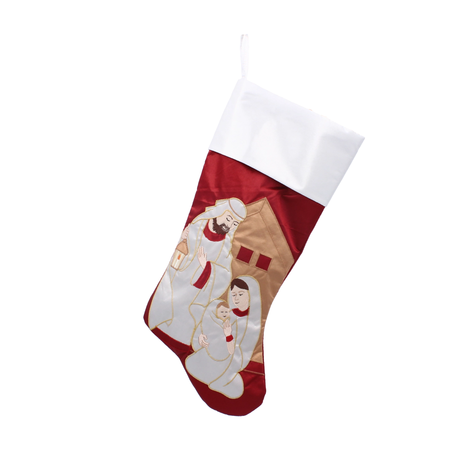 Ustvarite toplo praznično vzdušje z elegantno božično nogavico, okrašeno z motivom Svete družine v jaslicah. Natančna tekstilna izdelava, kontrastni zavih in okrasni šivi dajejo dekoraciji avtentičen videz in dolgo življenjsko dobo. Zahvaljujoč obešalni zanki jo zlahka namestite na kaminovo polico, ograjo, steno ali božično drevesce.