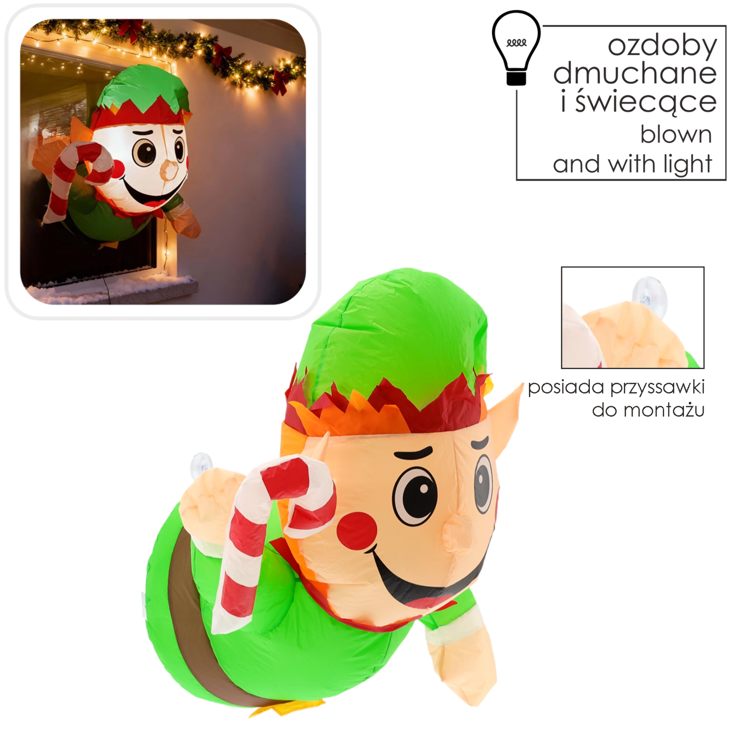 Napihljiv škrat z ljubkim nasmehom in liziko takoj pritegne poglede mimoidočih in obiskovalcev. Vgrajene LED diode zagotavljajo mehko in varčno osvetlitev, zato dekoracija odlično izstopa v večernih urah na oknu, vratih ali izložbi.