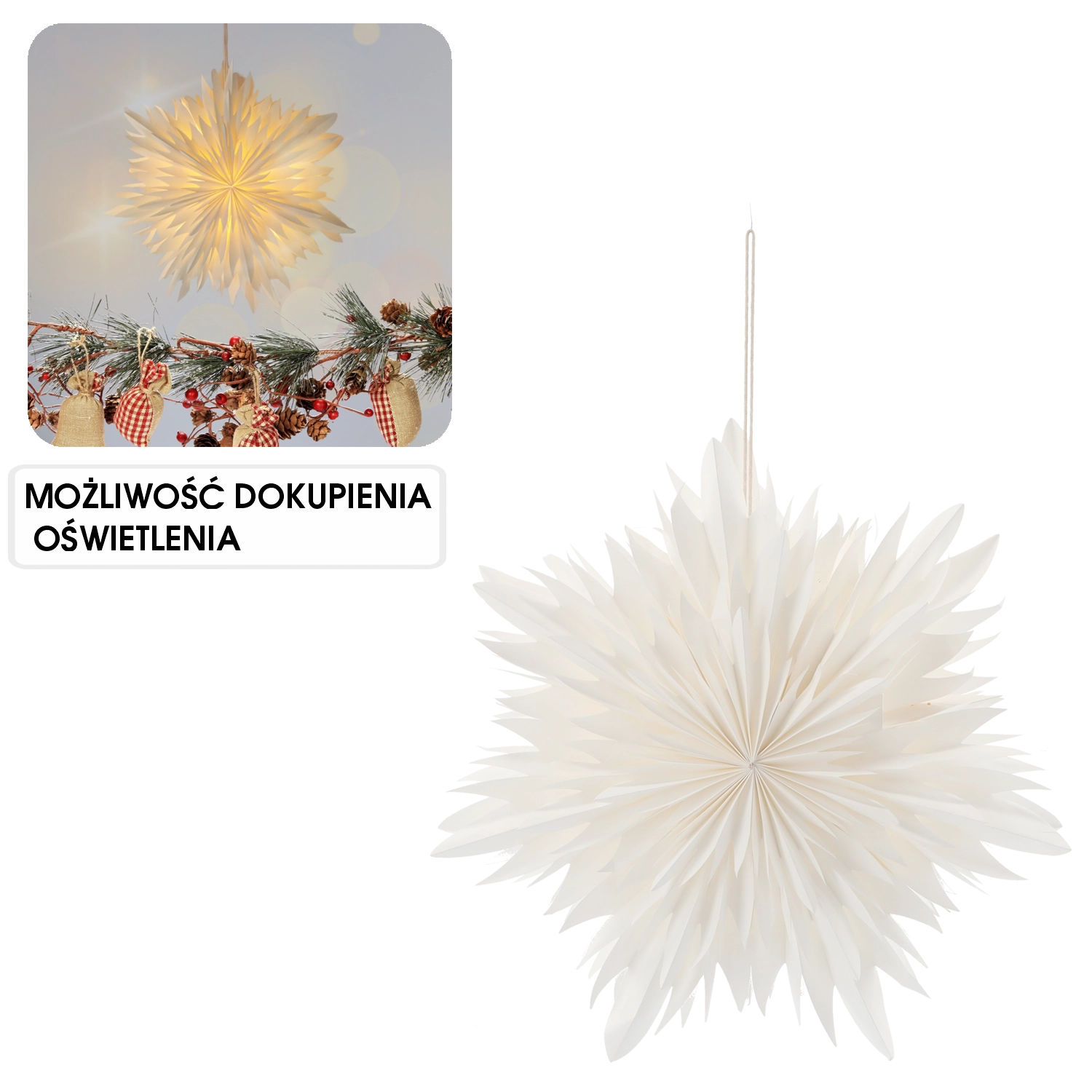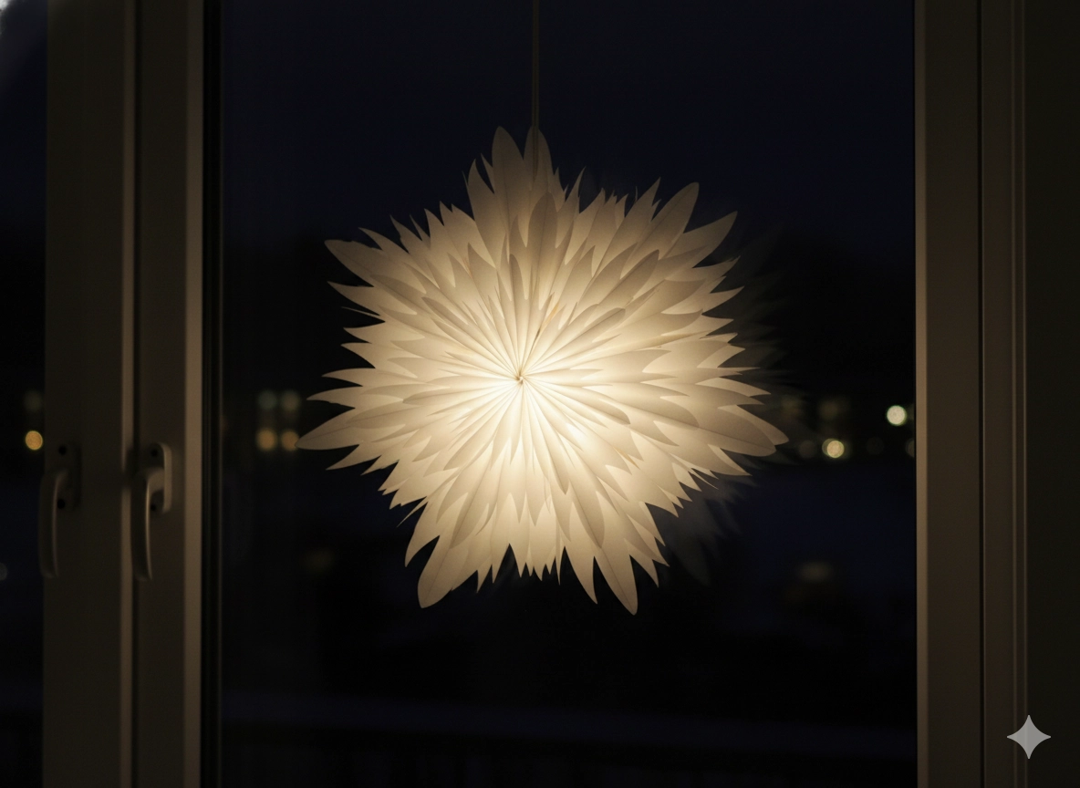 Beli papir lepo razprši toplo svetlobo in prostoru doda mehak, prazničen pridih – idealno za okna, nad mizo ali v dnevno sobo.