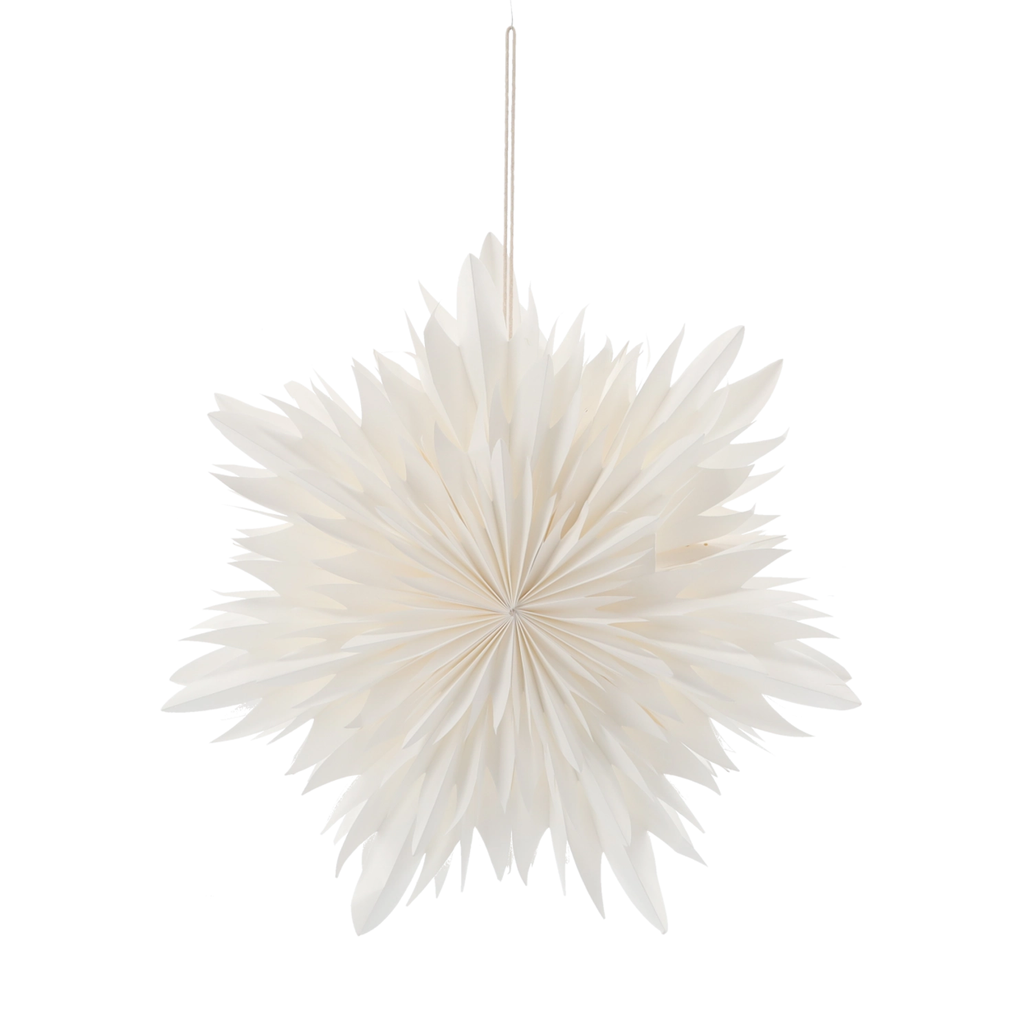 Odkrijte čisto eleganco v obliki bele papirnate zvezde, ki takoj ustvari prijeten občutek v vsakem prostoru. Lahek papir s premišljeno zloženimi plastmi ustvari izrazit 3D učinek in lepo odbija svetlobo. Idealna za obešanje na okno, nad mizo ali v izložbo.
