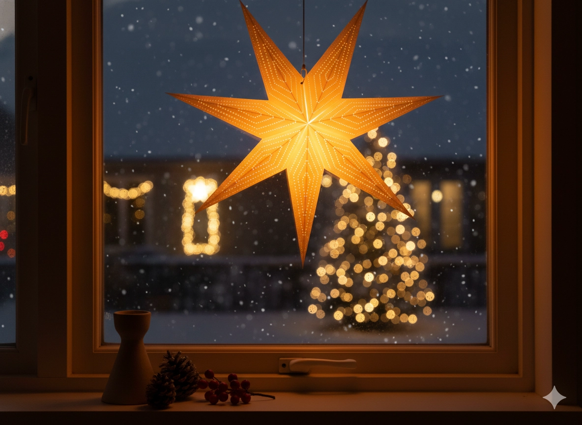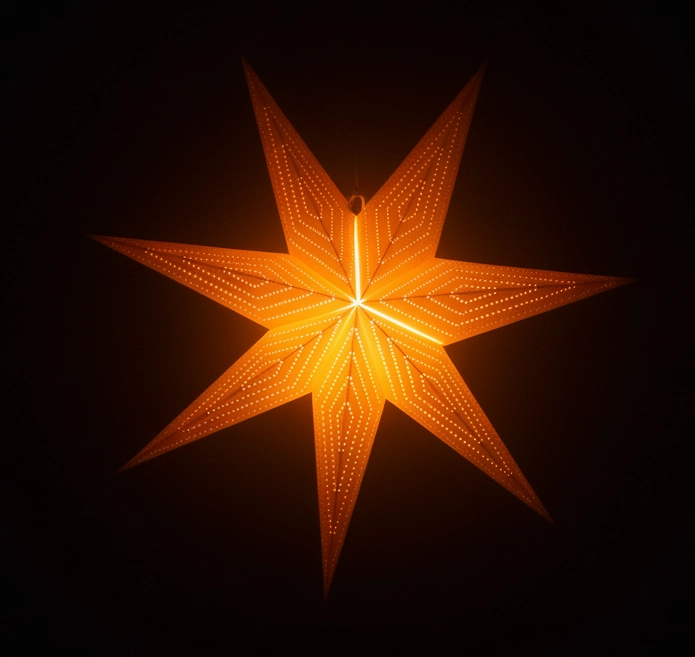 Ta zlata papirnata zvezda izstopa z elegantnim sedemkrakim dizajnom in nežno perforacijo, ki svetlobo spremeni v očarljivo igro senc. Odlično se poda tako v klasične kot moderne interierje, kjer postane izrazit dekorativni element med božičem in v zimski sezoni.