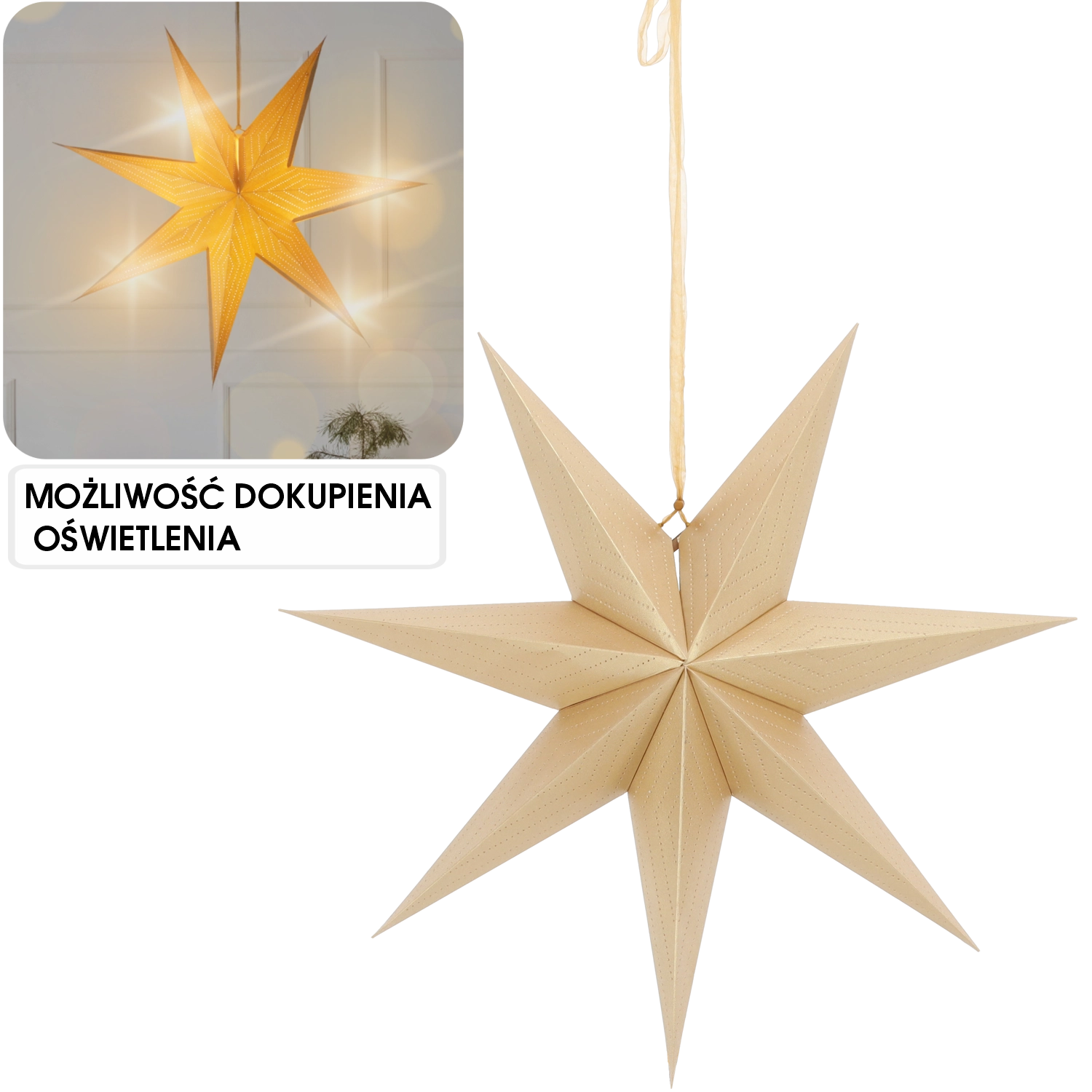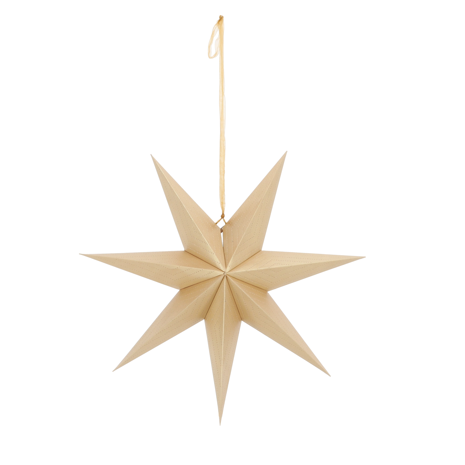 Elegantna dekorativna zvezda s premerom 60 cm v razkošni zlati barvi bo vašemu domu pričarala praznično vzdušje. Sedemkraki oblikovni motiv in nežen perforiran vzorec ustvarjata izrazite svetlobne učinke, zlasti ob viru svetlobe. Je lahko obesljiva, zložljiva in izdelana iz FSC certificiranega papirja – lepa in okolju prijazna izbira za okno, steno ali nad mizo.