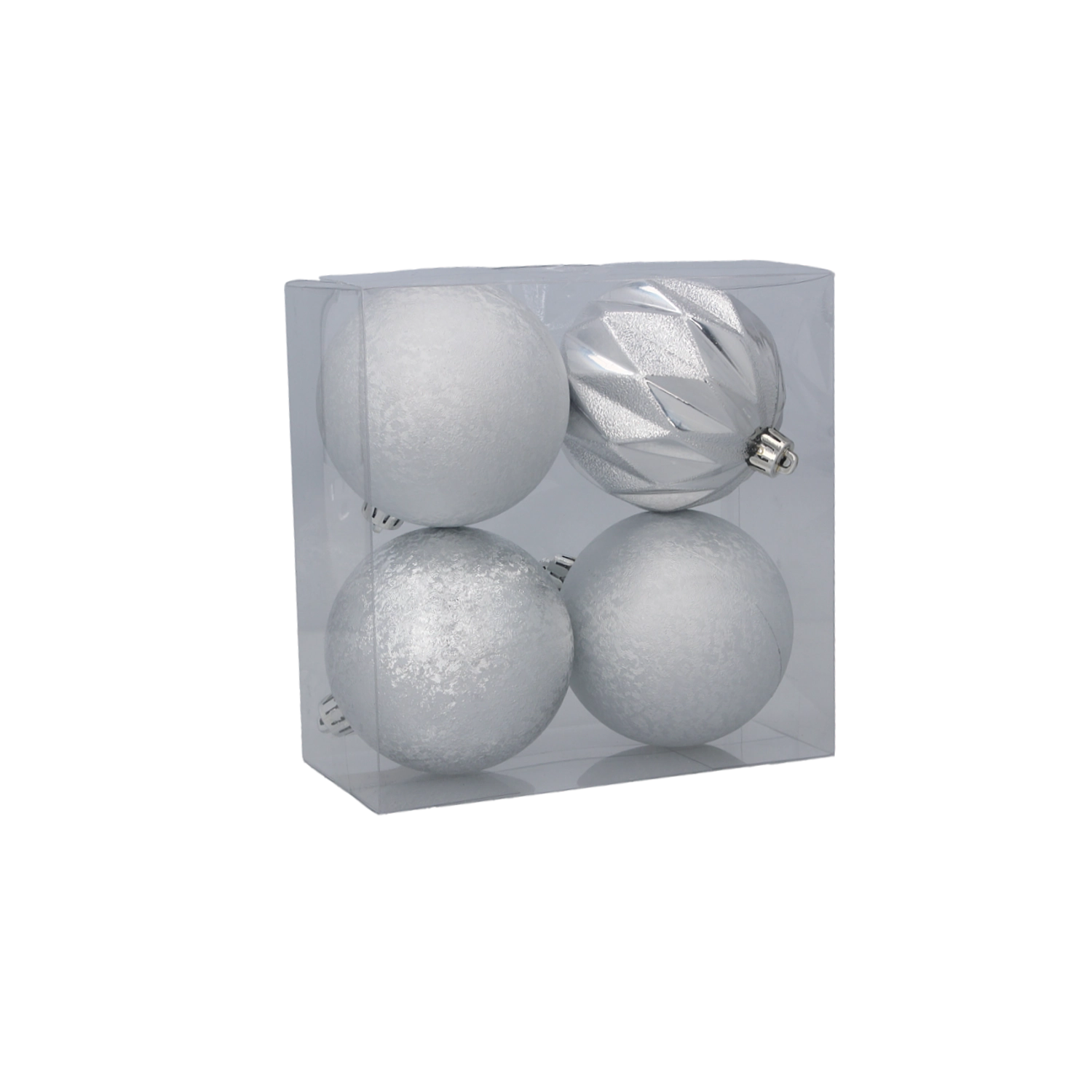Polepšajte svoj božični drevesec s stilskim setom štirih božičnih krogel premera 8 cm v rdeči, zlati in srebrni barvi. Trpežni plastični okraski z različnimi vzorci v dom vnesejo tradicionalno praznično vzdušje, zlahka se kombinirajo z drugo dekoracijo in so zaradi svoje velikosti opazni, a ne delujejo masivno.