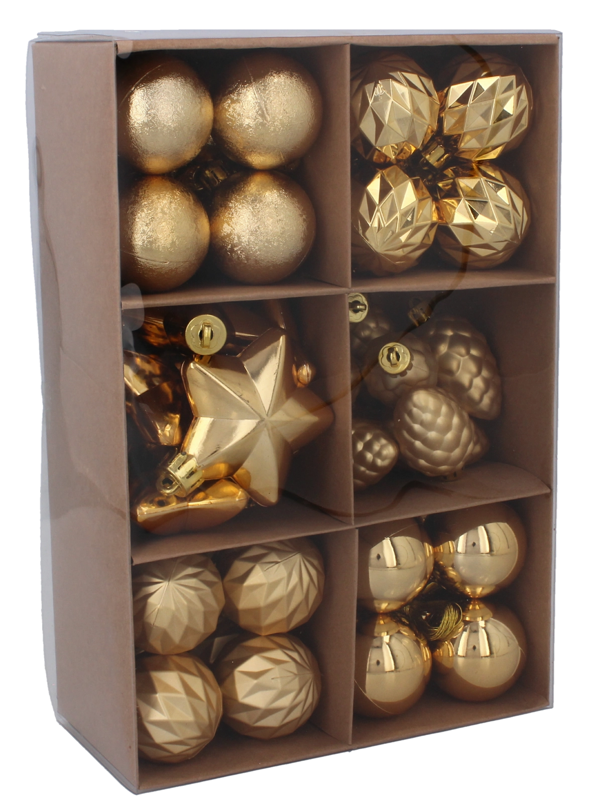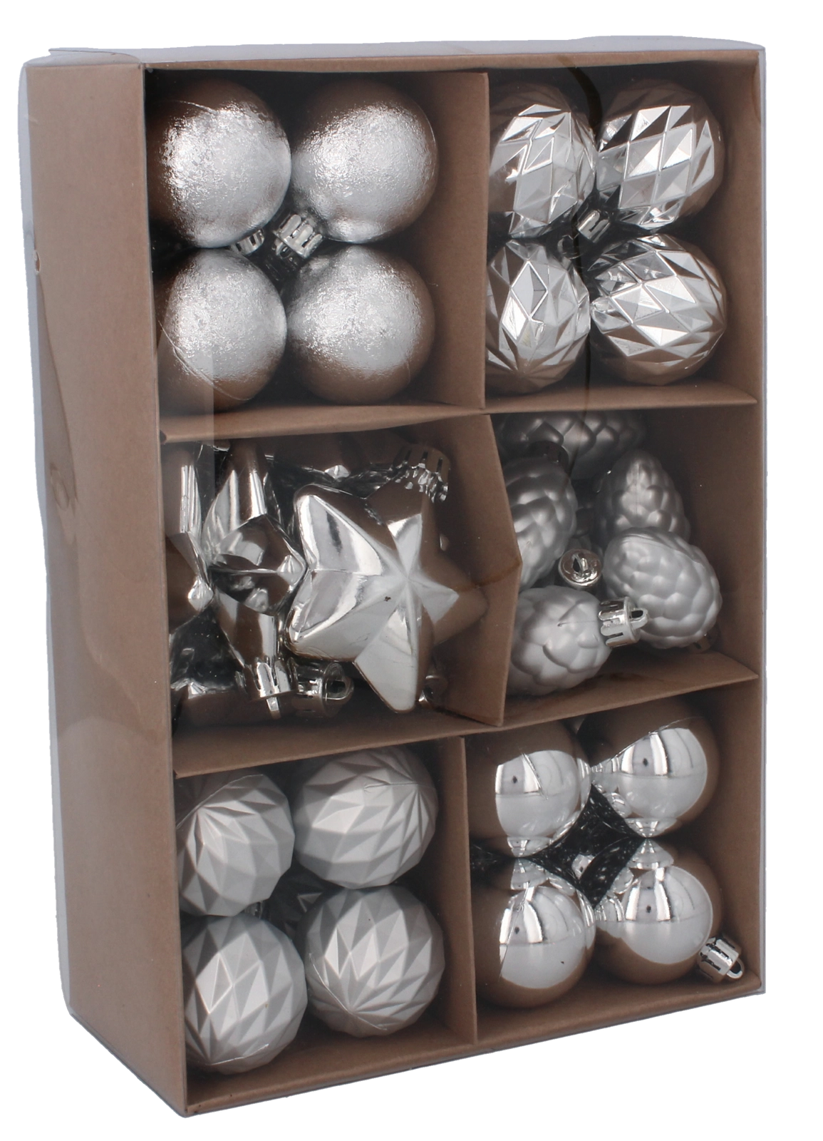 Krogle, zvezde in storži v bleščeči, mat in fasetirani izvedbi dodajo drevesu dinamiko in čudovito odbijajo svetlobo.