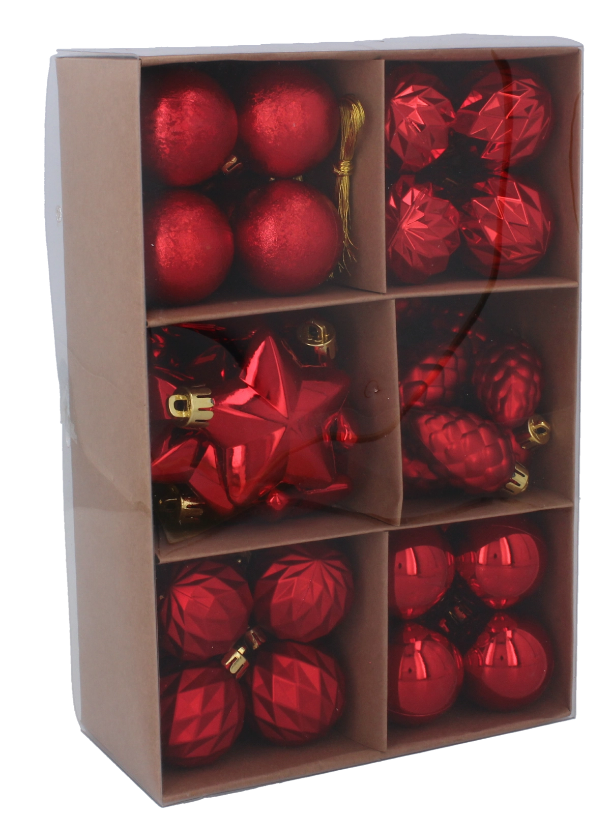 Ta bogat komplet prinaša skrbno izbrane oblike in površinske obdelave – od gladkih in visoko bleščečih krogel do fasetiranih in strukturiranih okraskov, zvezd in storžev. Zaradi premišljenega prepleta rdeče, zlate in srebrne boste okrasitev zlahka uskladili z ostalimi dekoracijami ter ustvarili brezčasno praznično vzdušje.