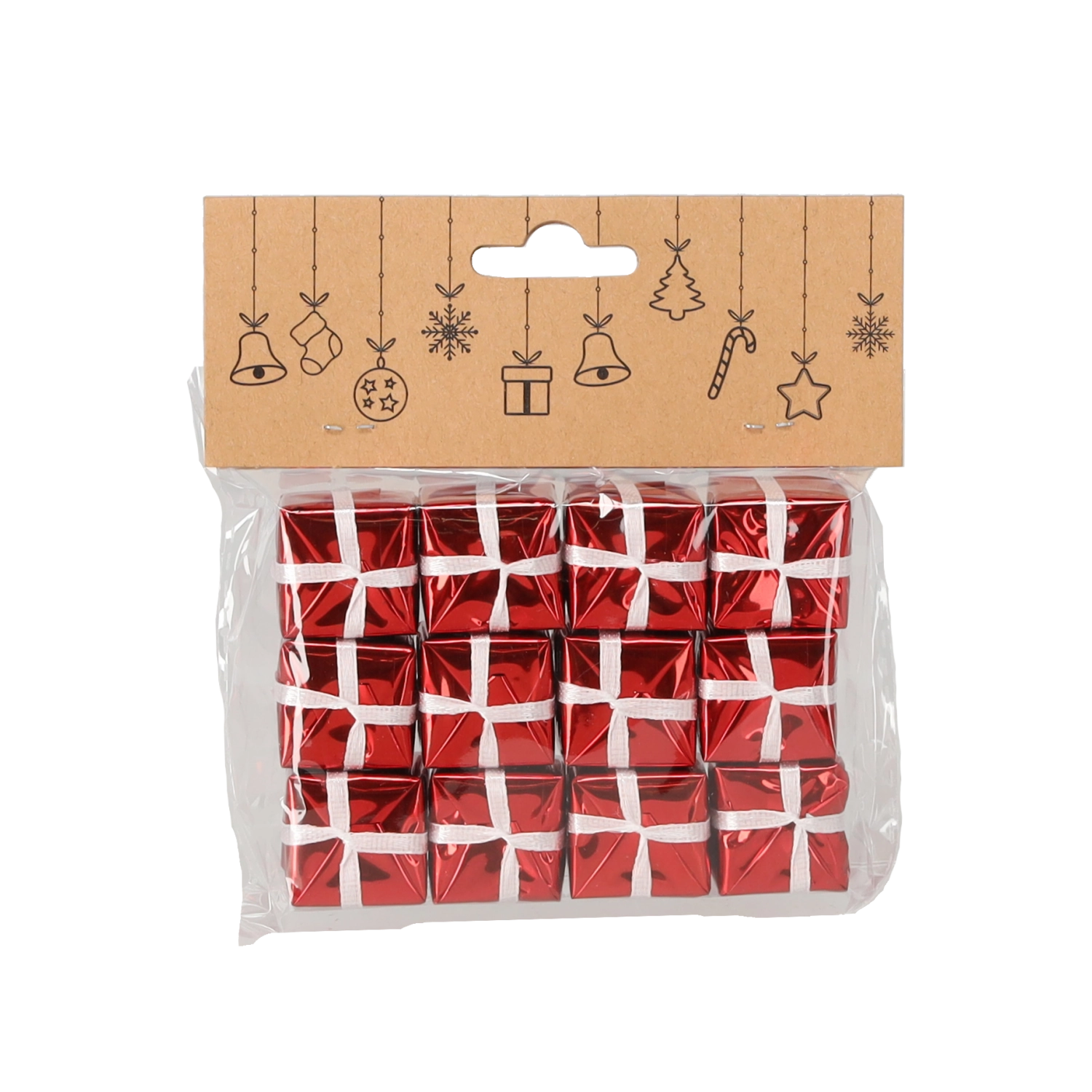 Eleganten komplet 12 mini okraskov v obliki daril prinaša nežen lesk in vizualno pestrost v vsako božično dekoracijo. Zaradi kompaktne velikosti 2,5 cm in lahke konstrukcije so idealni za veje drevesa, svetlobne verige, girlande, namizne aranžmaje ali za okrasitev daril.