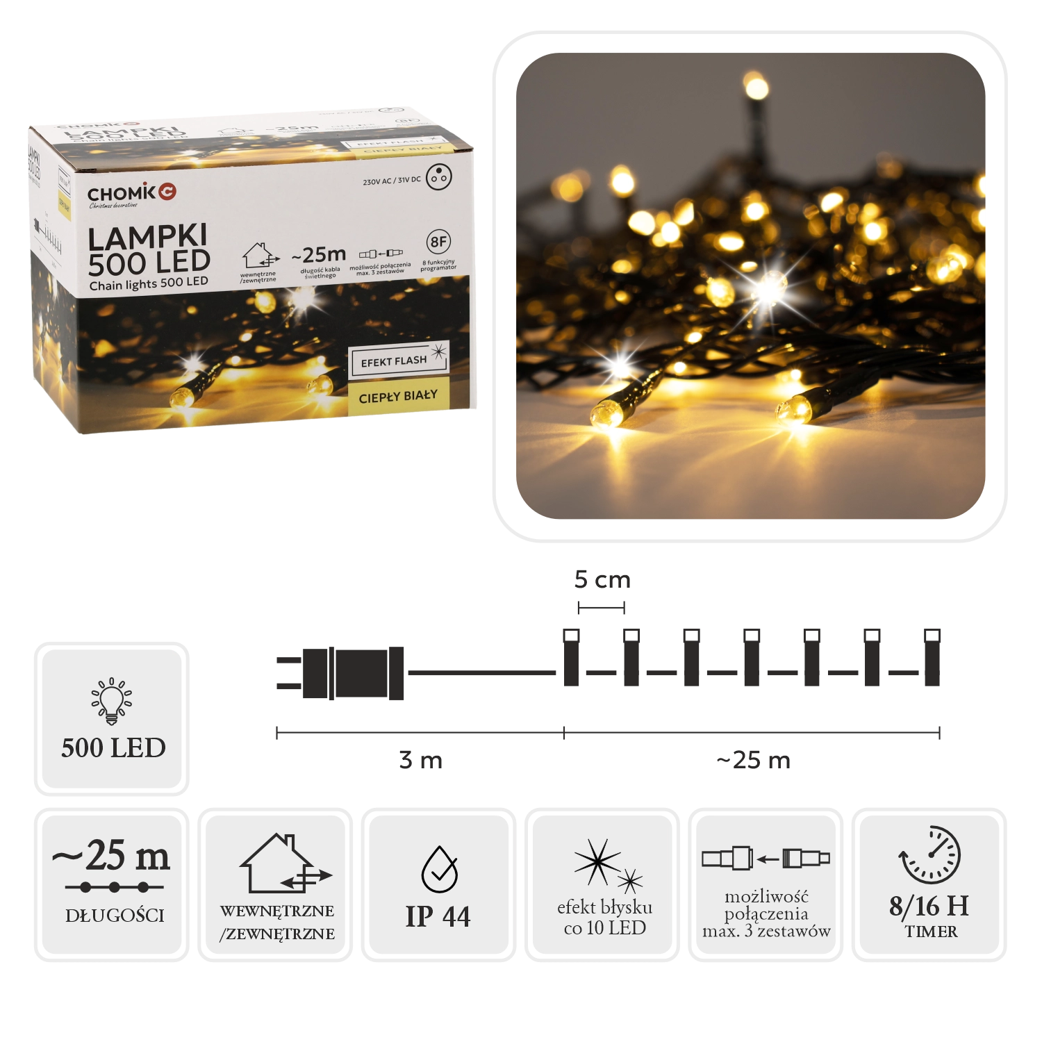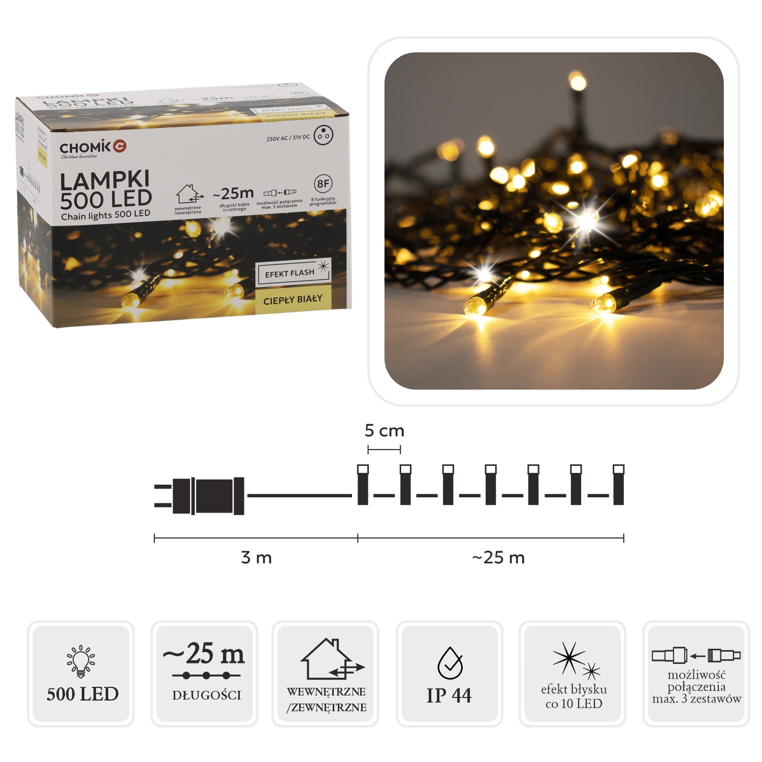 Osvetlite svoj dom in vrt z 28-metrsko LED verigo z 500 LED, ki sveti v toplo beli in dodaja učinek hladnega »flash« bliska. Zahvaljujoč IP44, programatorju s pomnilnikom in časovniku 8/16 h ter možnosti povezave do 3 verig je namestitev enostavna, rezultat pa impresiven.