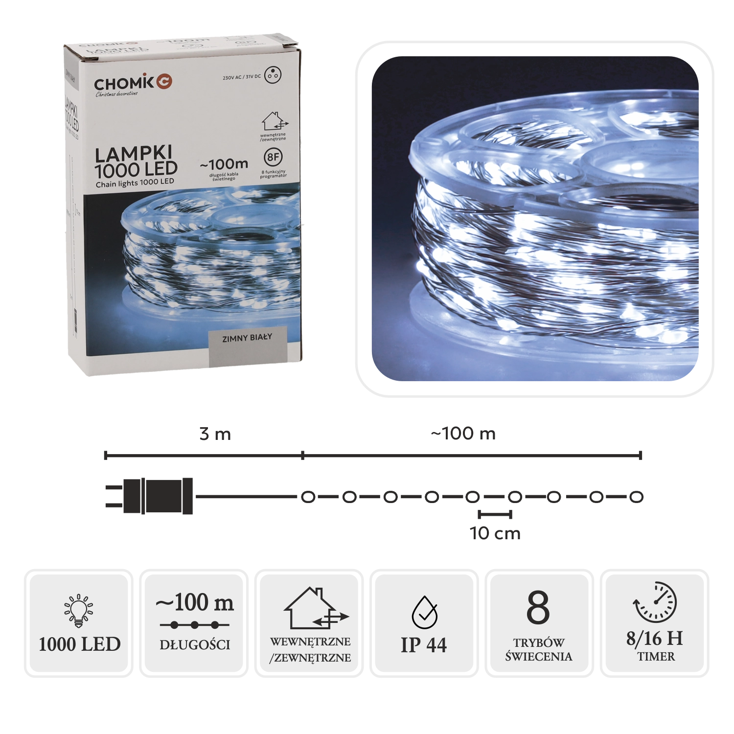 Izjemno dolga LED veriga na kolutu prinaša opazen svetlobni učinek po celotni dolžini 100 metrov. Gosta razporeditev diod na 10 cm ustvari neprekinjeno, jasno in enakomerno osvetlitev v hladno belem odtenku. Zaradi zaščite IP44 je primerna za notranjo in zunanjo uporabo, srebrna, neopazna žica pa se zlahka vključi v vsako dekoracijo.