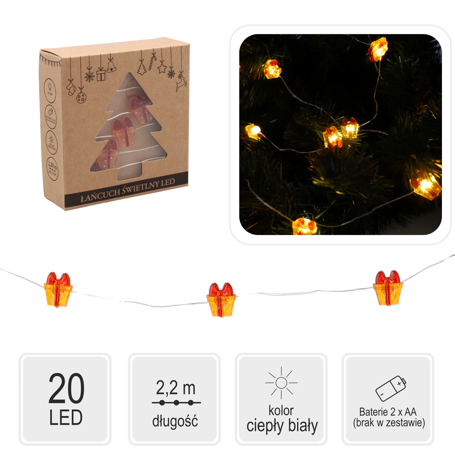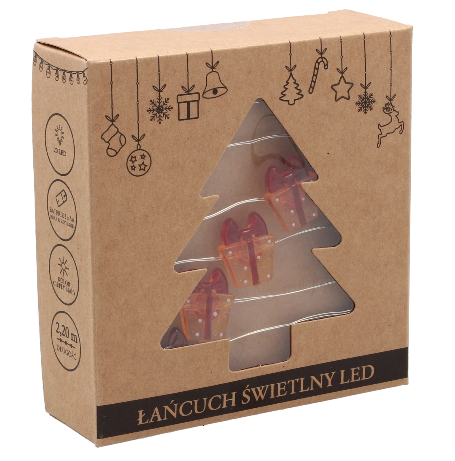 Vnesite v dom praznično vzdušje s svetlobno verigo z motivom daril. 20 toplih belih LED ustvari prijetno ambientalno svetlobo, napajanje na baterije omogoča okrasitev kjerkoli – na drevescu, oknu, polici ali v venčku.