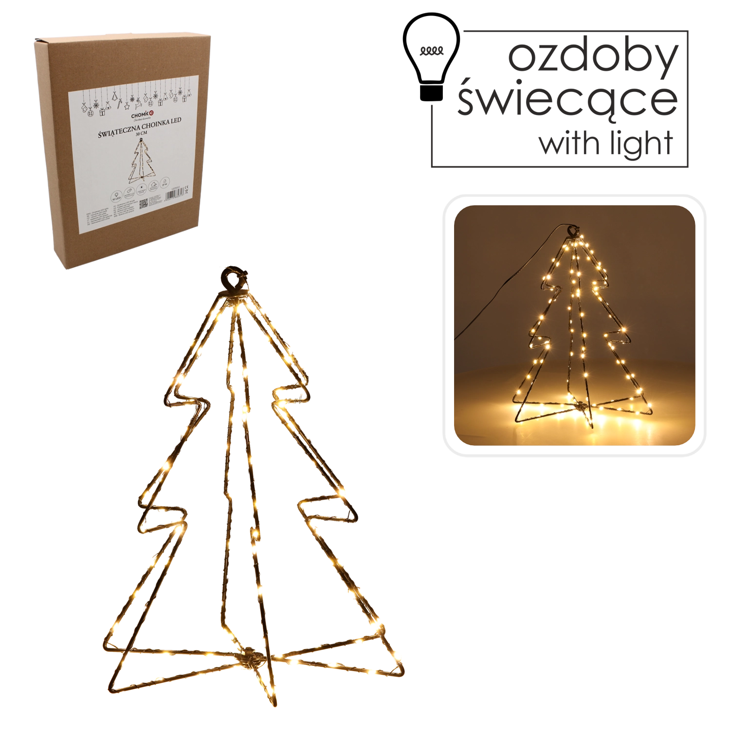 Minimalistično žičnato drevesce z vgrajenimi mikro LED osvetli dom s prijetnim toplim odtenkom. 95 enakomerno razporejenih diod ustvari domačno vzdušje in dopolni praznično okrasitev brez zapletene namestitve. Stabilen podstavek in subtilna silhueta se podata tako sodobnim kot klasičnim interierjem.