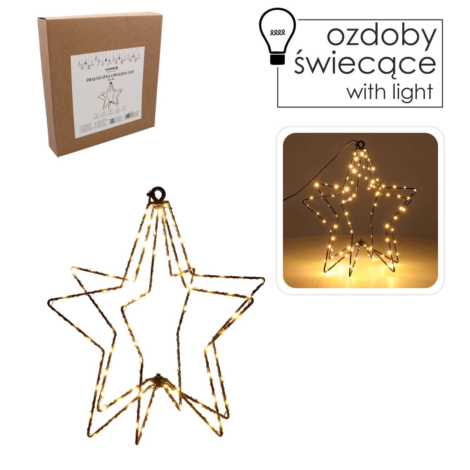 V dom vnesti božični čar z elegantno LED zvezdo s premerom 30 cm. Zahvaljujoč 95 LED diodam ustvarja mehko toplo belo svetlobo, ki pričara prijetno praznično vzdušje. Baterijsko napajanje zagotavlja svobodo postavitve brez kablov, zato lahko zvezdo preprosto obesite na okno, steno ali jo uporabite kot stilizirano namizno dekoracijo.