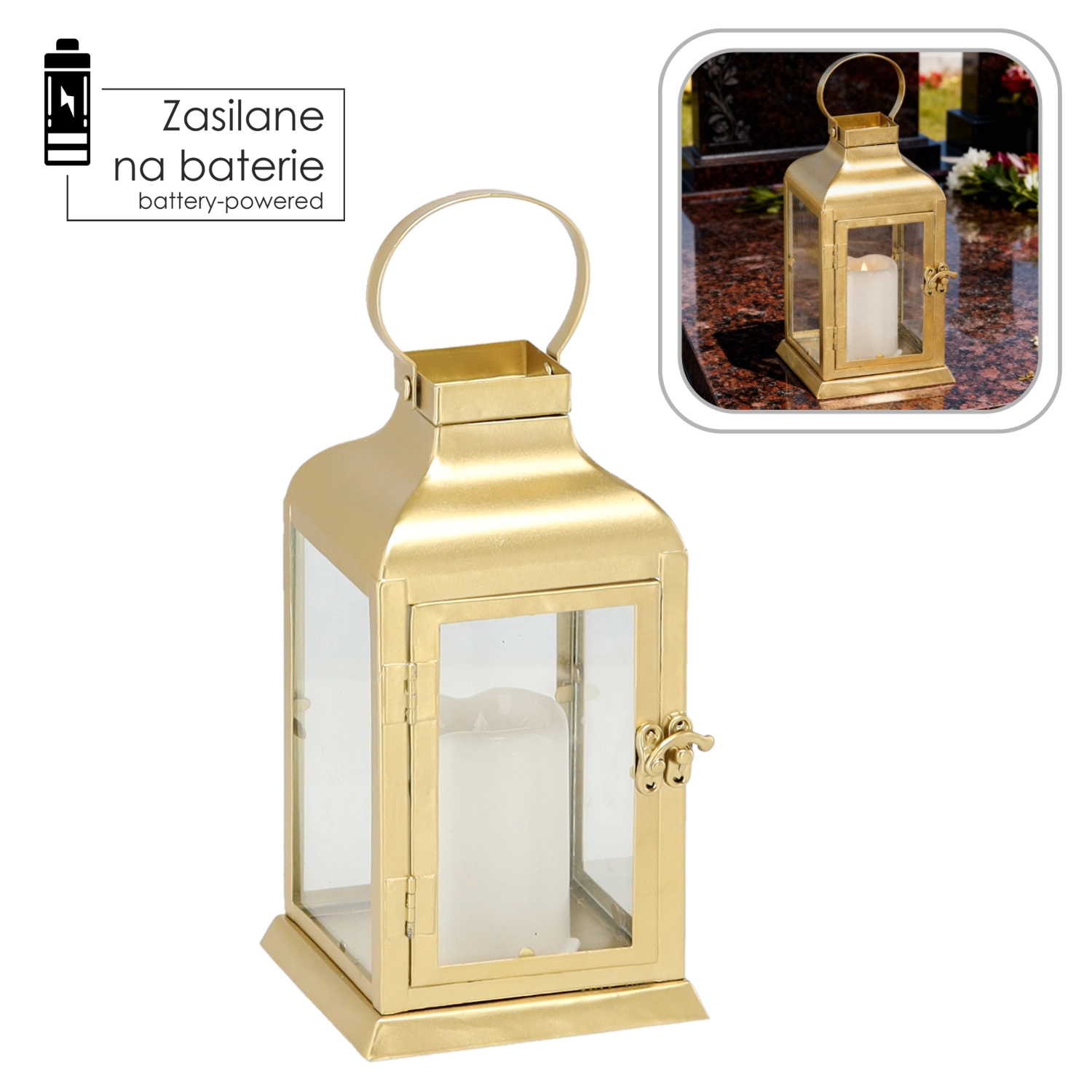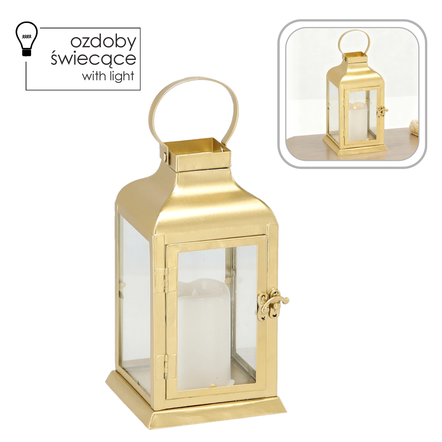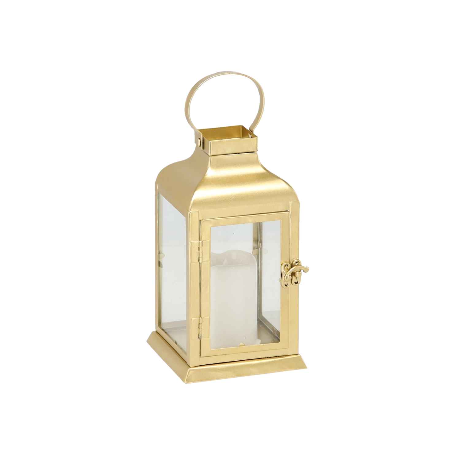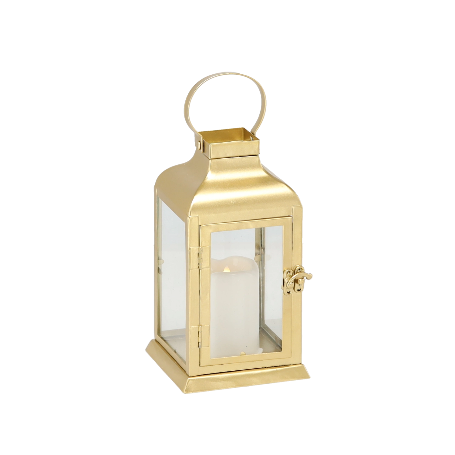 Elegantna zlata lanternica združuje brezčasen kovinski okvir z jasnimi steklenimi paneli in varno LED »svečko«. Ponuja toplo, migetajočo svetlobo brez tveganja odprtega plamena – popolna za dnevno sobo, hodnik, balkon ali slavnostno mizo.